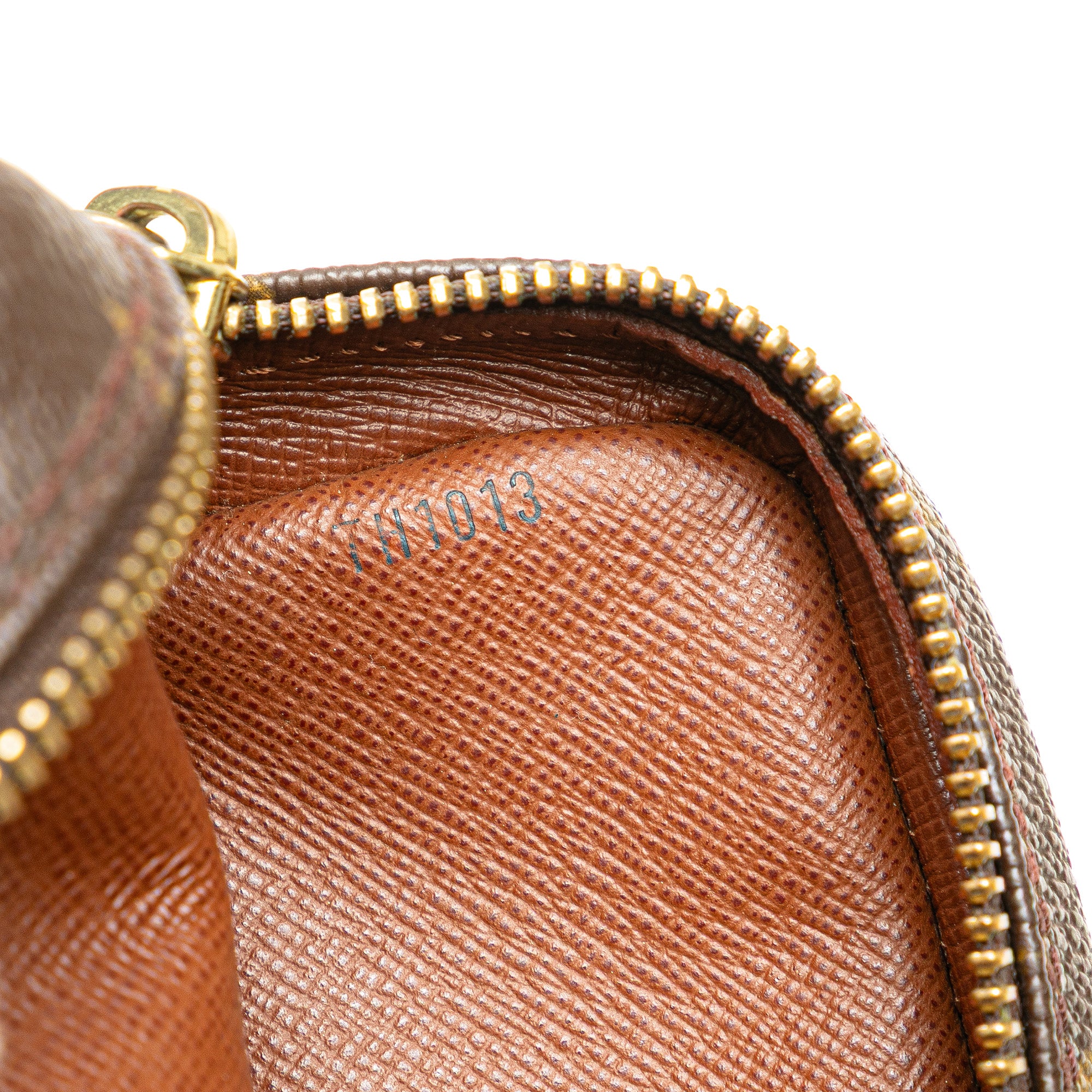 Product Details: Brown Louis Vuitton Monogram Amazone Crossbody Bag. The Amazone features a monogram canvas body with vachetta leather trim, an adjustable shoulder strap, a top zip closure, a front exterior zip pocket, and an interior slip pocket. 7.9" L x 5.9" W x 3.5" D. Serial number TH1013.