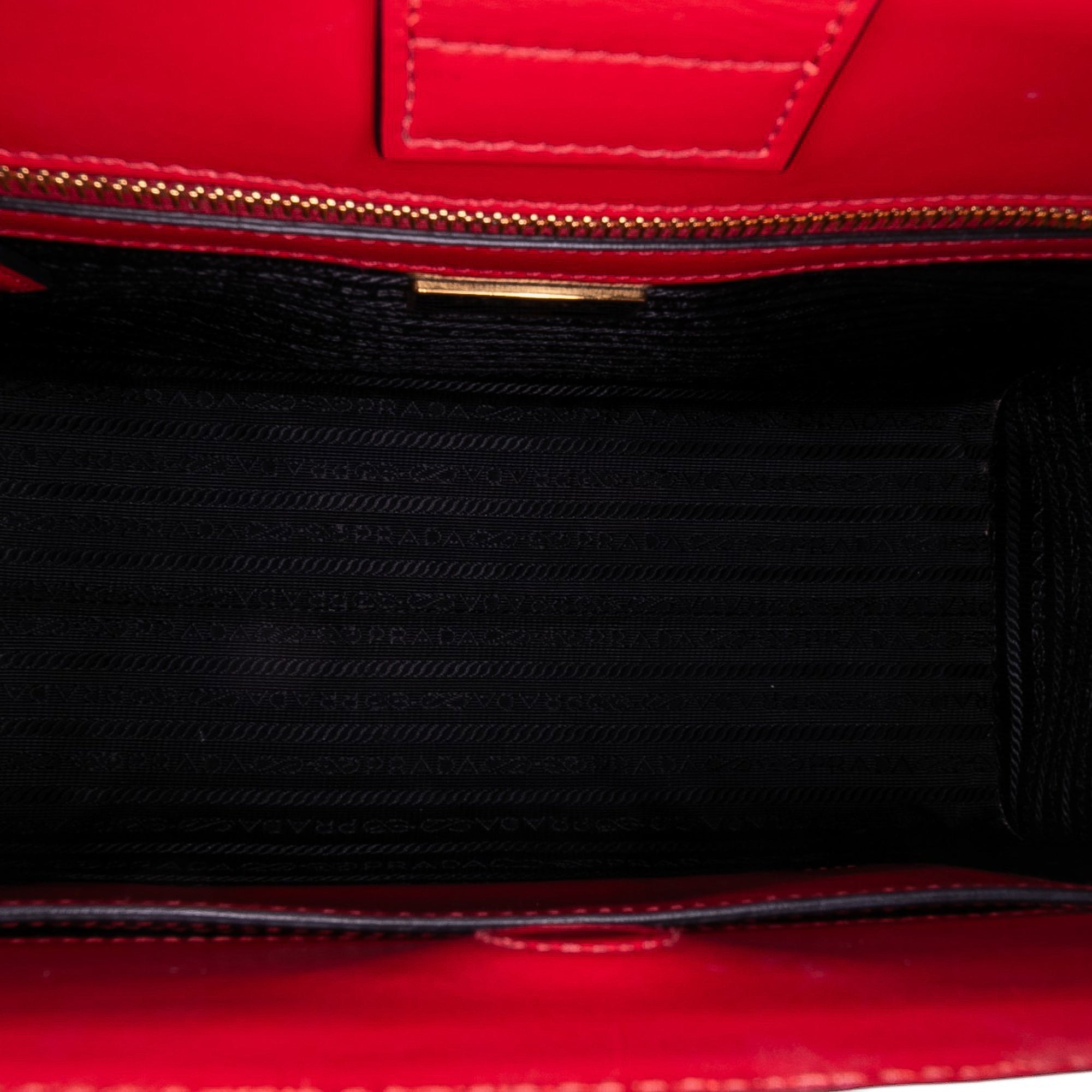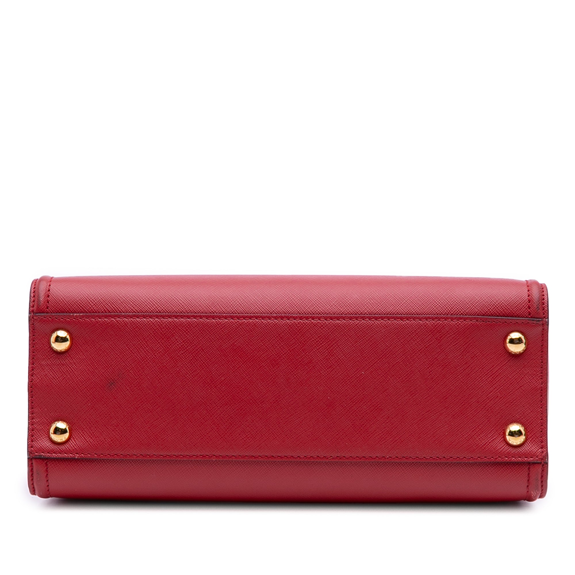 Product Details: Red Prada Soft Calf Trimmed Saffiano Convertible Tote Satchel. This satchel features a saffiano leather body with soft calfskin leather trim, rolled leather handles, a detachable flat leather strap, a top strap with snap button closure, and interior zip and slip pockets. Exterior back, side, and handles has been repainted. 10.2" L x 12" W x 5.1" D, 5.9" drop.
