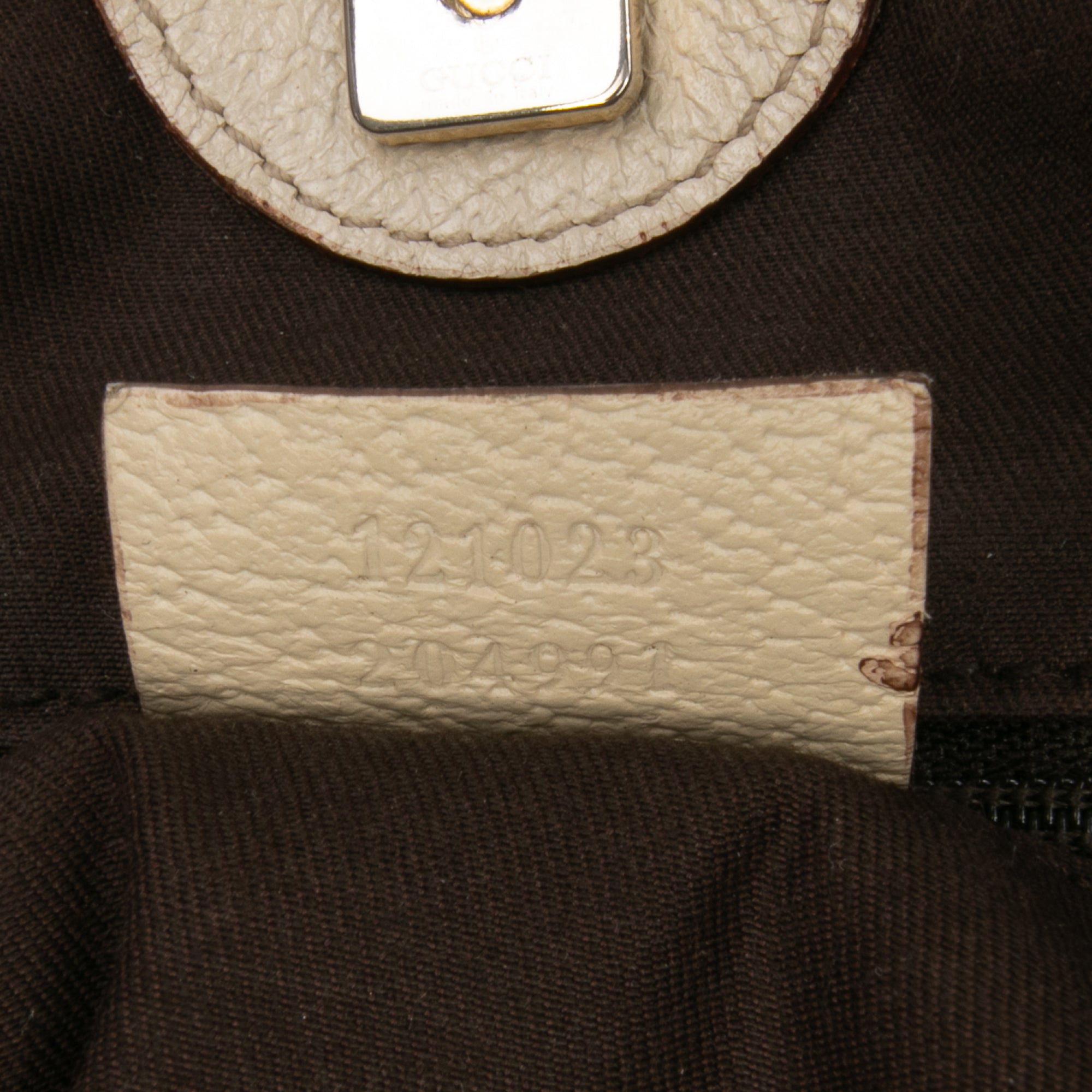 Product Details: Brown Gucci GG Canvas Eclipse Shoulder Bag. This shoulder bag features a canvas body with leather trim, flat leather straps, an open top with a magnetic closure, an exterior front slip pocket, and interior zip and slip pockets. 9.4" L x 15.4" W x 2.8" D, 7.1" drop. Serial number 121023 204991.