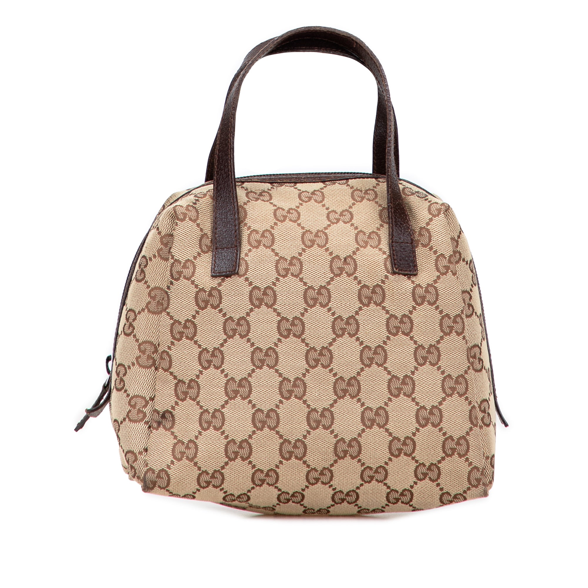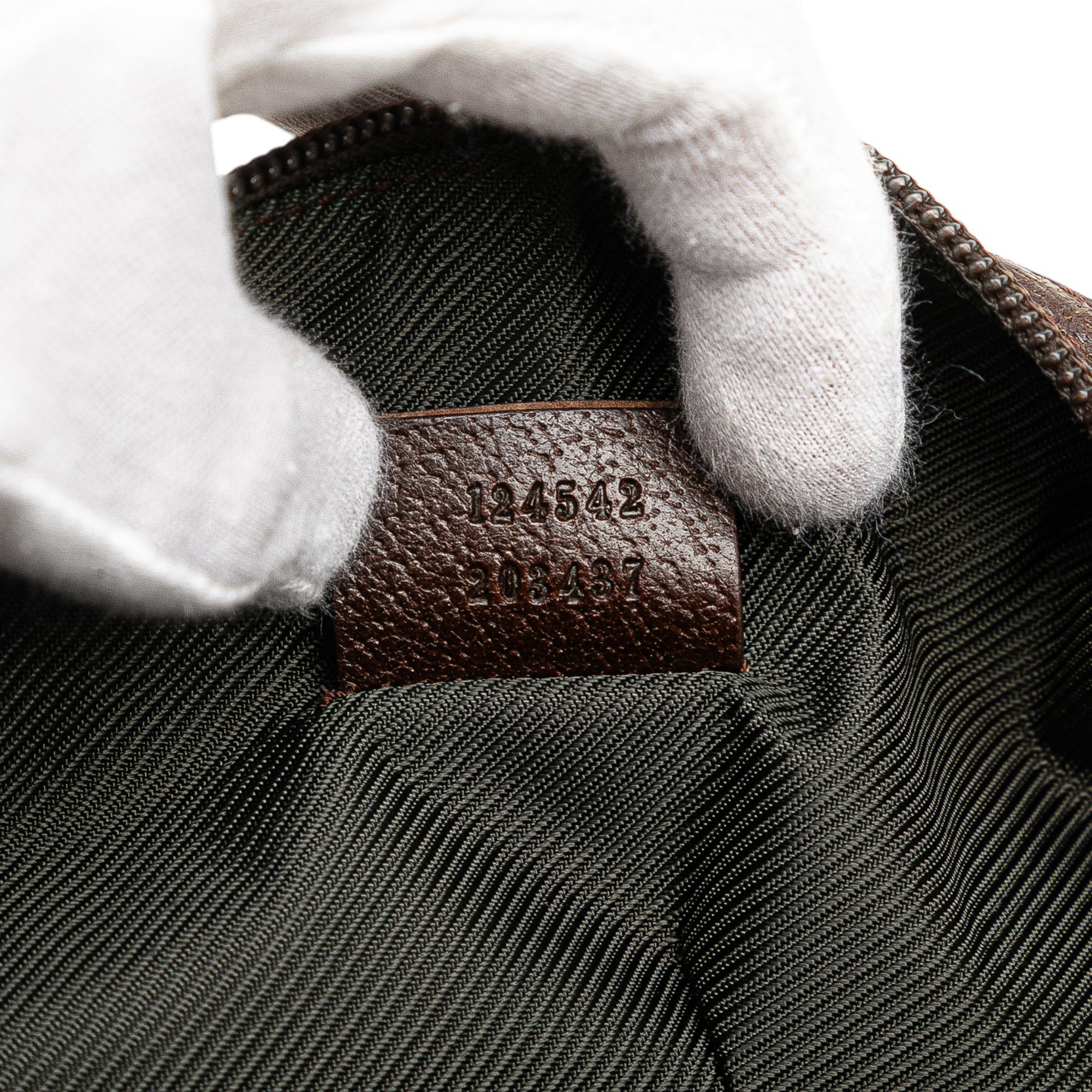 Product Details: Brown Gucci Mini GG Canvas Balthus Tofu Bag. This handbag features a canvas body with leather trim, flat leather handles, and a zip around closure. 7.1" L x 7.1" W x 4.3" D, 3.5" drop. Serial number 124542 203437.