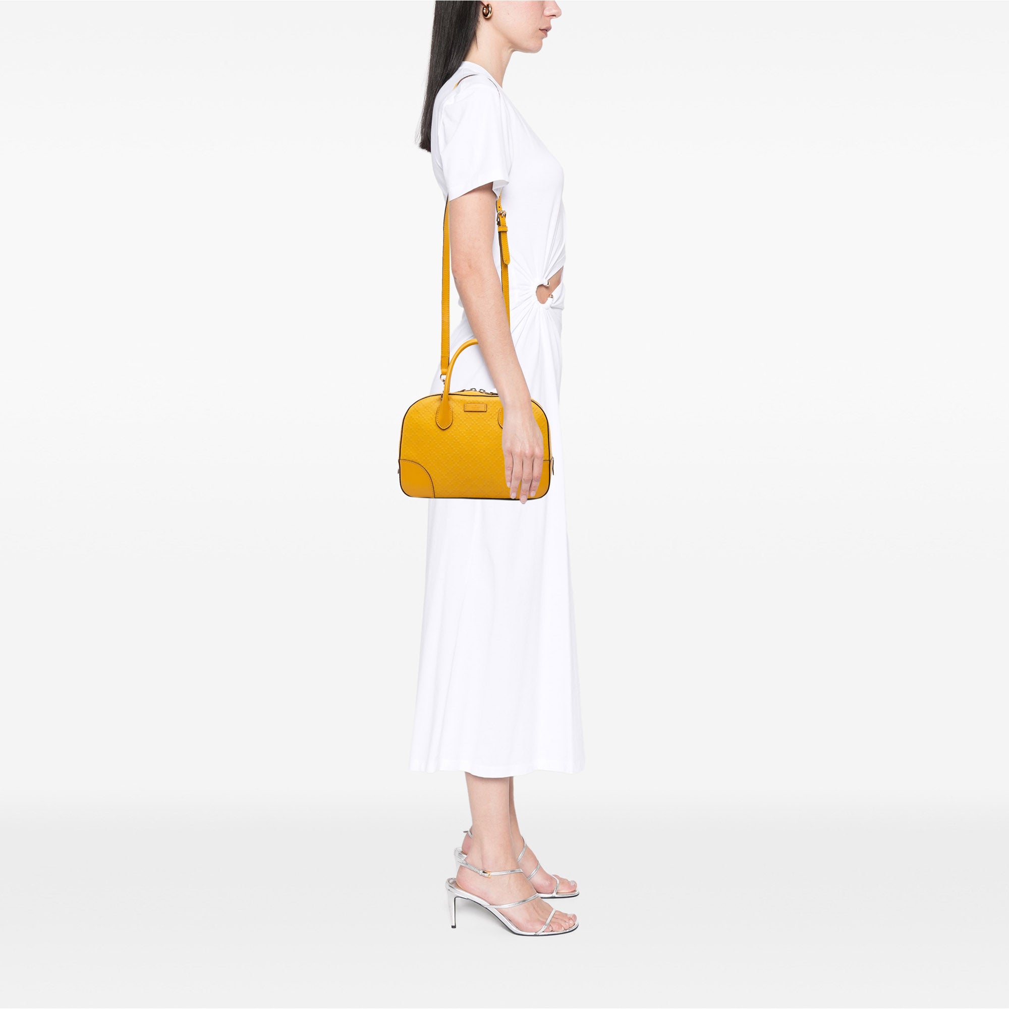 Product Details: Yellow Gucci Diamante Bright Leather Satchel. The Bright satchel features an embossed leather body, rolled leather handles, a detachable flat leather shoulder strap, a top zip closure, and interior zip and slip pockets. 7.3" L x 10.4" W x 4.3" D, 3.9" drop. Serial number 354224 520981.