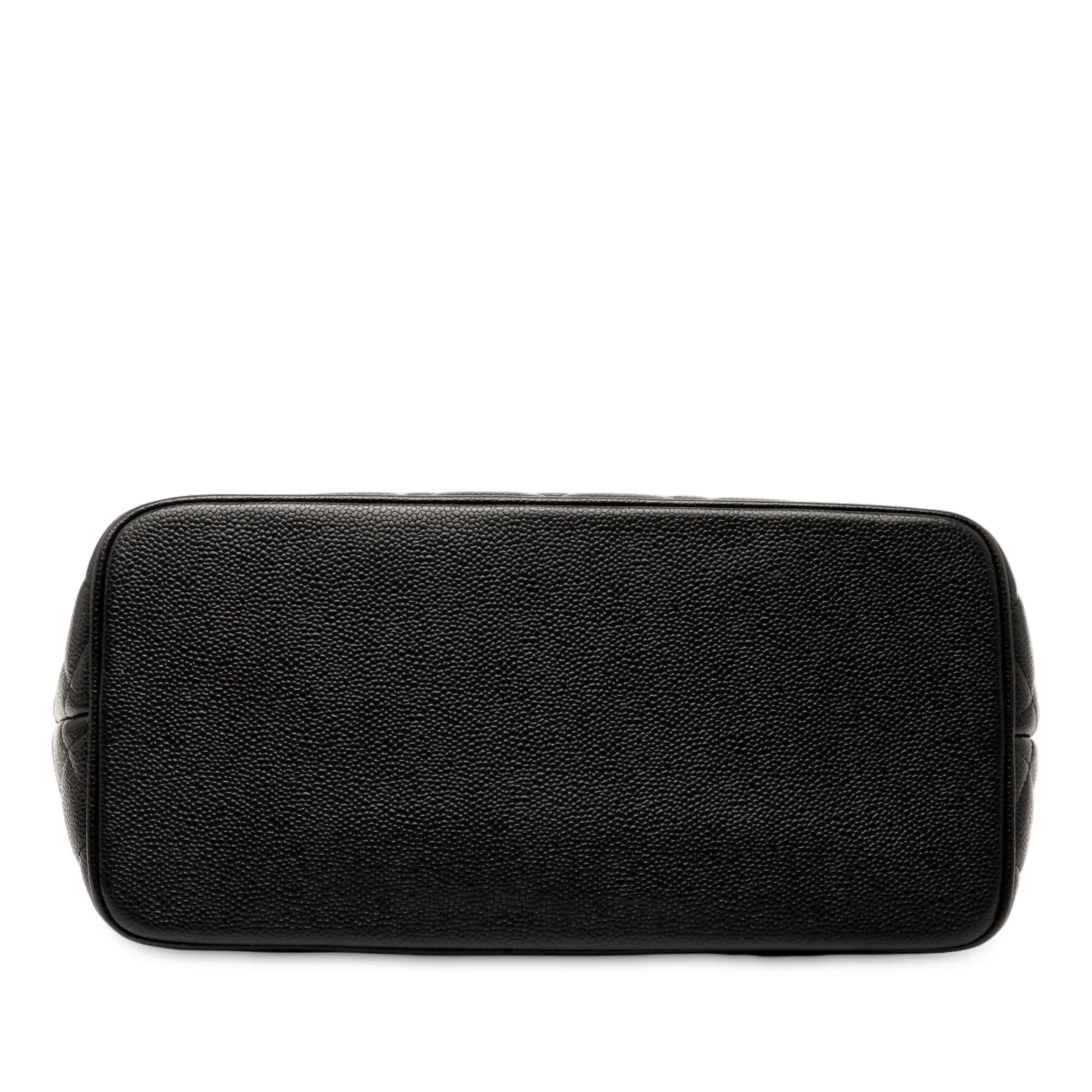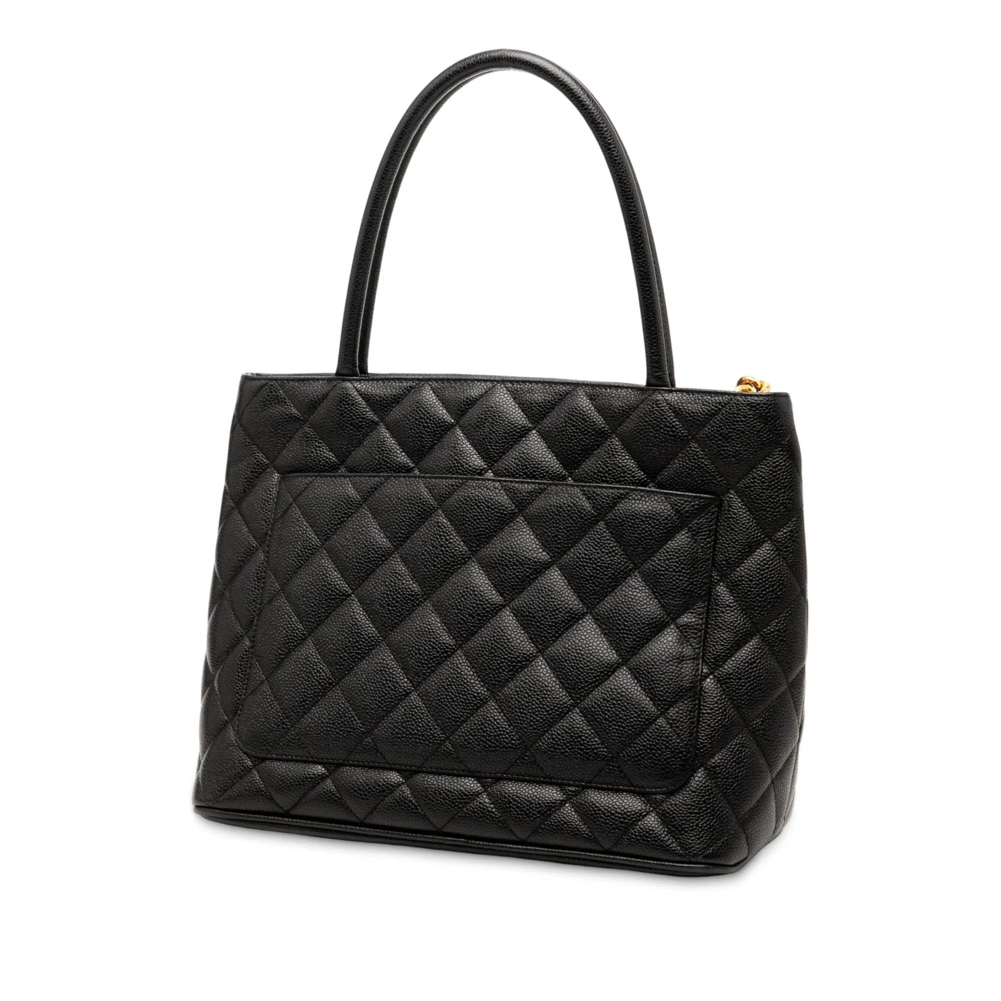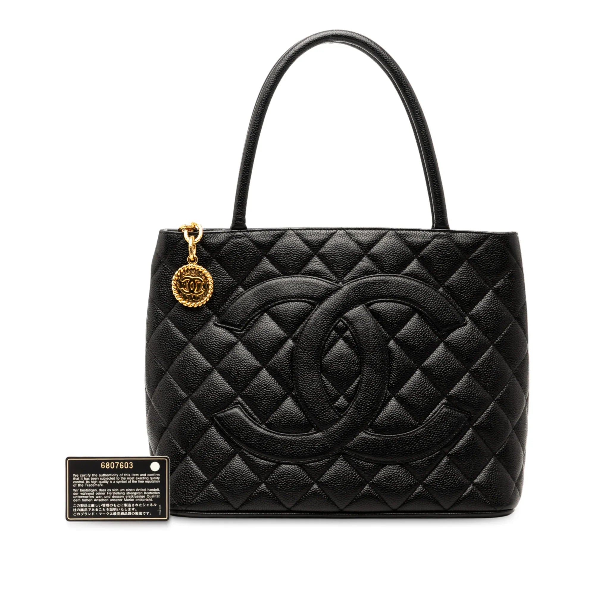 Product Details: Black Chanel Caviar Medallion Tote. The Medallion tote bag features a quilted caviar leather body, rolled leather handles, a top zip closure, an exterior back slip pocket, and interior zip and slip pockets. 9.8" L x 11.6" W x 5.5" D, 6.1" drop. Serial number 6807603.