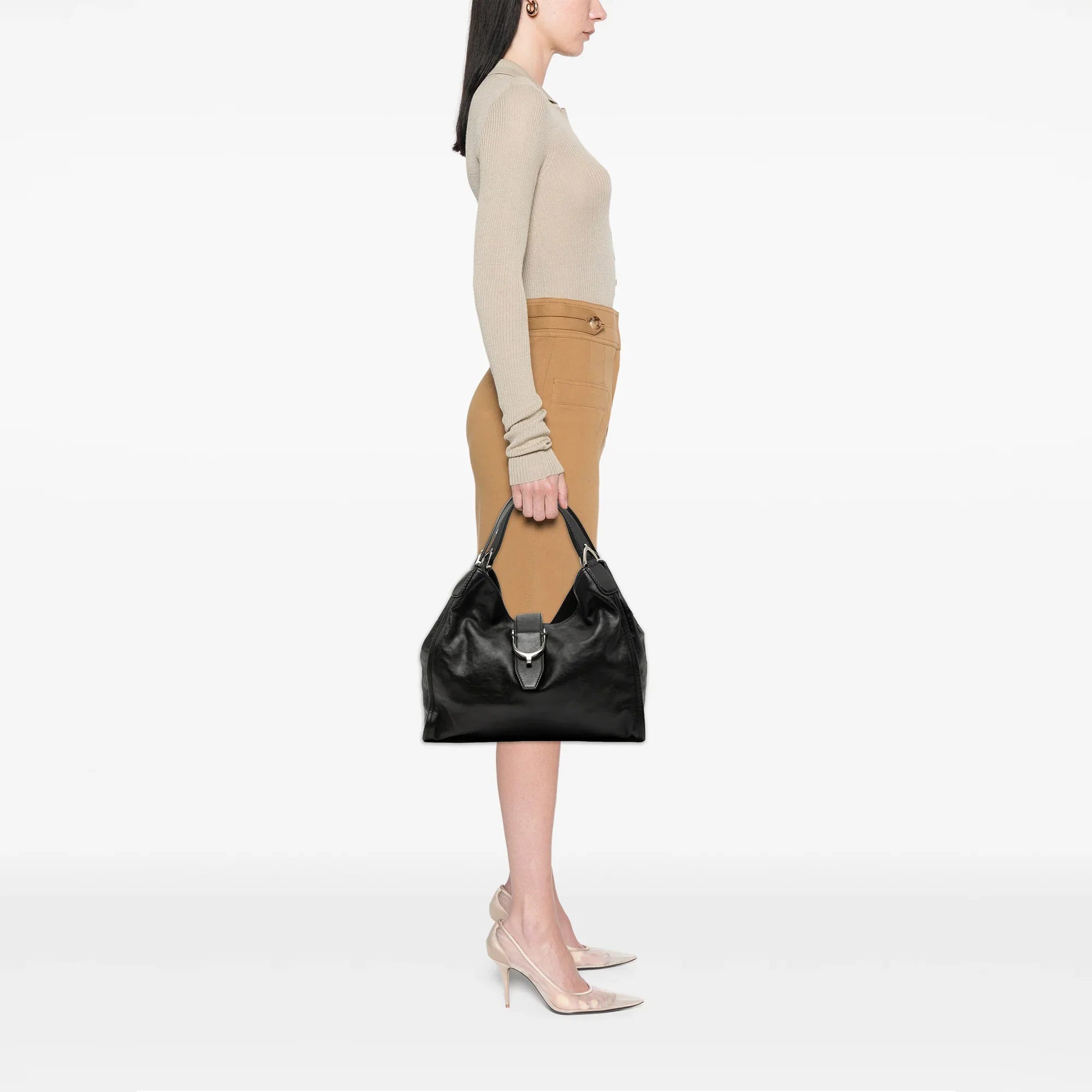 Product Details: Black Gucci Nubuck Soft Stirrup Tote. The Stirrup tote bag features a nubuck leather body, flat leather straps, a front strap with buckle details, an open top, and interior zip and slip pockets. 10.6" L x 14" W x 5.5" D, 7.1" drop. Serial number 296356 486628.