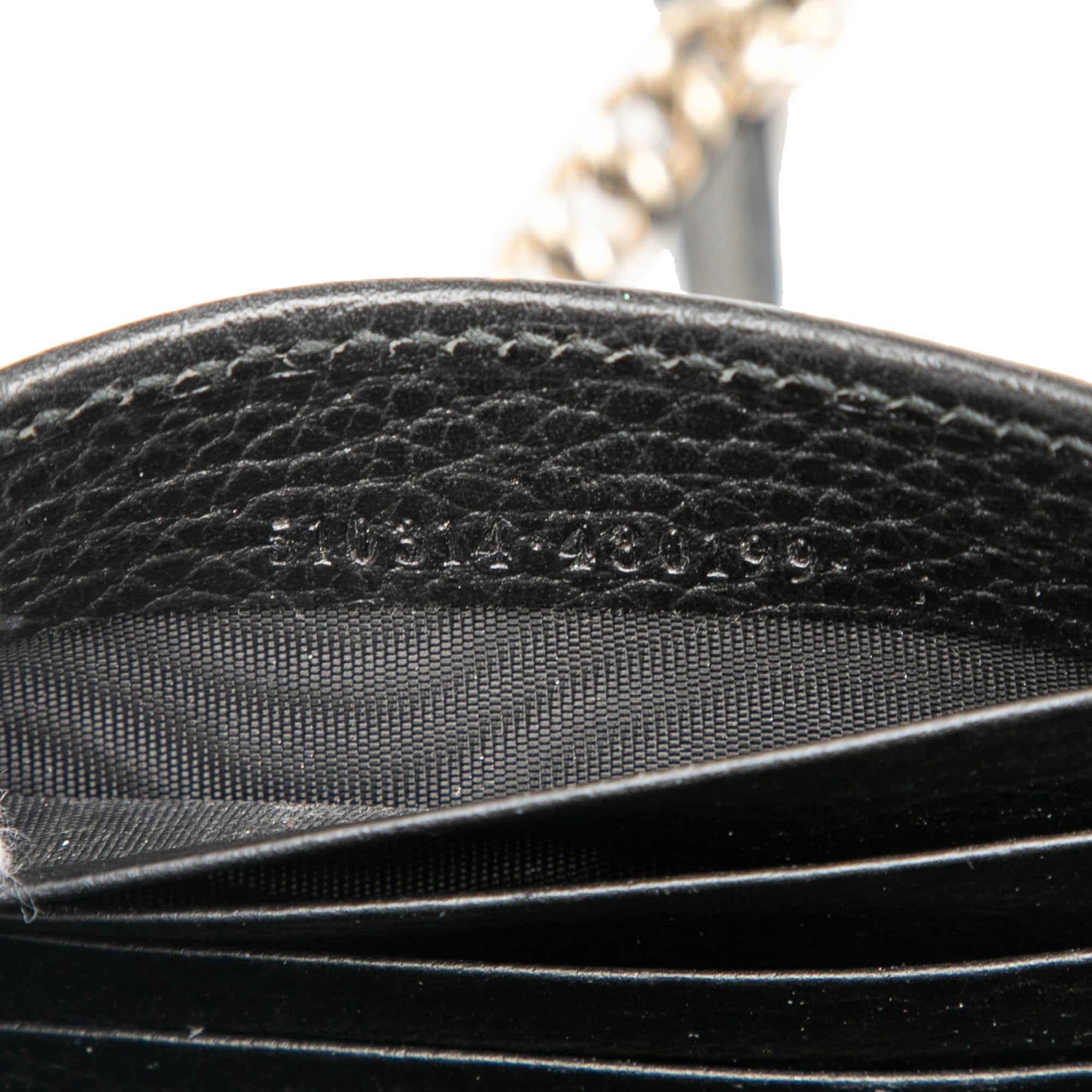 Product Details: Black Gucci Leather Interlocking G Dollar Wallet on Chain. The Interlocking G Dollar Wallet on Chain features a leather body, a curb chain strap with leather strap, a flap with magnetic snap closure, an interior zip compartment, and interior slip pockets. 4.5" L x 7.5" W x 0.6" D. Serial number 510314 480199.