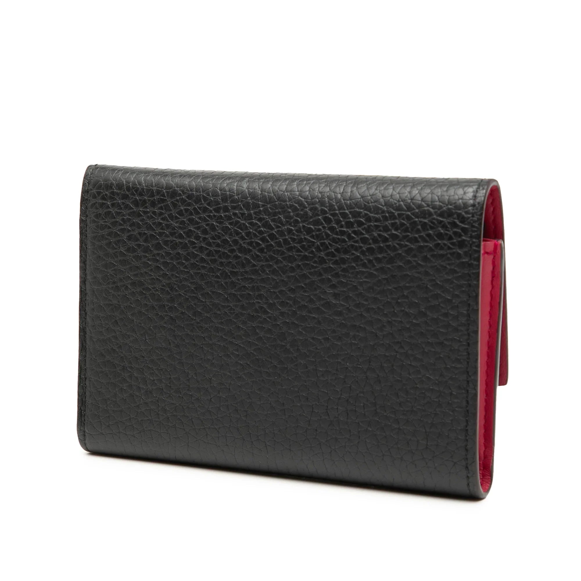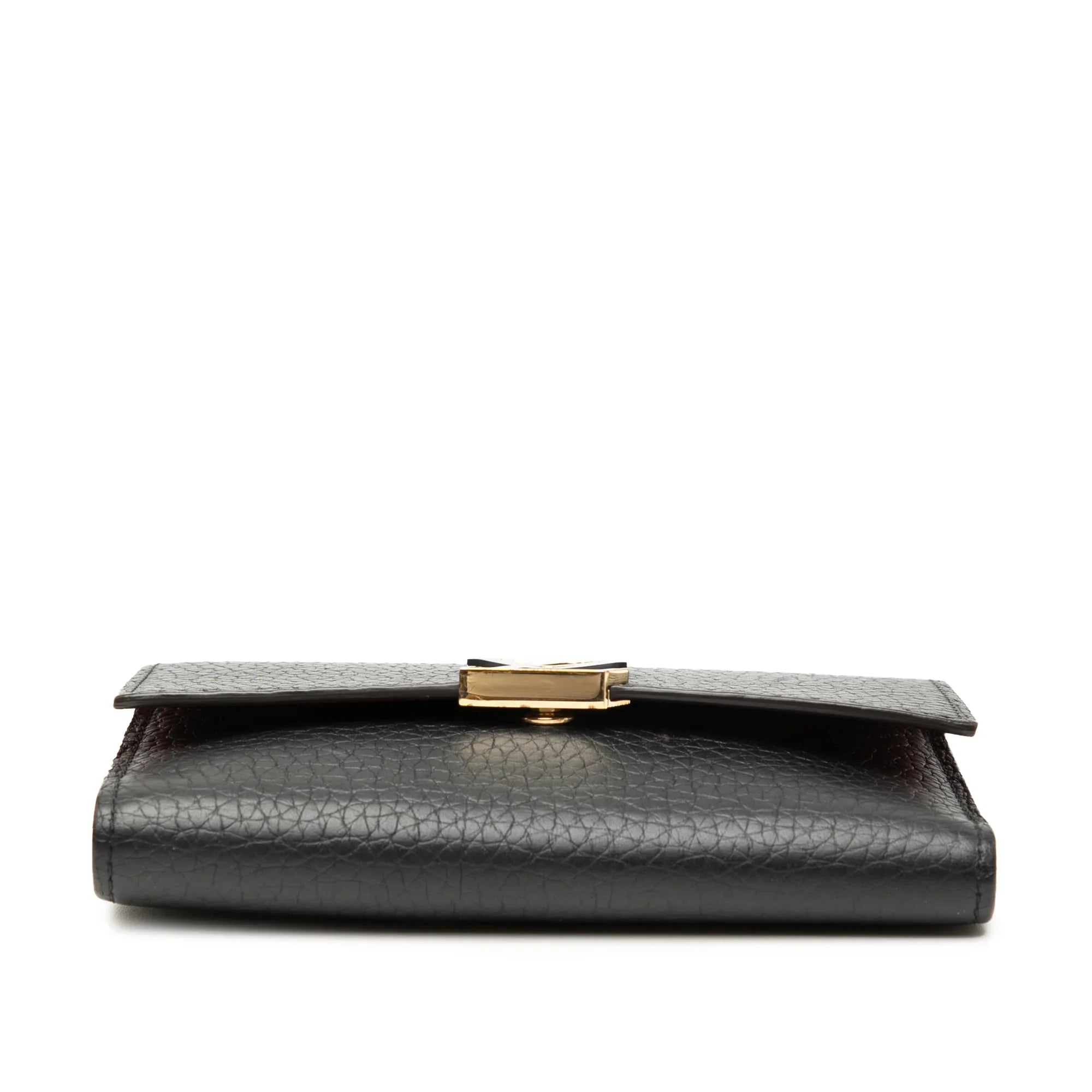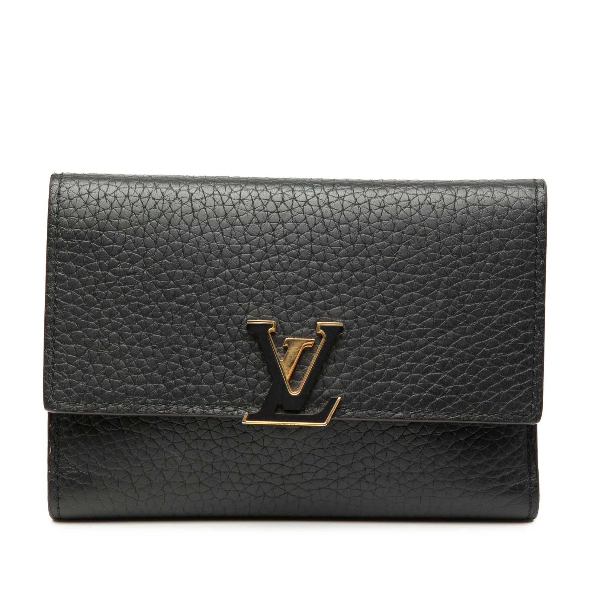 Product Details: Black Louis Vuitton Taurillon Capucines Compact Wallet. This wallet features a leather body, a flap with snap button closure, and interior zip and slip pockets. 3.5" L x 5.3" W x 0.8" D.