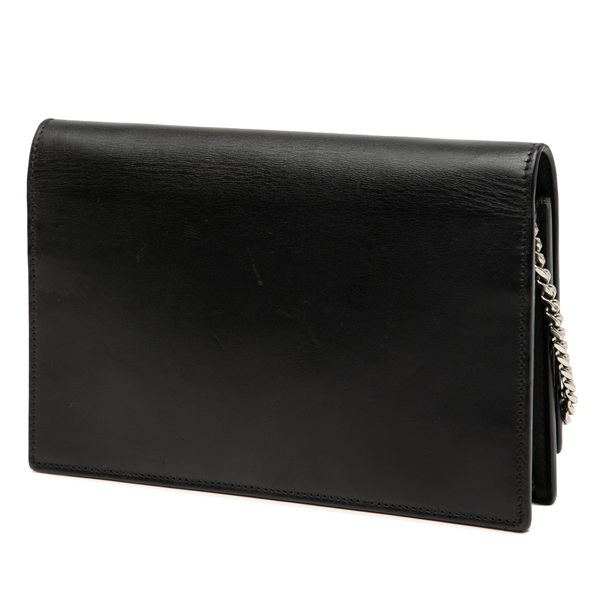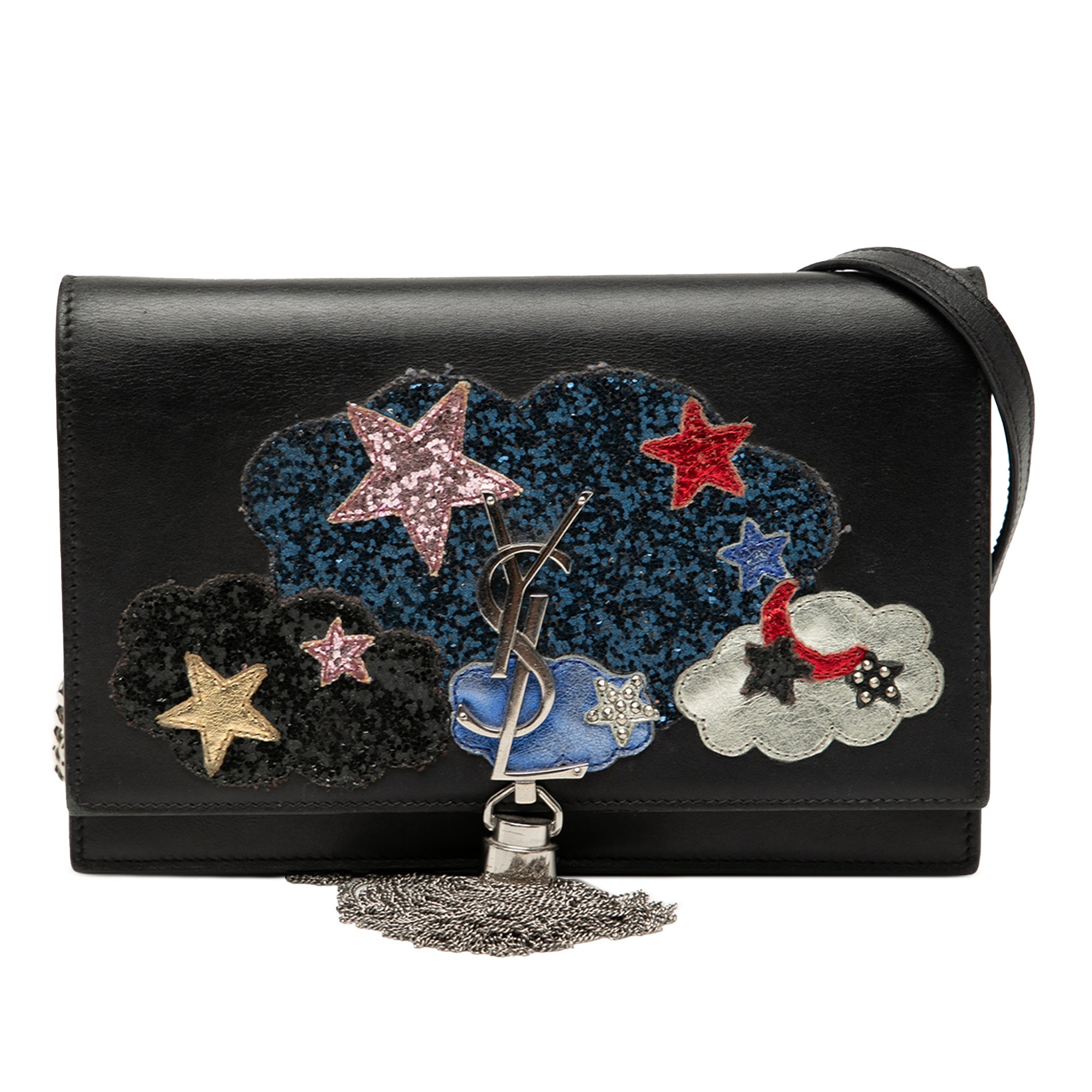 Product Details: Black Saint Laurent Calfskin Cloud Star Applique Classic Monogram Kate Tassel Wallet on Chain Crossbody Bag. The Kate wallet on chain features a leather body with a tassel, a silver-tone curb chain-link shoulder strap with leather guard, a front flap with magnetic snap closure, and interior zip and slip compartments. 4.7" L x 7.5" W x 1.2" D. Serial number INN455263 1116.