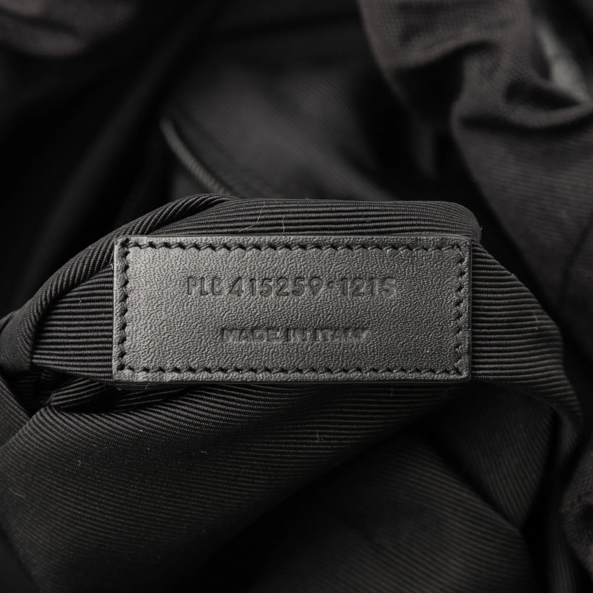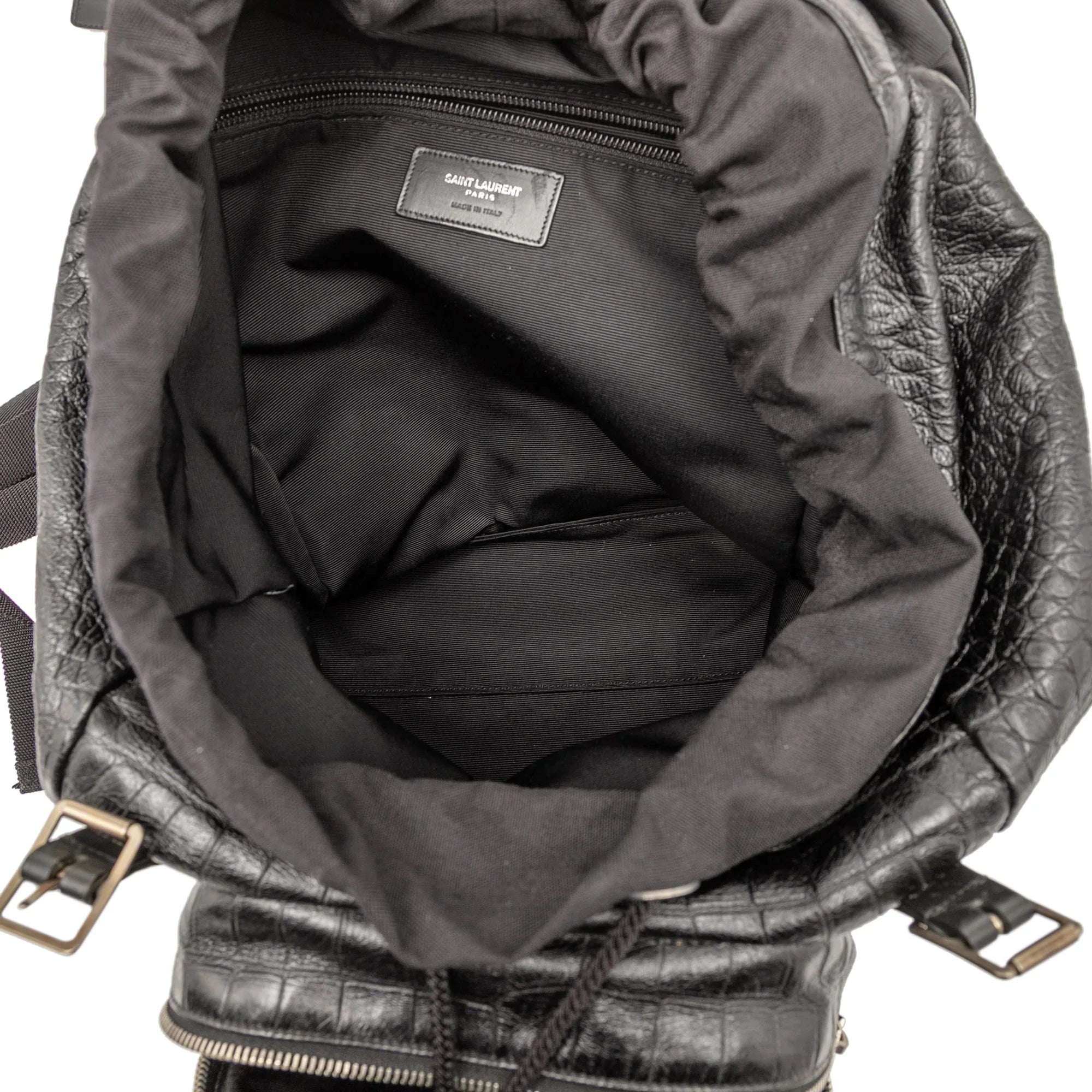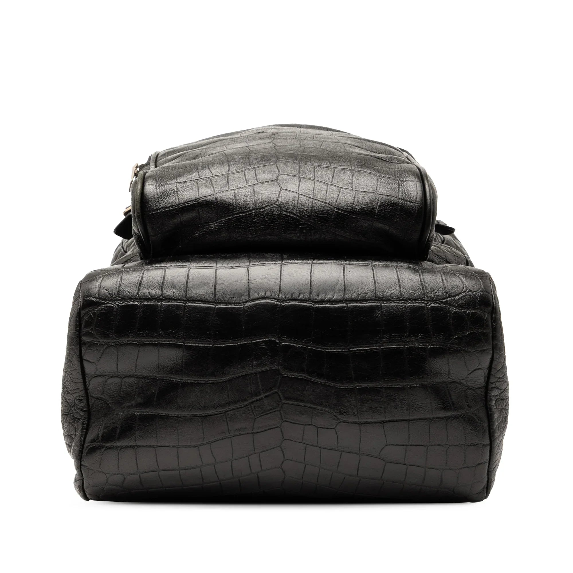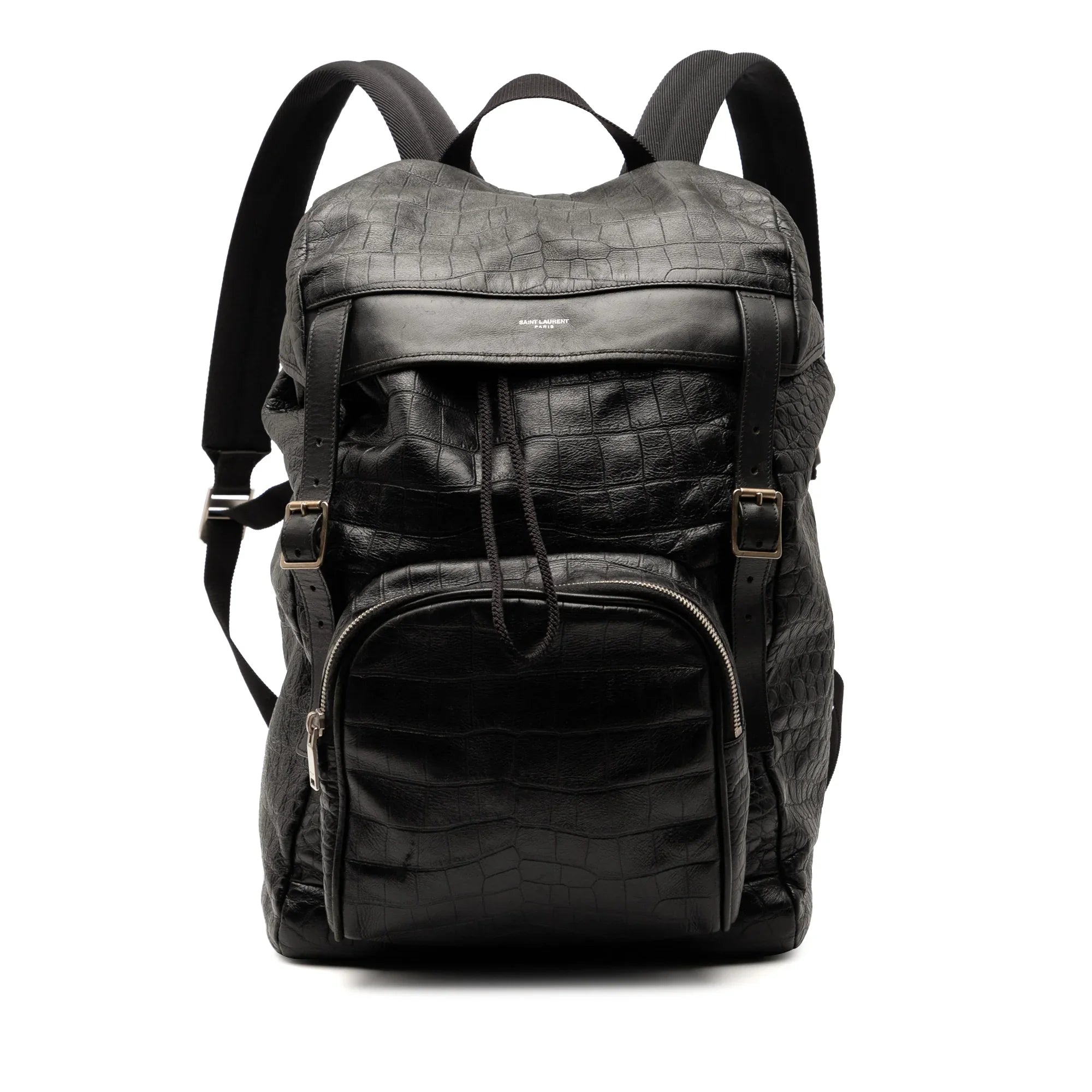 Product Details: Black Saint Laurent Croc Embossed Leather Backpack. This backpack features an embossed leather body, a flat top handle, flat back straps, a top flap with buckle closures, an exterior front zip pocket, and an interior zip pocket. 15" L x 10.2" W x 5.1" D, 2.8" drop. Serial number PLB415259 1215.