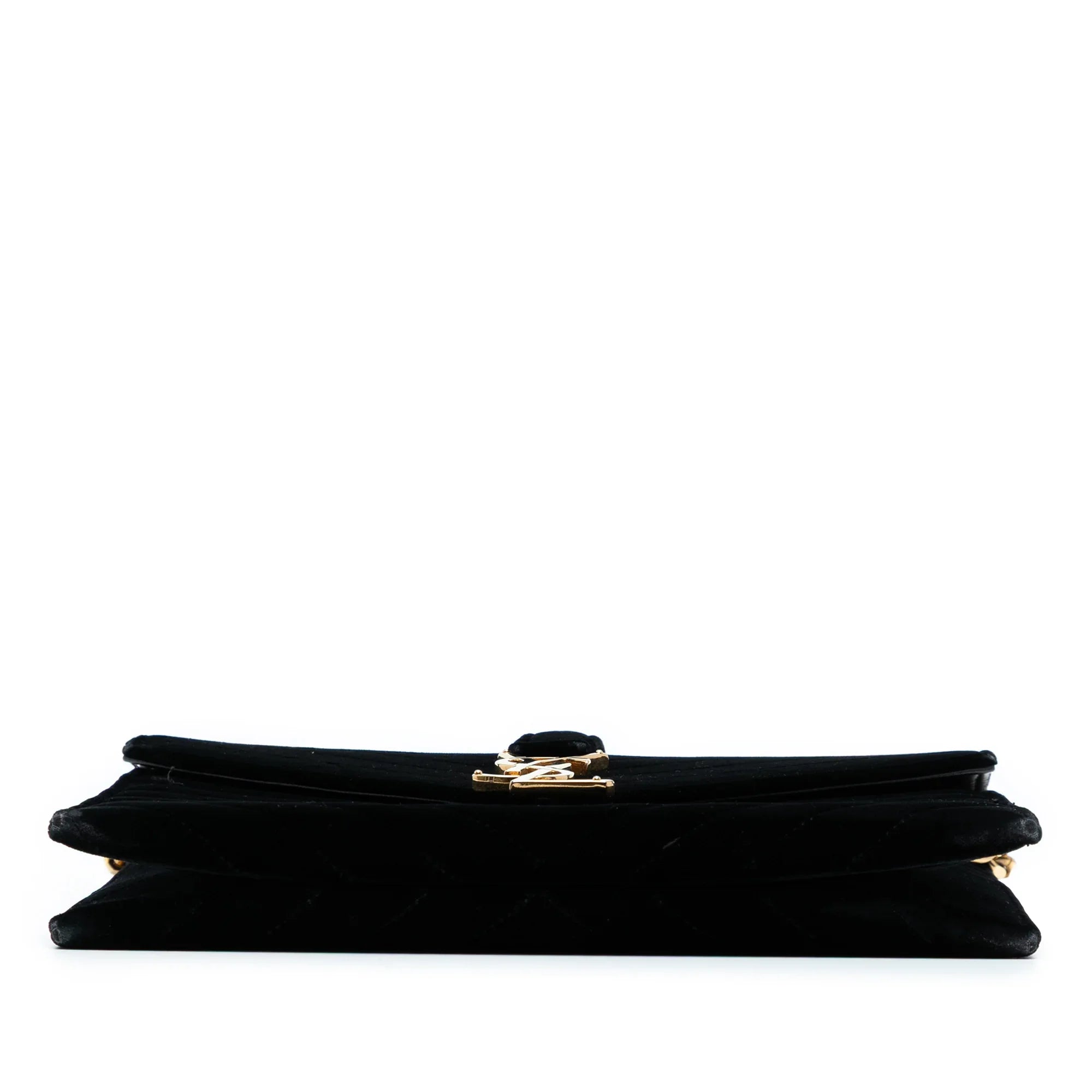 Product Details: Black Saint Laurent Medium Chevron Velvet Monogram Envelope Bag. This shoulder bag features a quilted velvet body, a gold-tone curb chain link strap with leather guard, a front flap with magnetic snap button closure, and an interior slip pocket. 7.5" L x 9.6" W x 1.4" D. Serial number ARS354499·0714.