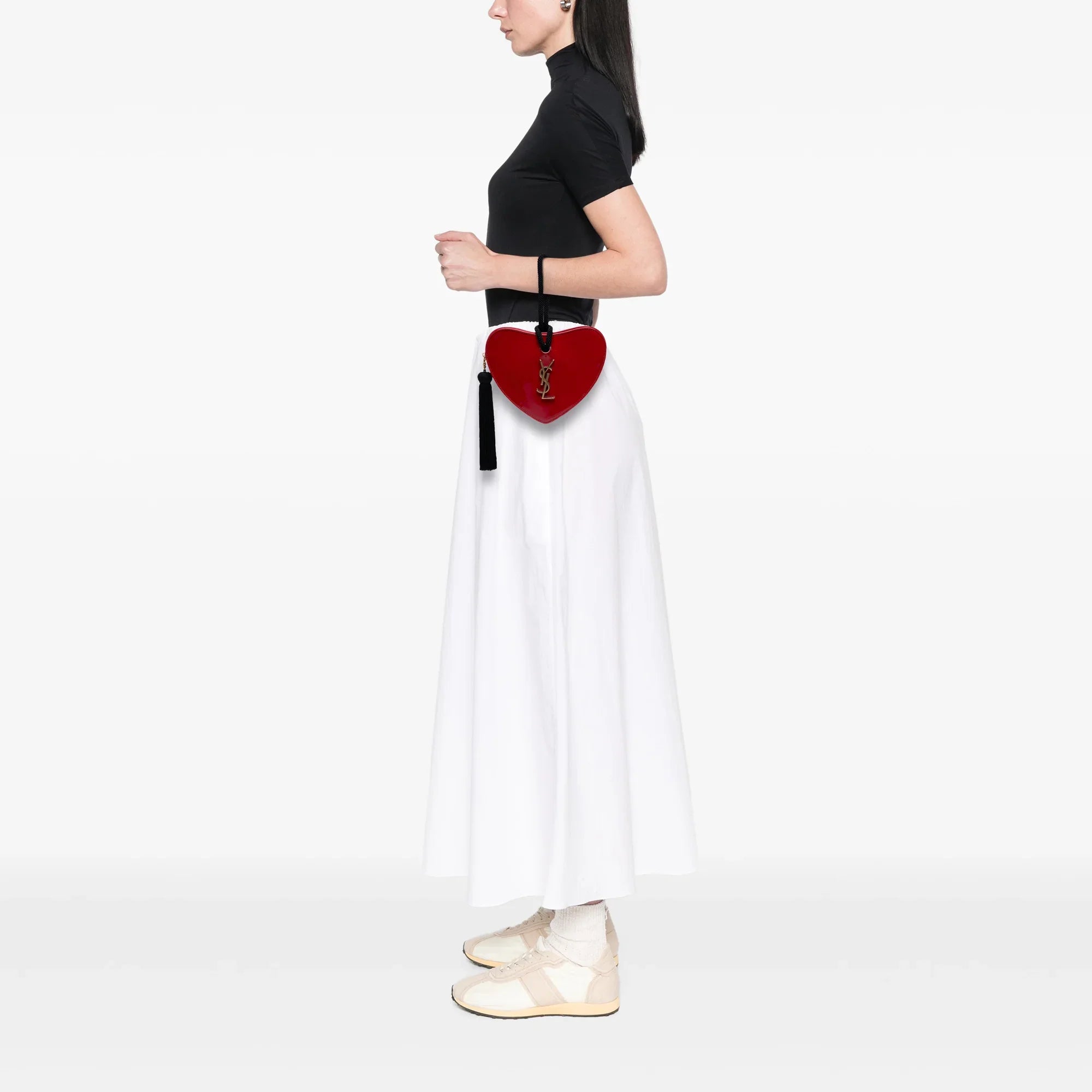 Product Details: Red Saint Laurent Patent Sac Coeur Heart Shaped Clutch. The Sac Coeur features a patent leather body, a roped handle with tassel detail, a top zip closure, and an interior slip pocket. 5.9" L x 7.9" W x 2.2" D, 4.7" drop. Serial number BRS·538445·0618.