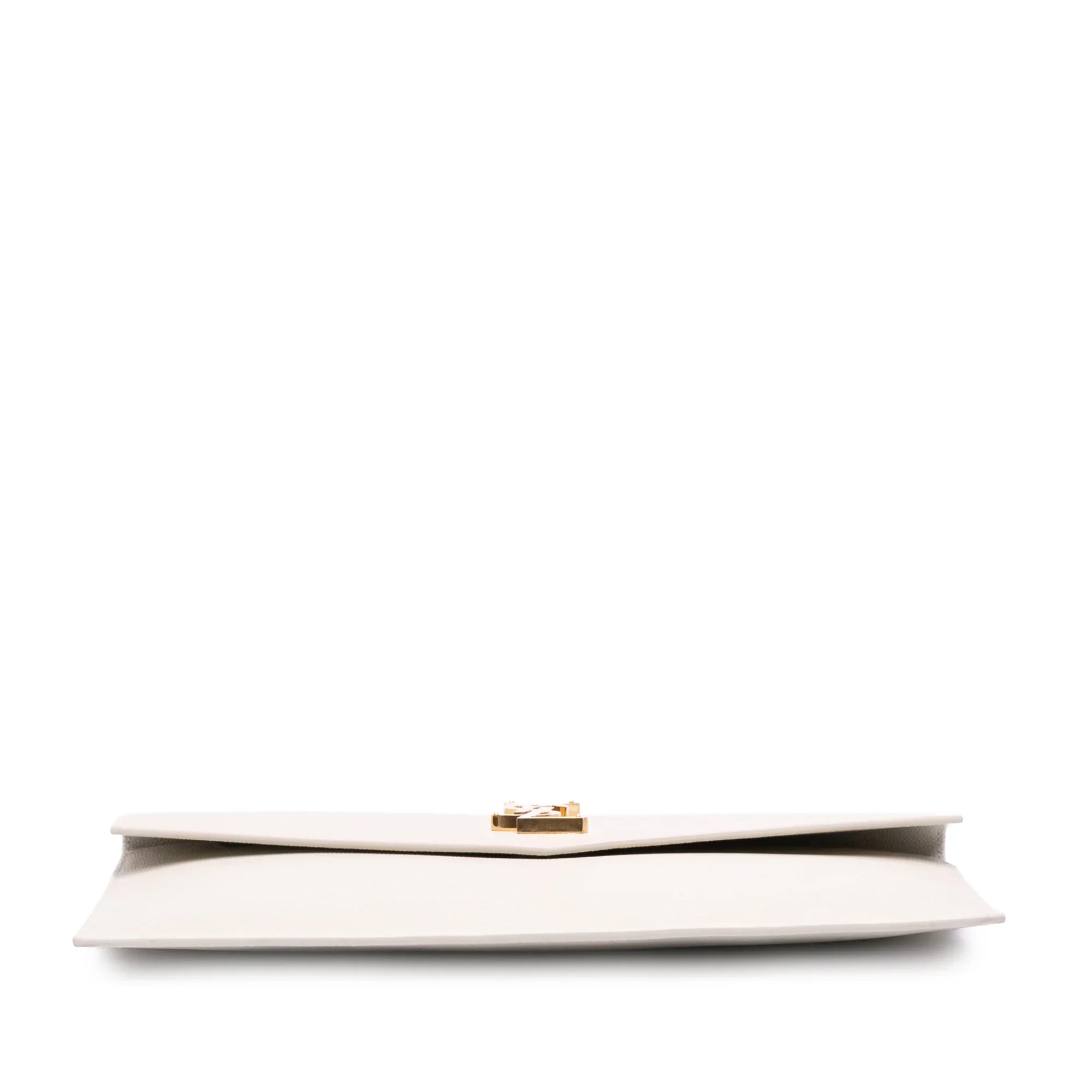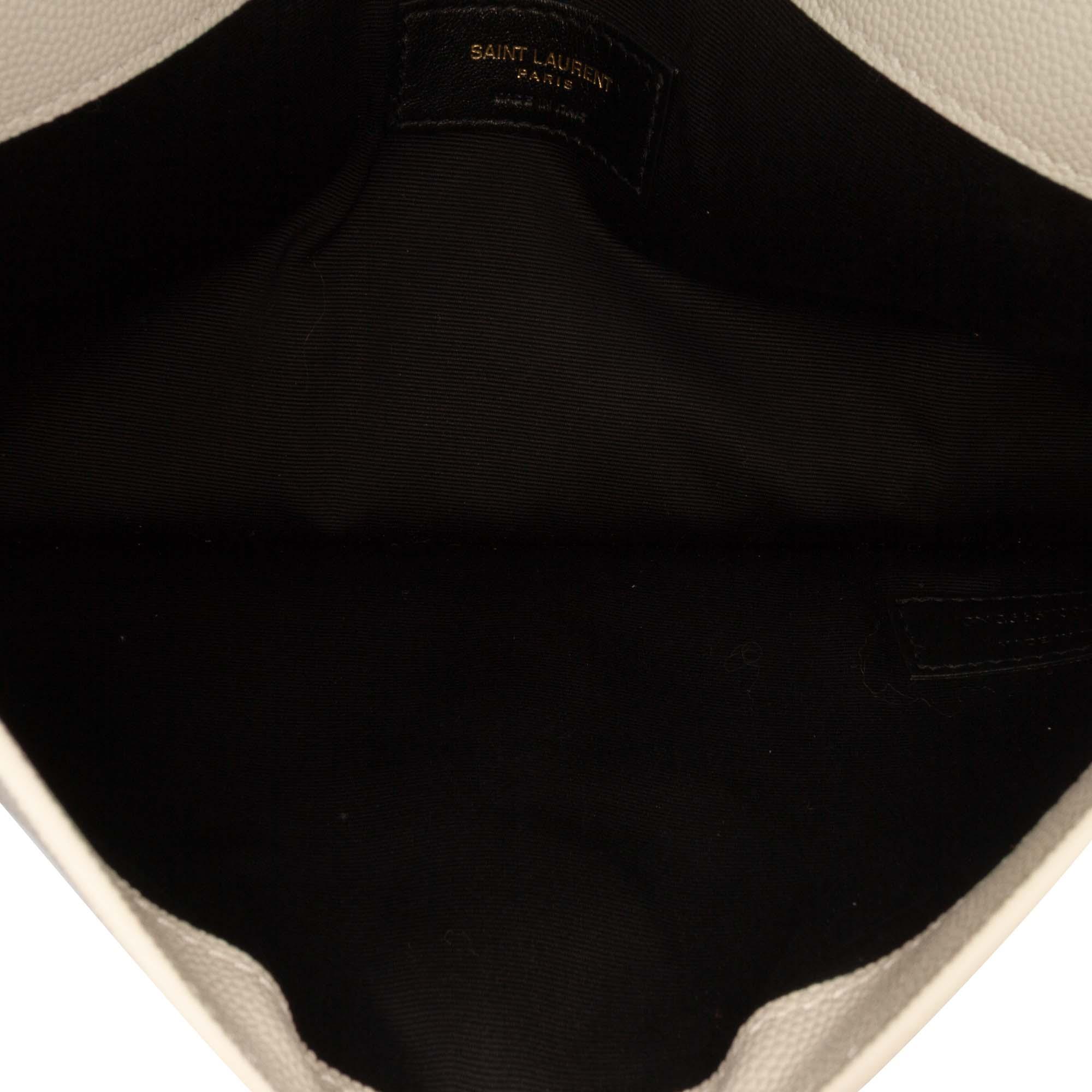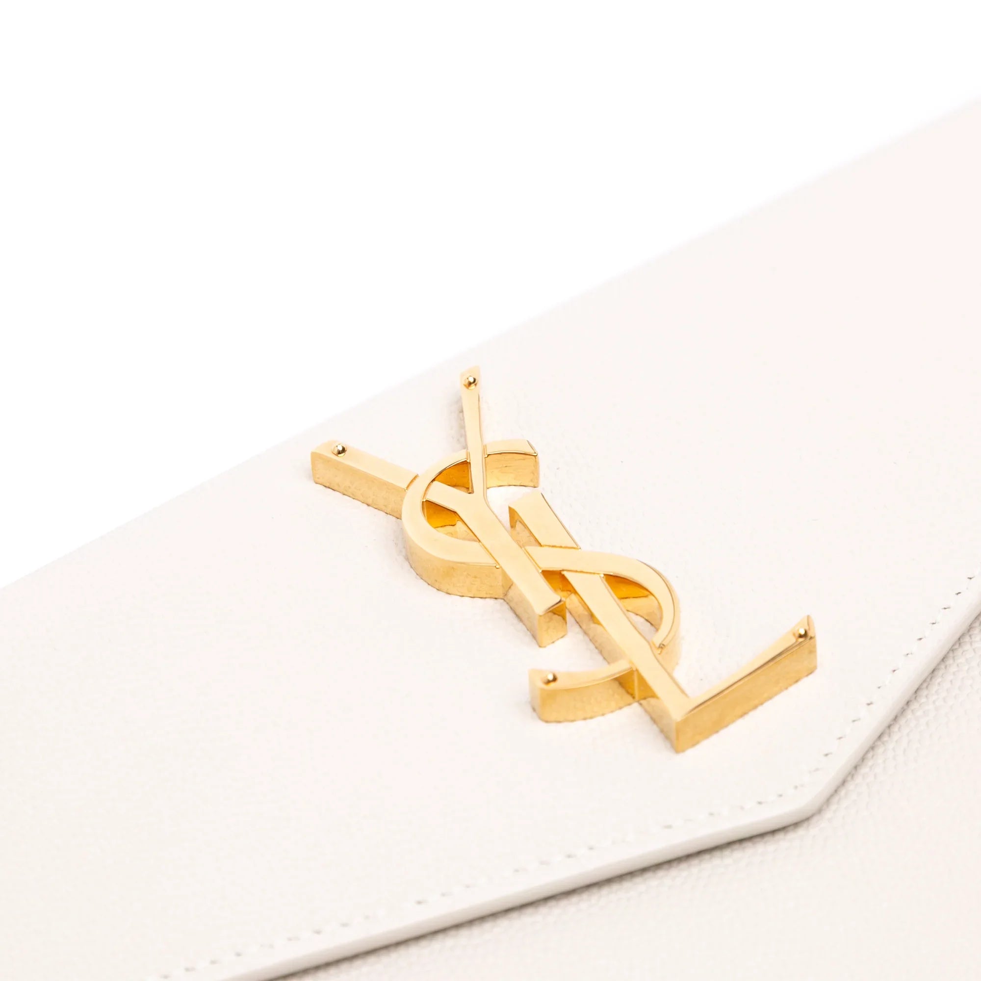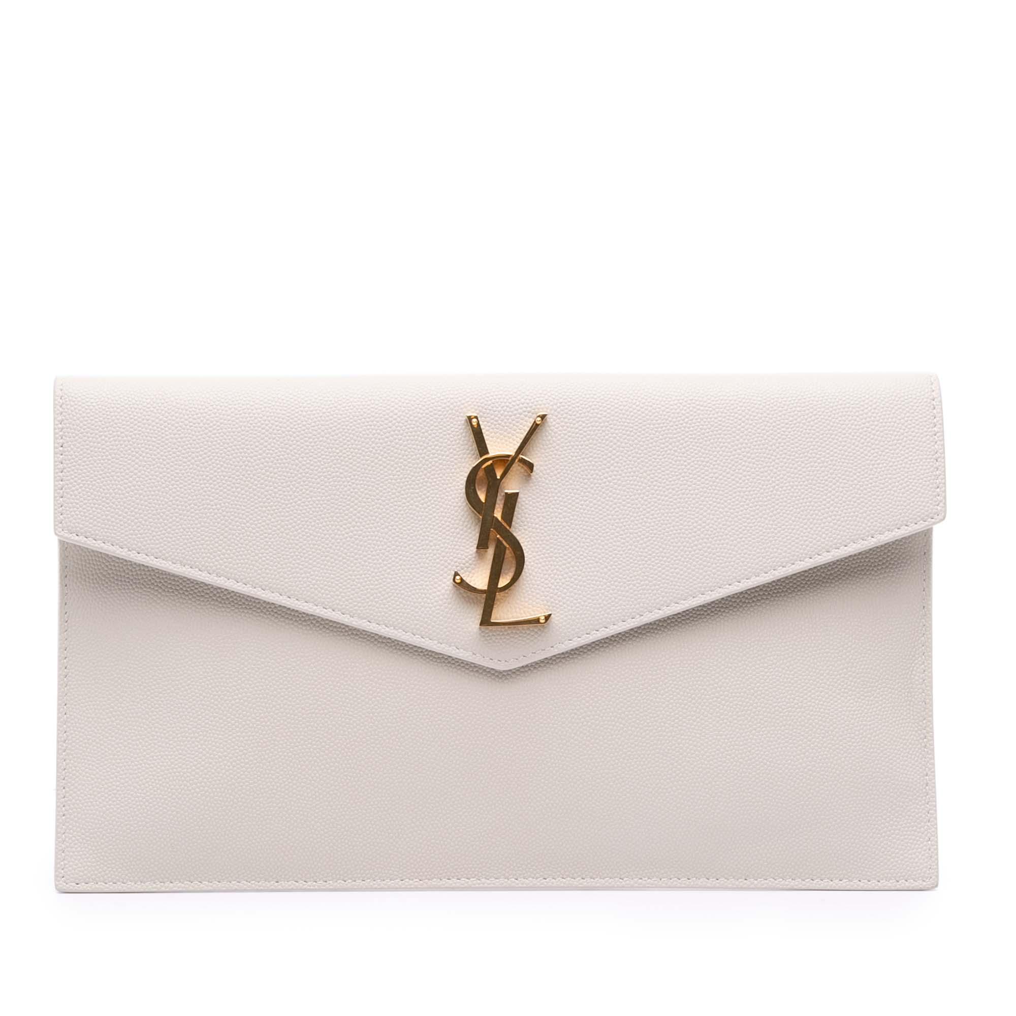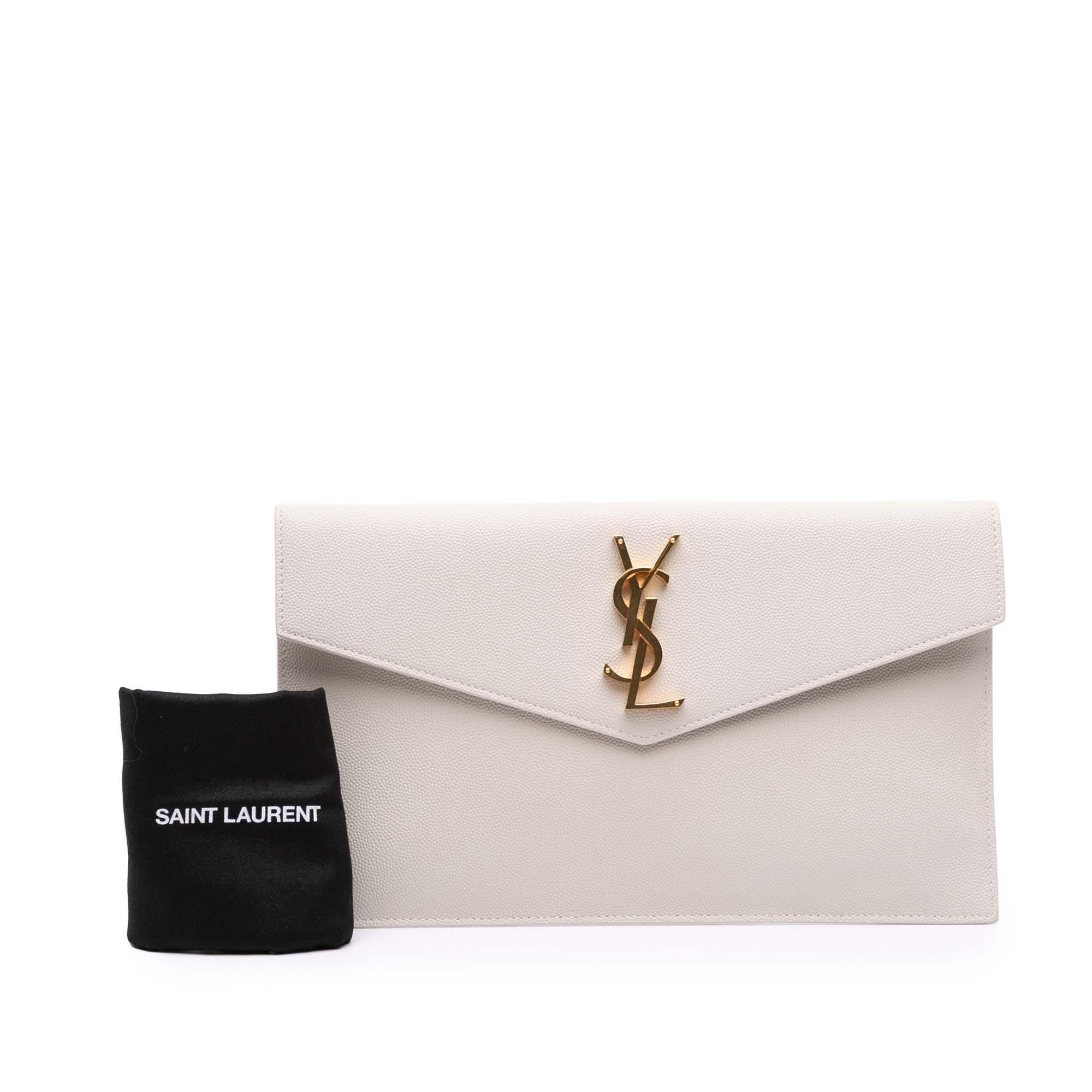 Product Details: White Saint Laurent Grain De Poudre Uptown Pouch Clutch Bag. The Uptown Pouch features a leather body and a front flap with snap button closure. 6.3" L x 10.6" W x 0.1" D. Serial number GNC565739 1123.