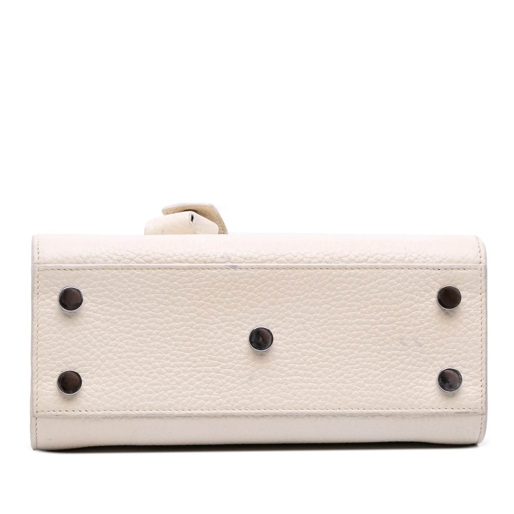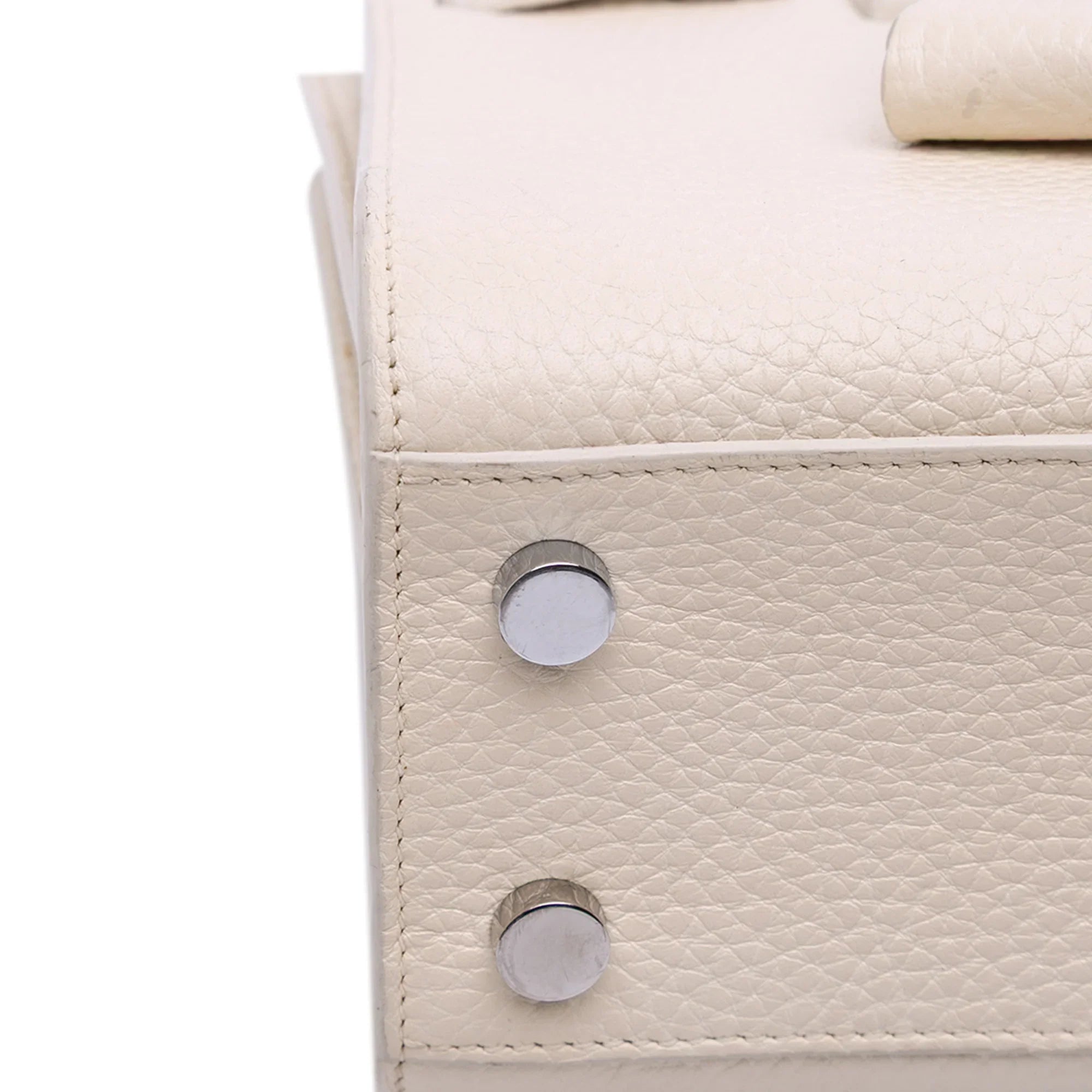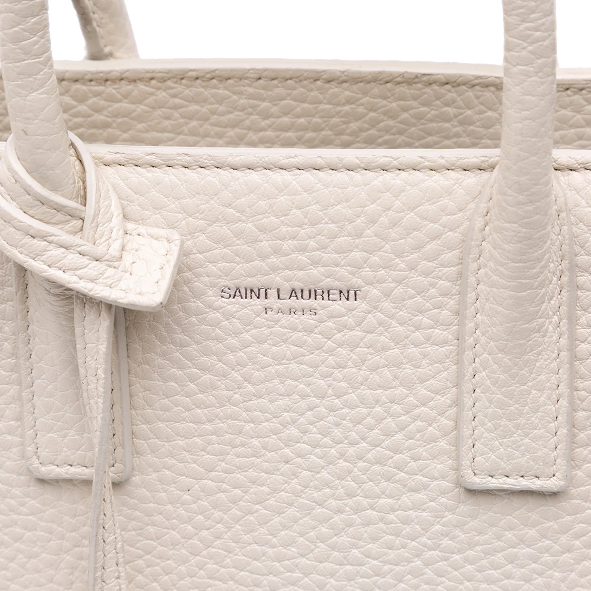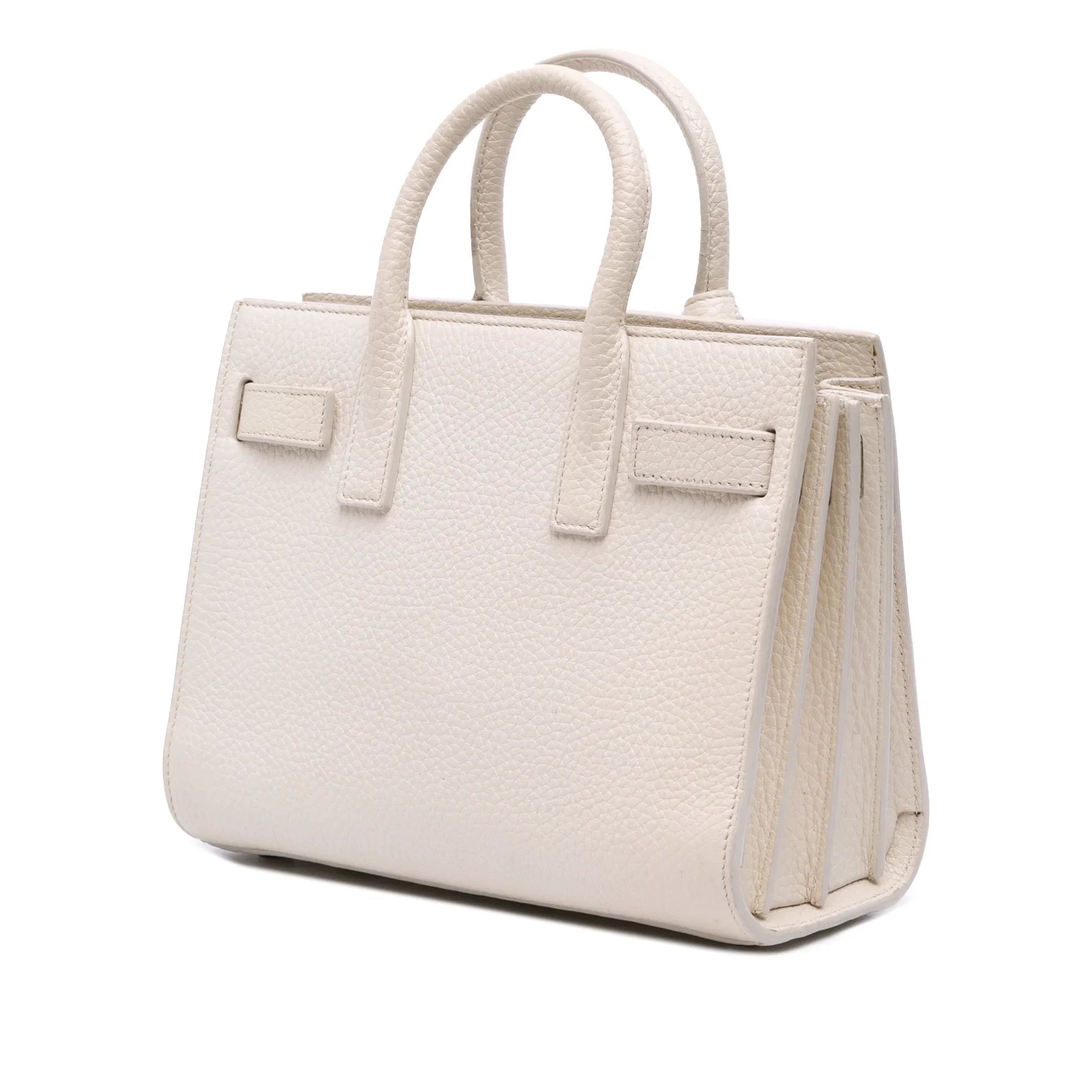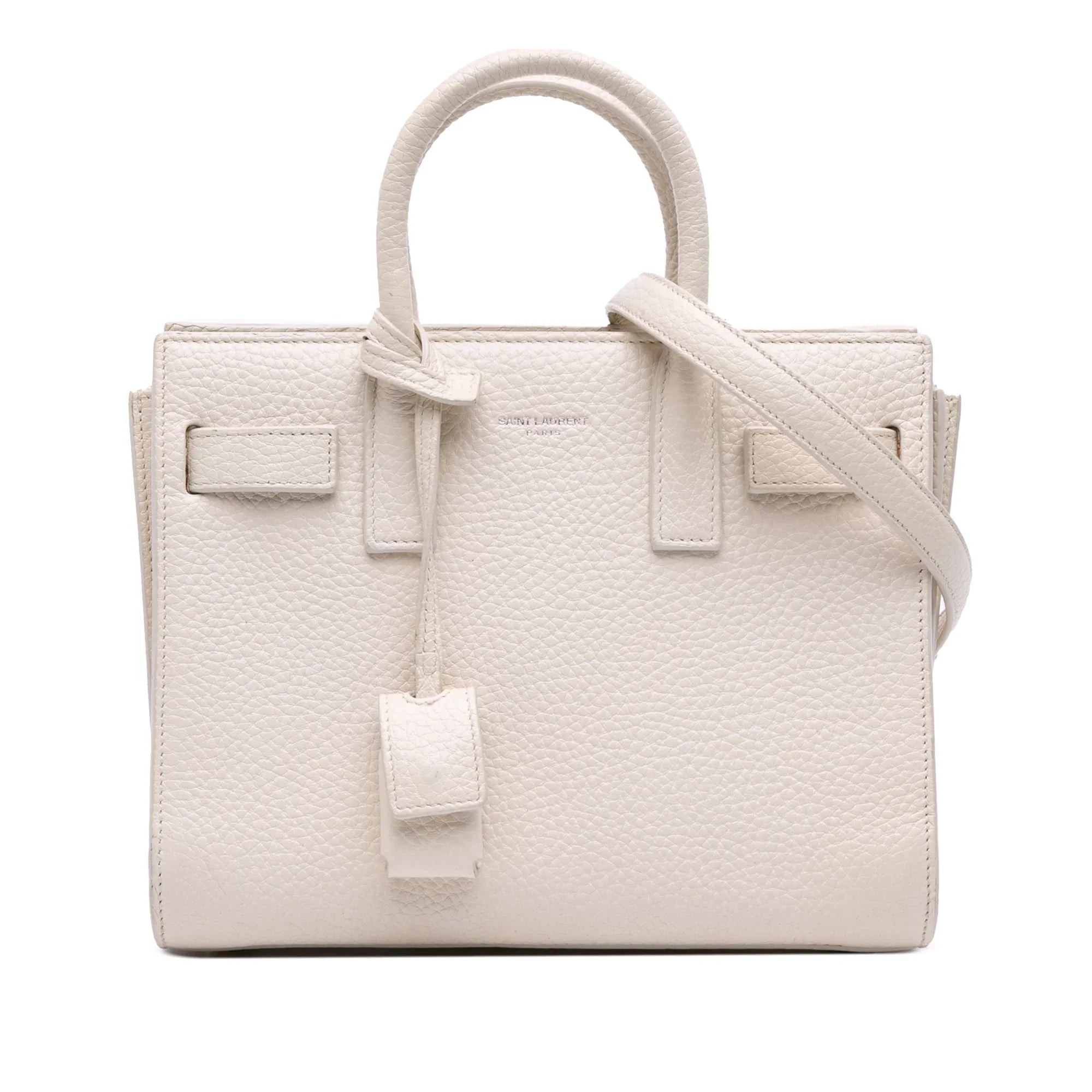 Product Details: White Saint Laurent Nano Grained Calfskin Sac de Jour Satchel. The Sac De Jour satchel features a grained leather body, rolled leather handles, a detachable flat leather strap, an open top, and an interior slip pocket. Exterior bottom has been repainted. 7.1" L x 8.7" W x 2.8" D, 3" drop.