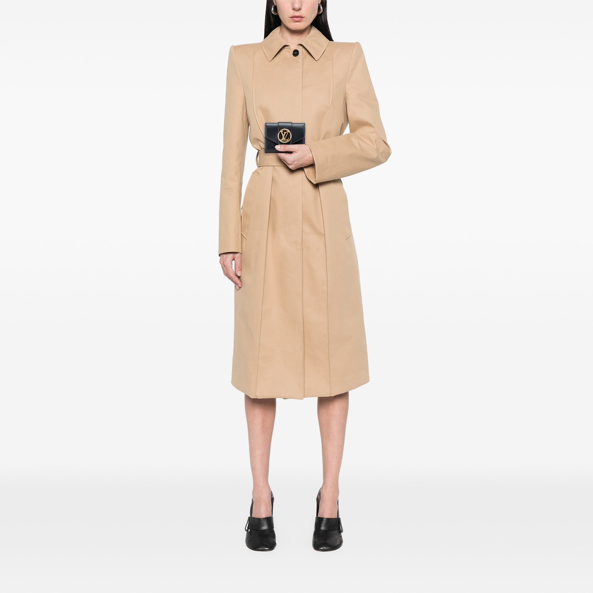 Product Details: Black Louis Vuitton Smooth Calfskin LV Pont 9 Compact Wallet. This wallet features a leather body, a front flap with a snap button closure, a zip compartment, and slip pockets. 3.9" L x 4.7" W x 0.6" D.