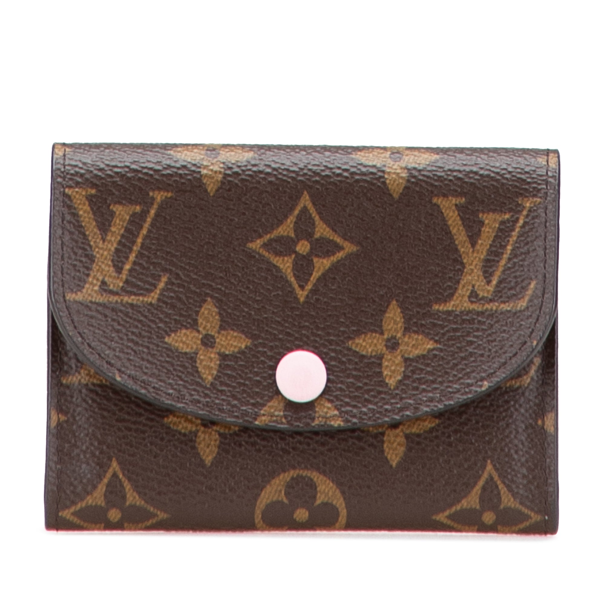 Product Details: Brown Louis Vuitton Monogram Rosalie Coin Purse. The Rosalie coin purse features a monogram canvas body, a front flap with snap button closure, and interior zip and slip pockets. 3.3" L x 4.3" W x 0.6" D.