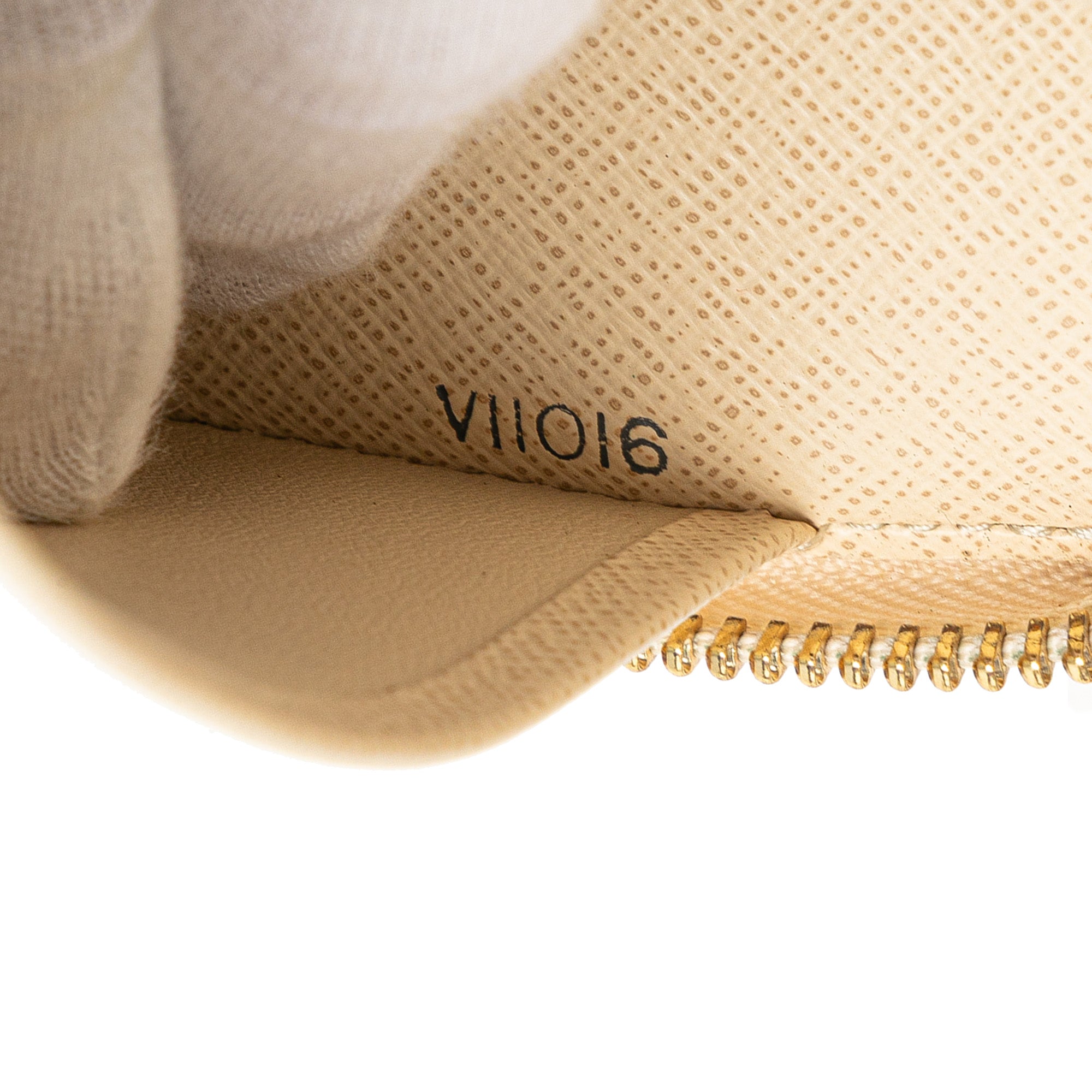 Product Details: White Louis Vuitton Damier Azur Zippy Long Wallet. This wallet features a damier azur canvas body, a zip-around closure, an interior zip compartment, and interior slip pockets. 4.5" L x 8.3" W x 1" D. Serial number VI1016.