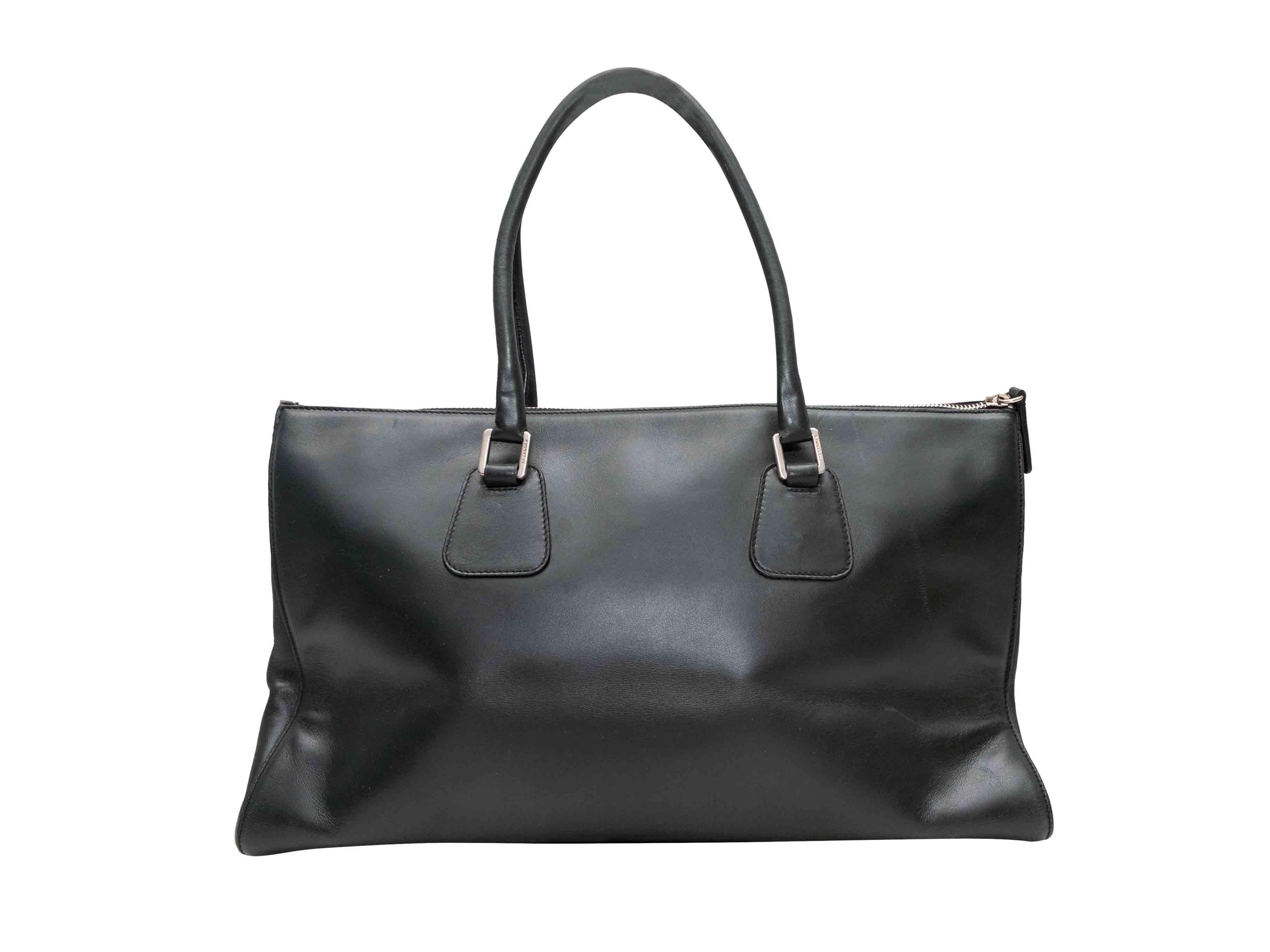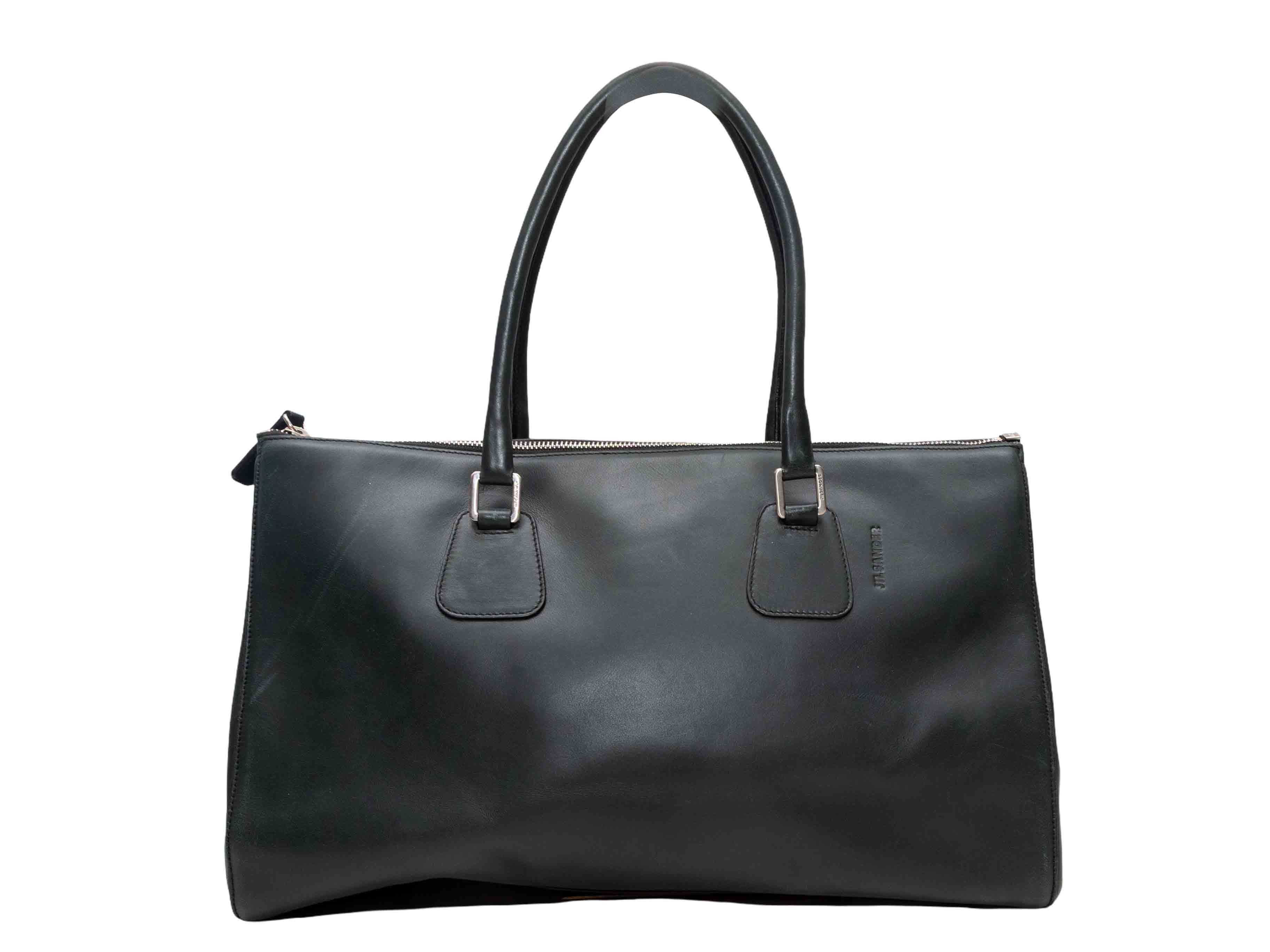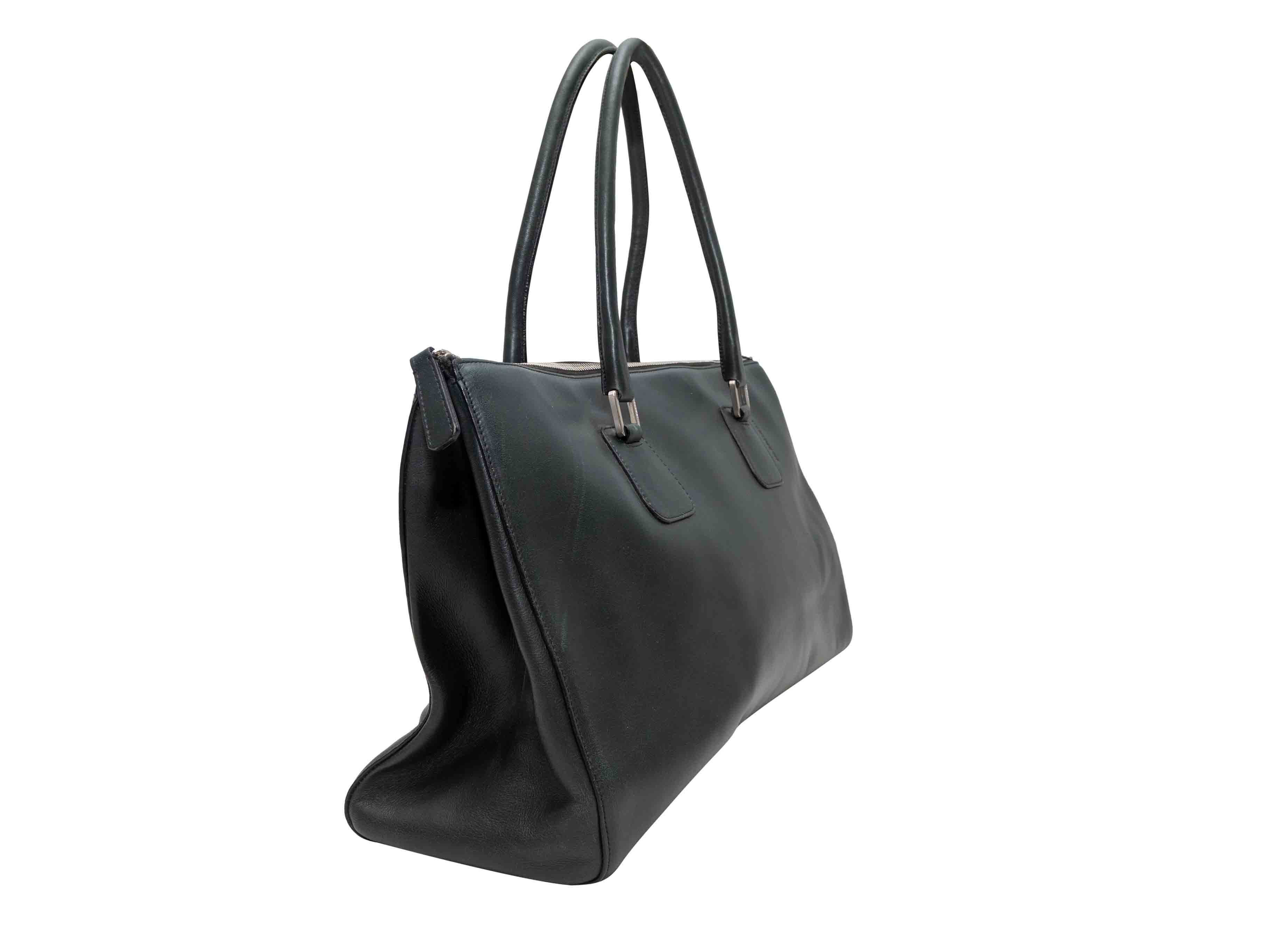 Product Details: Dark Green Jil Sander Leather Tote Bag. This tote bag features a leather body, silver-tone hardware, dual shoulder straps, and a top zip closure. 14.5" L x 9" H x 6" D, 6.5" handle drop.