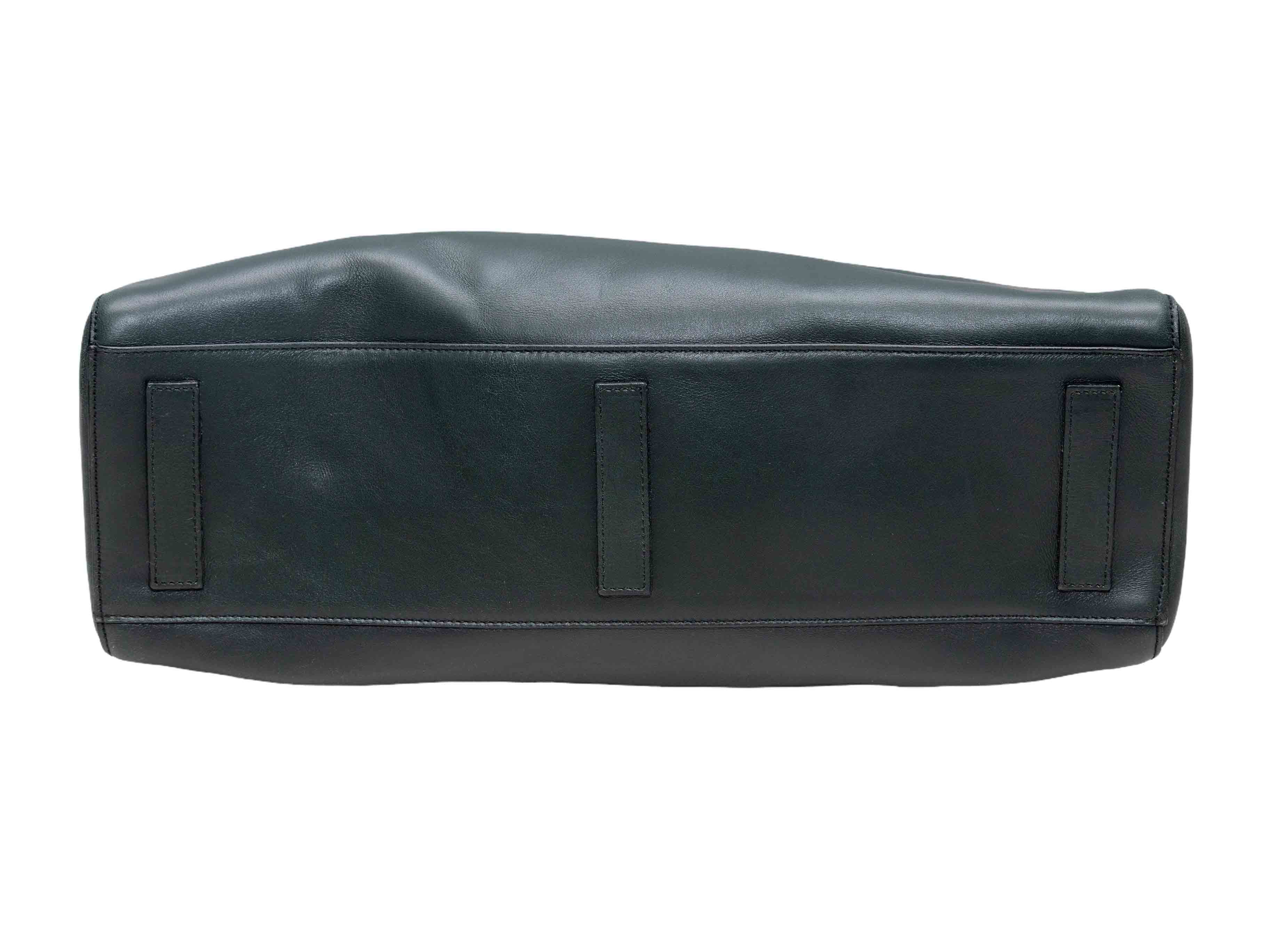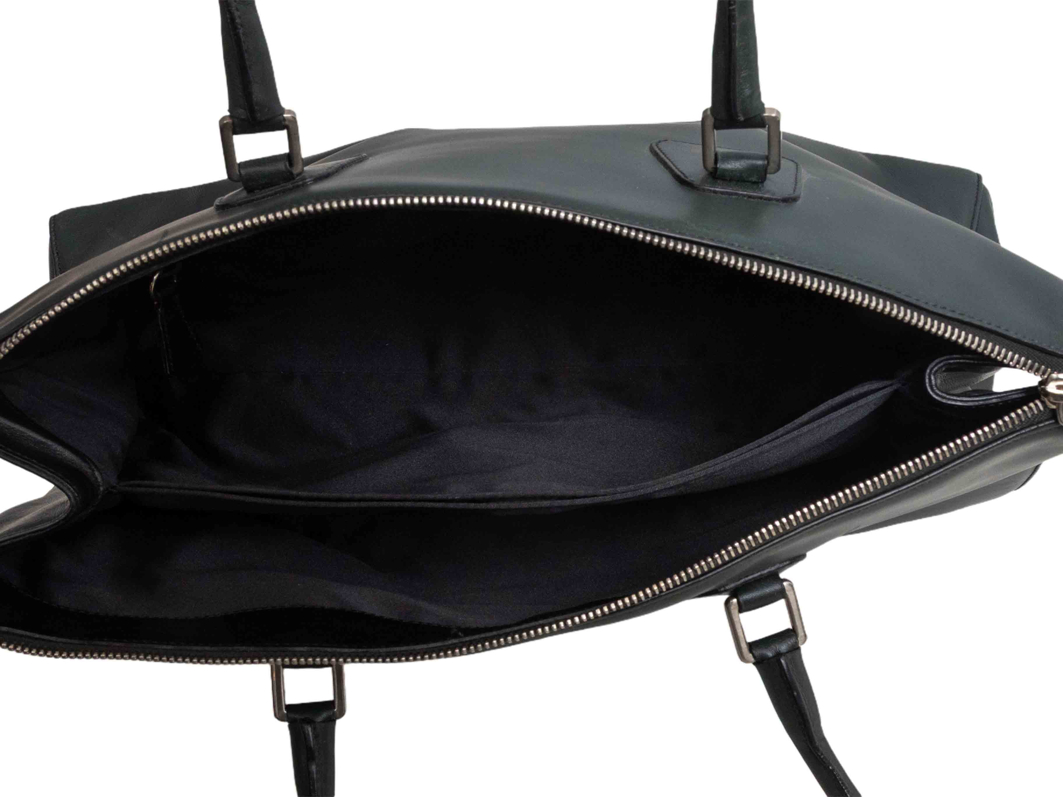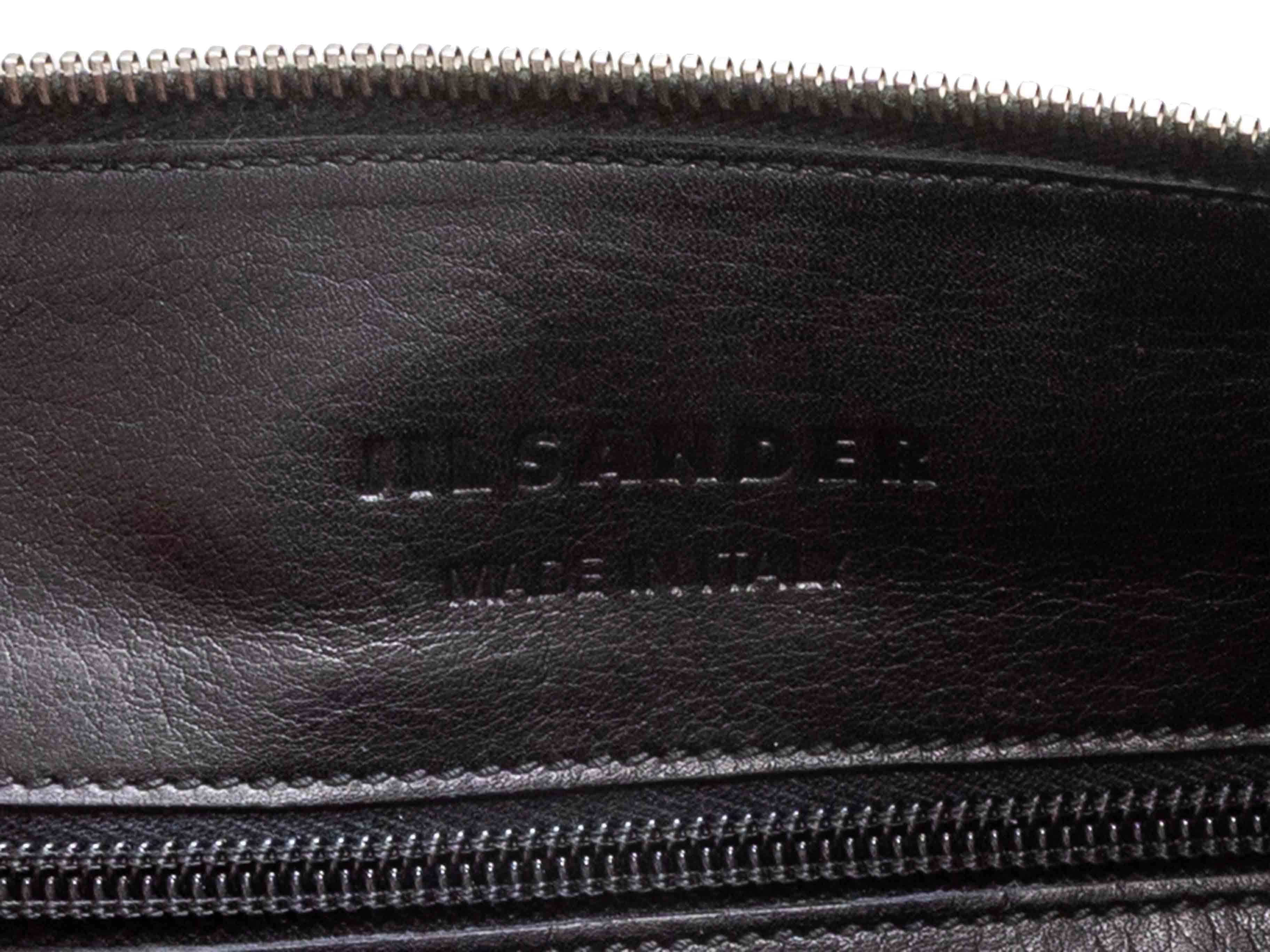 Product Details: Dark Green Jil Sander Leather Tote Bag. This tote bag features a leather body, silver-tone hardware, dual shoulder straps, and a top zip closure. 14.5" L x 9" H x 6" D, 6.5" handle drop.
