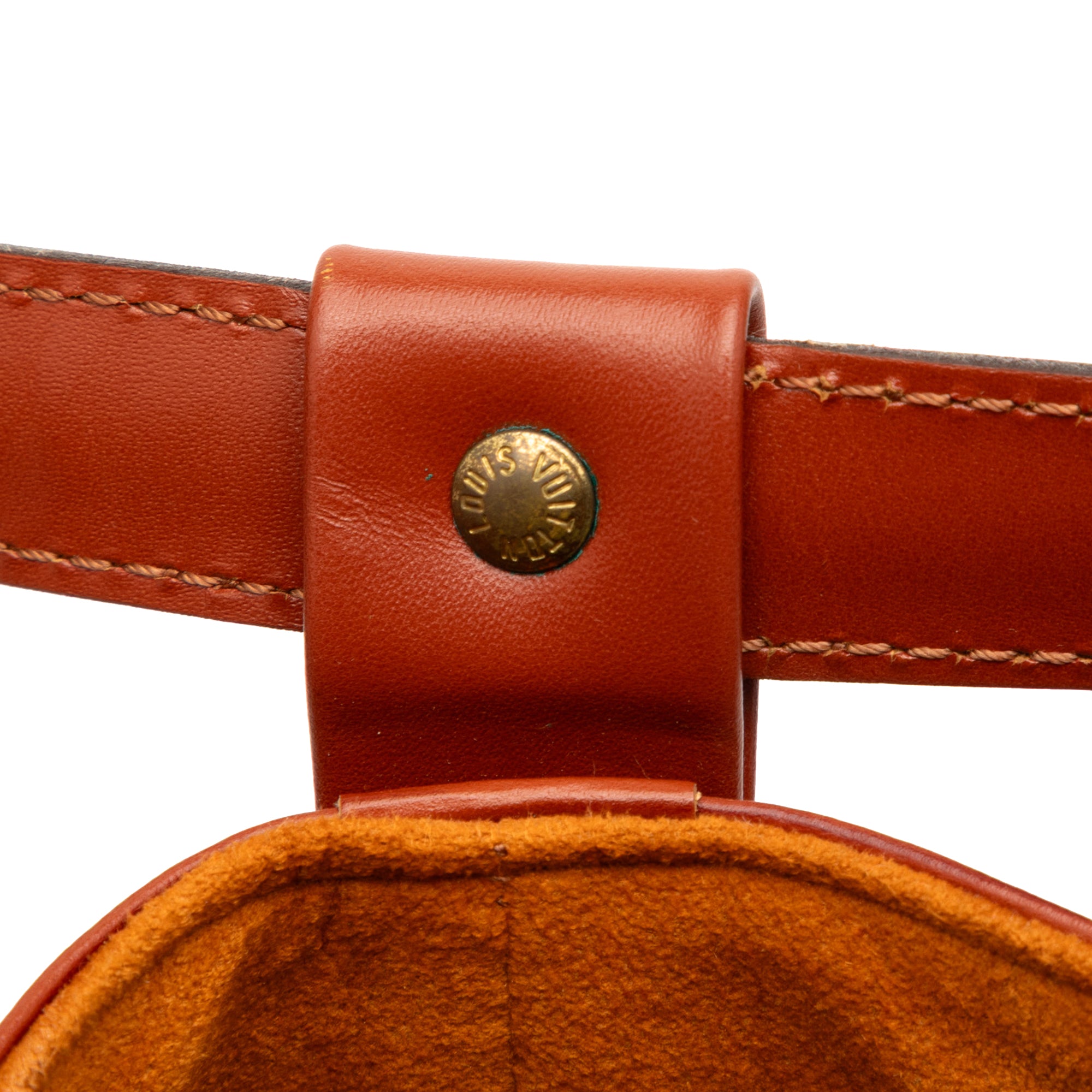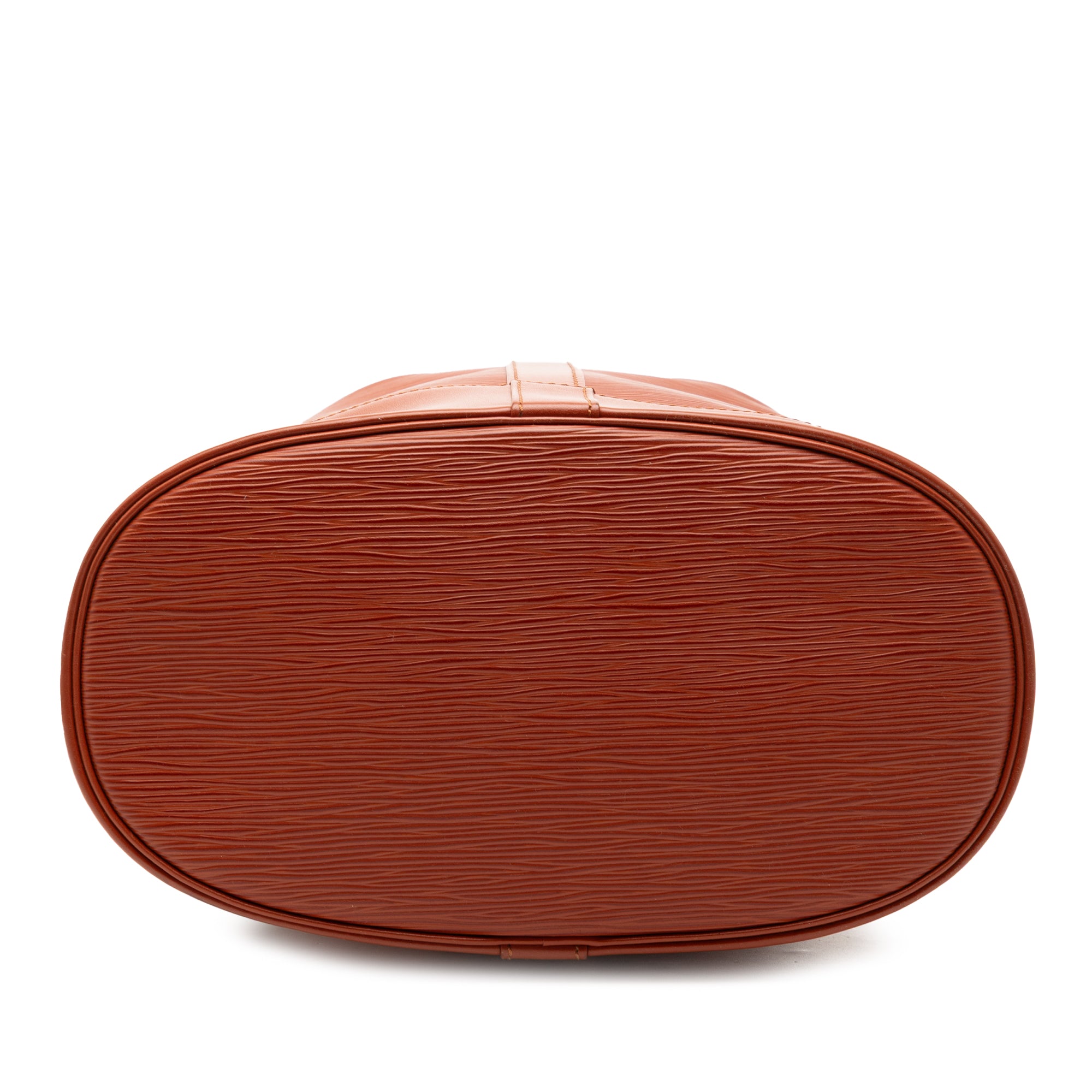 Product Details: Brown Louis Vuitton Epi Randonnee PM Backpack. The Randonnee PM features an epi leather body, adjustable flat straps, and a top drawstring closure. 14.2" L x 11" W x 5.9" D. Serial number AR0976.
