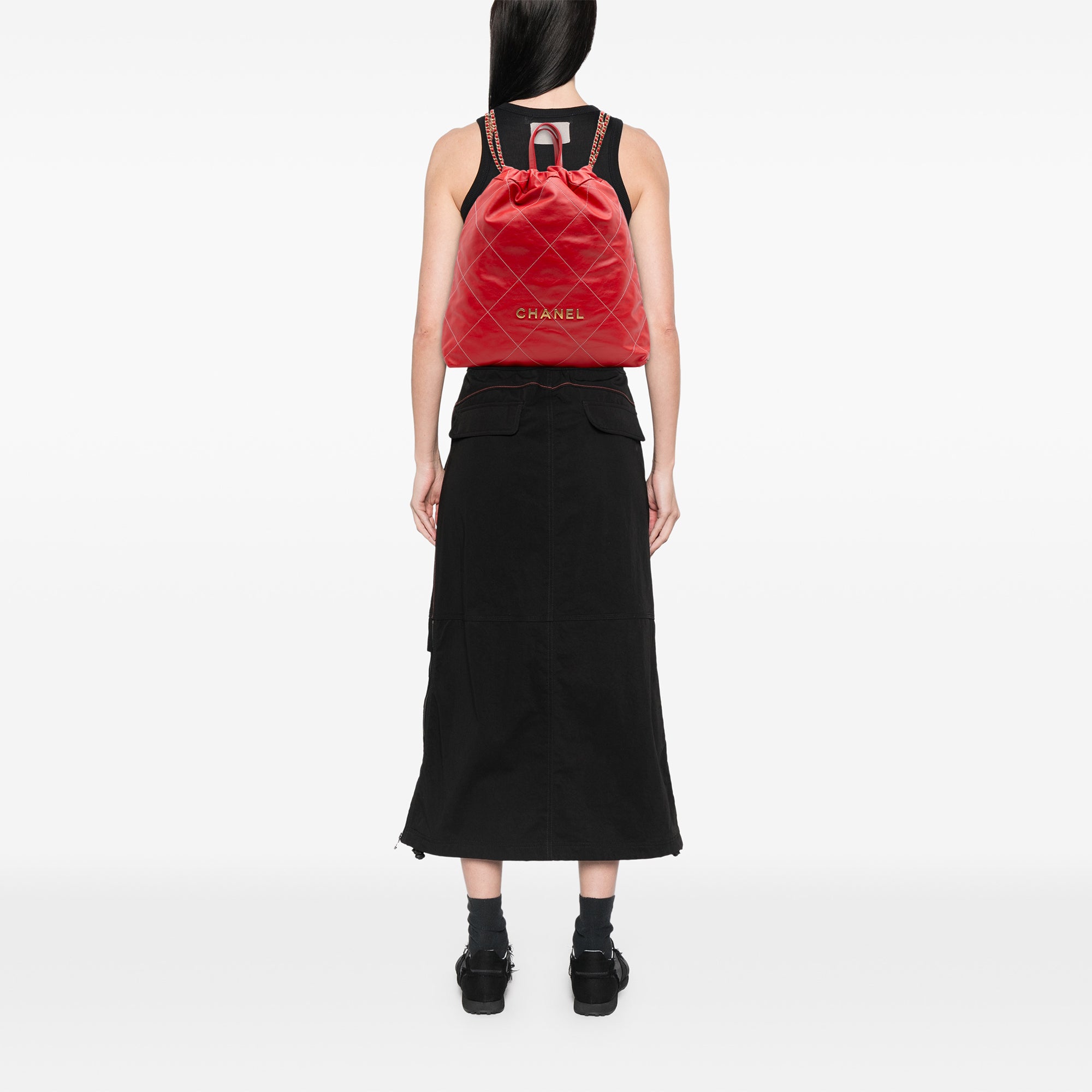 Product Details: Red Chanel Large Shiny Quilted Calfskin 22 Backpack. The 22 backpack features a calf leather body, flat top handles, leather woven chain back straps, a top drawstring closure, and an interior zip pocket. 15.7" L x 13.8" W x 3.5" D, 3.9" drop. Serial number JLPT306J.
