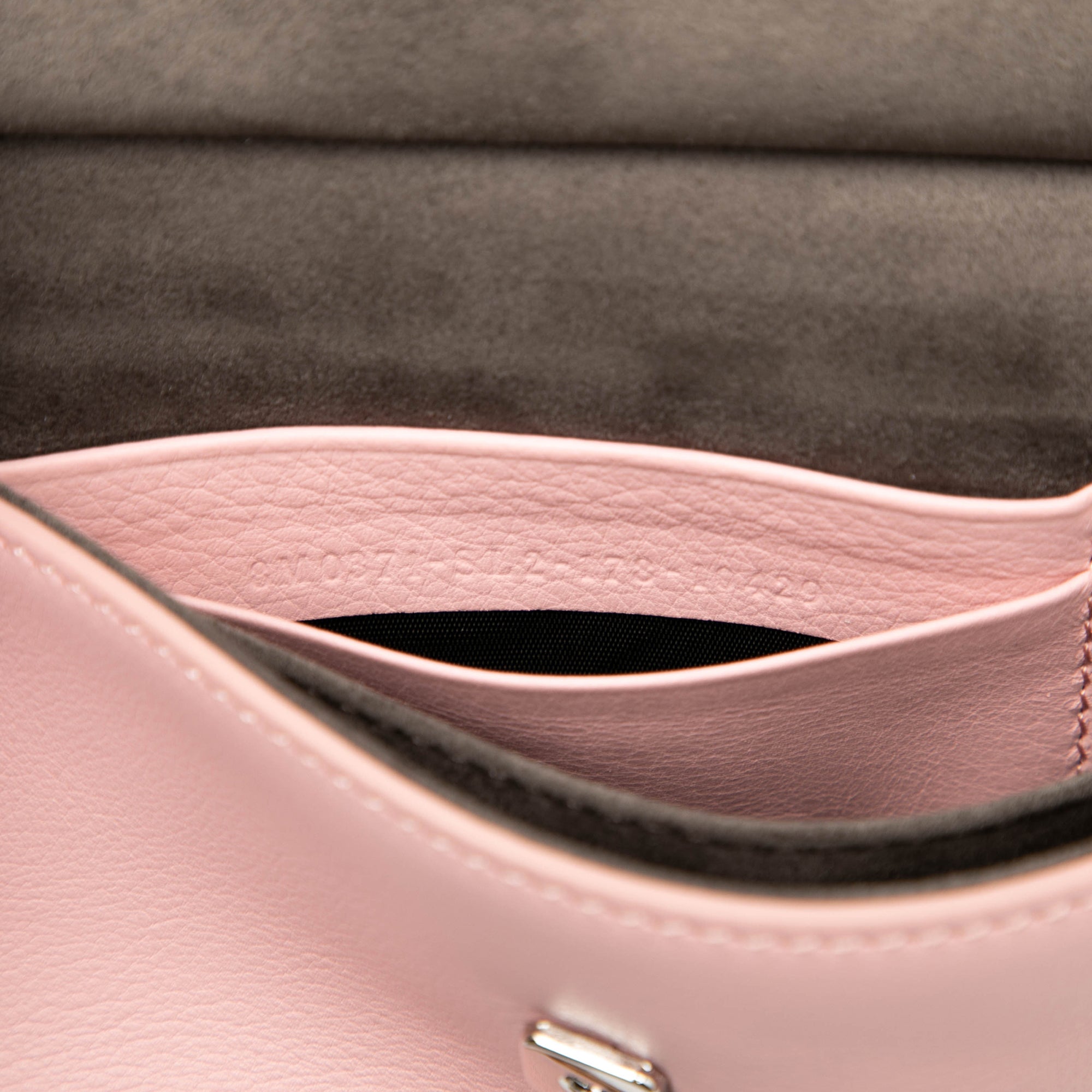 Product Details: Brown Fendi Micro Leather Hypnoteyes Double Baguette Satchel. The Micro Hypnoteyes Double Baguette features a leather body, a flat leather top handle with spike details, a detachable chain link strap with leather guard, front and back flaps with snap closures, and interior slip pockets. 4.3" L x 6.7" W x 2.4" D, 1.6" drop. Serial number 8M0371.