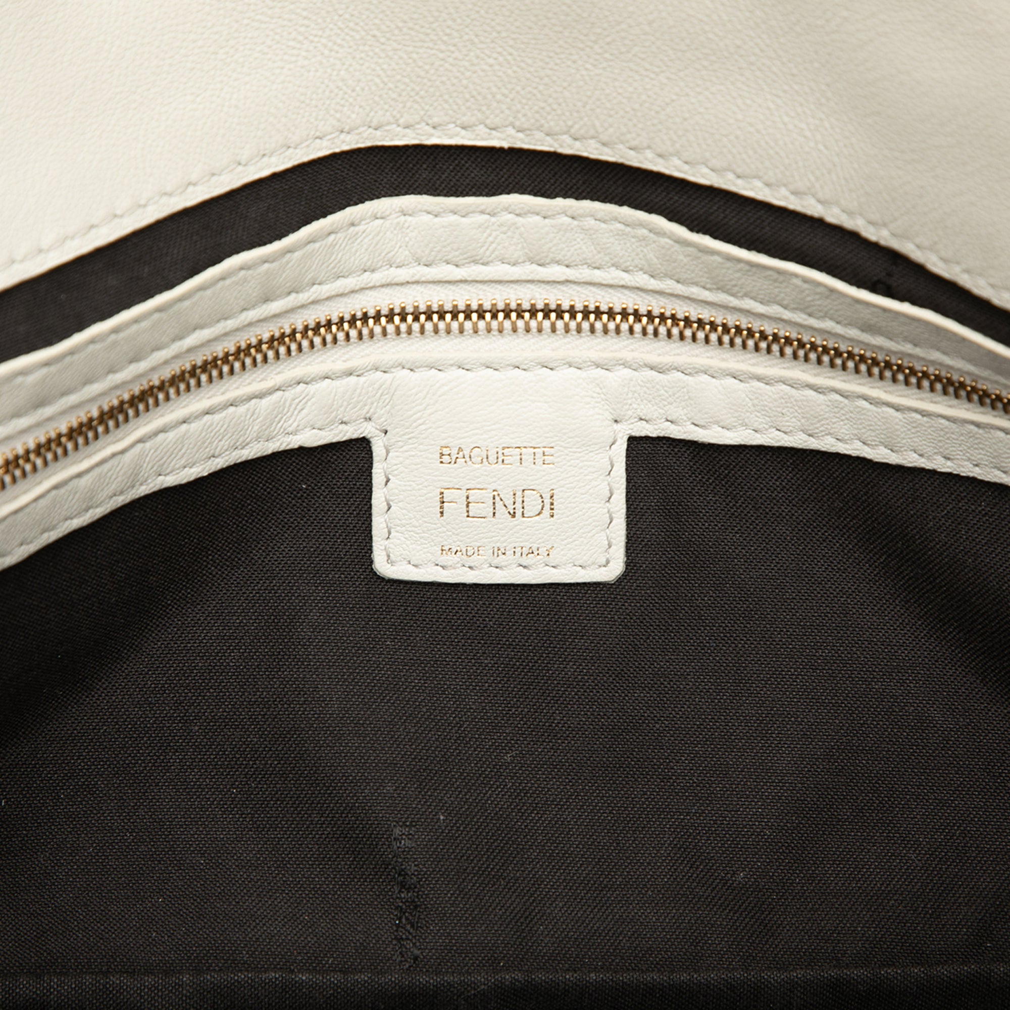 Product Details: White Fendi Zucca Embossed Leather Baguette Satchel. The Baguette satchel features an embossed leather body, a flat leather handle, a detachable flat leather shoulder strap, a front flap with magnetic snap closure, and an interior zip pocket. 7.1" L x 9.8" W x 2.4" D, 3.1" drop.