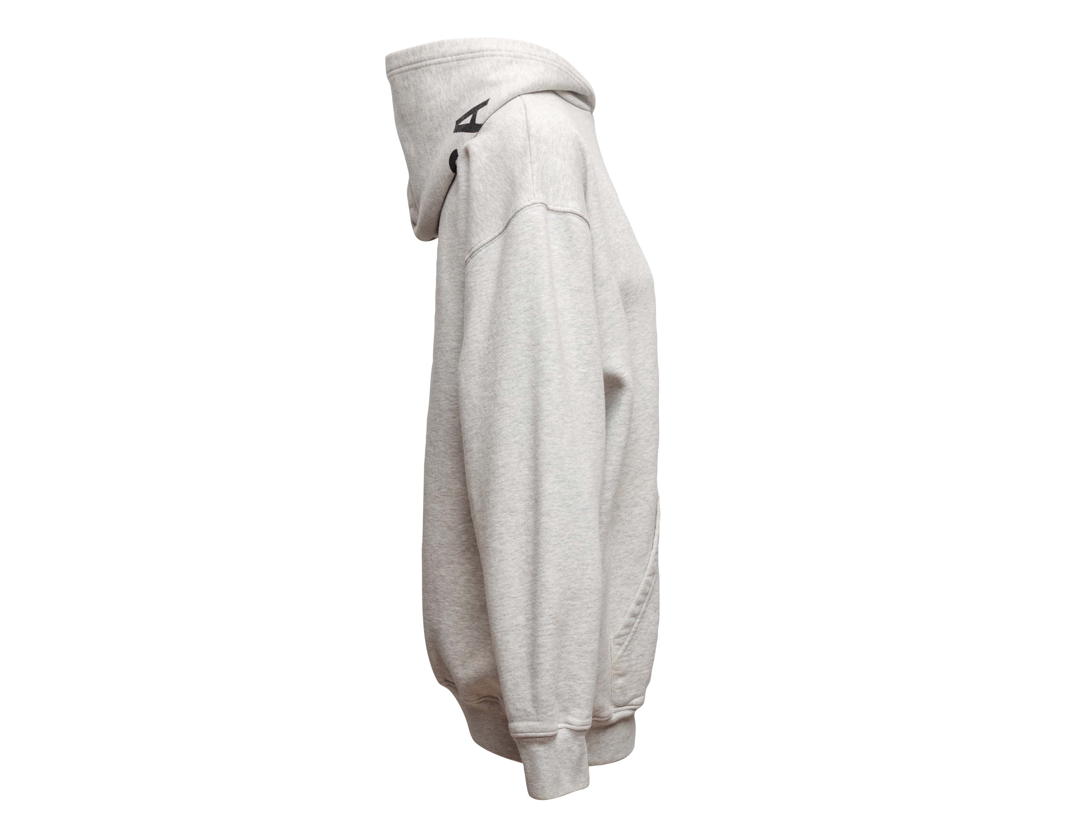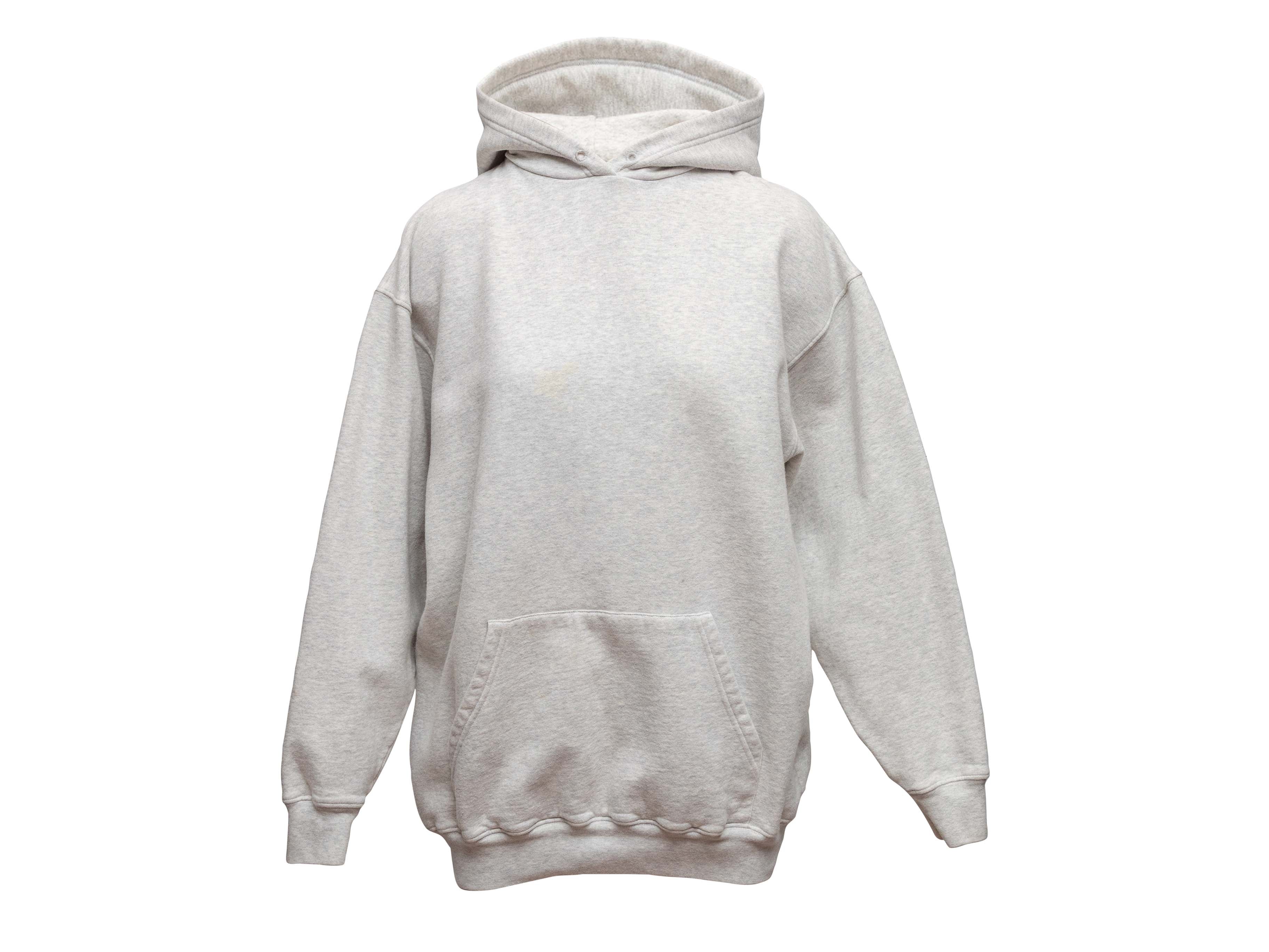 Product Details: Heather grey hoodie by Balenciaga. Kangaroo pocket at front. 38" bust, 20" shoulder width, 40" length.