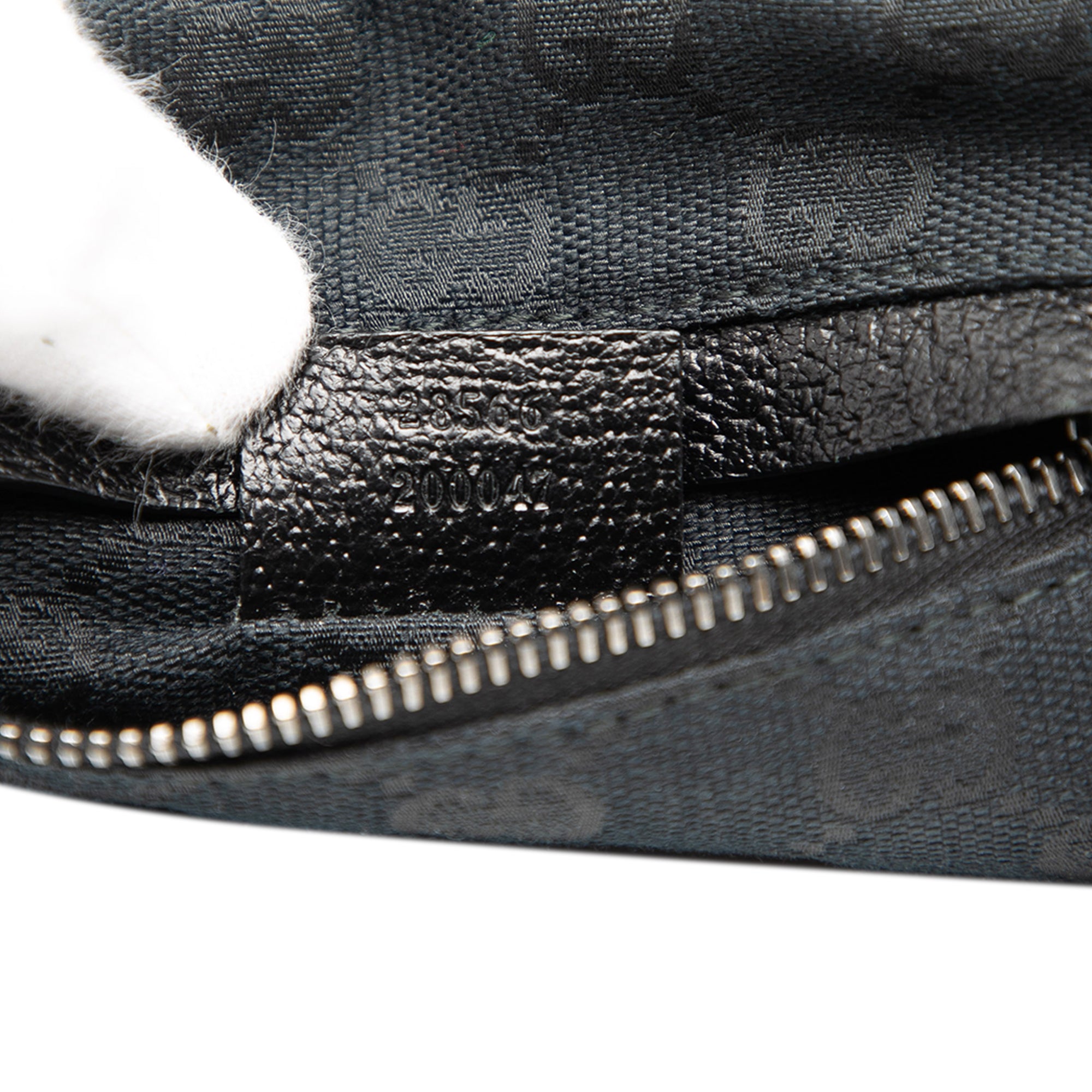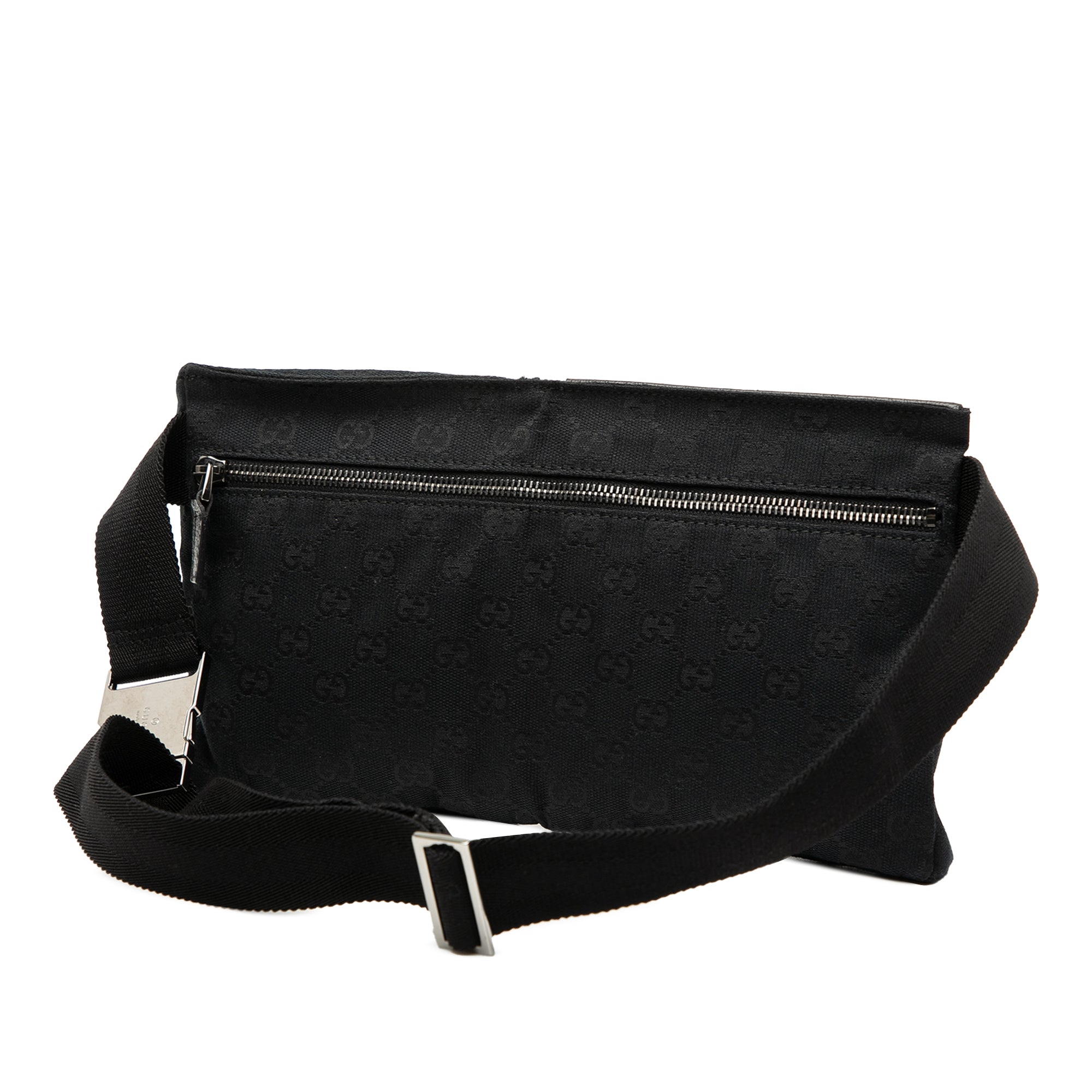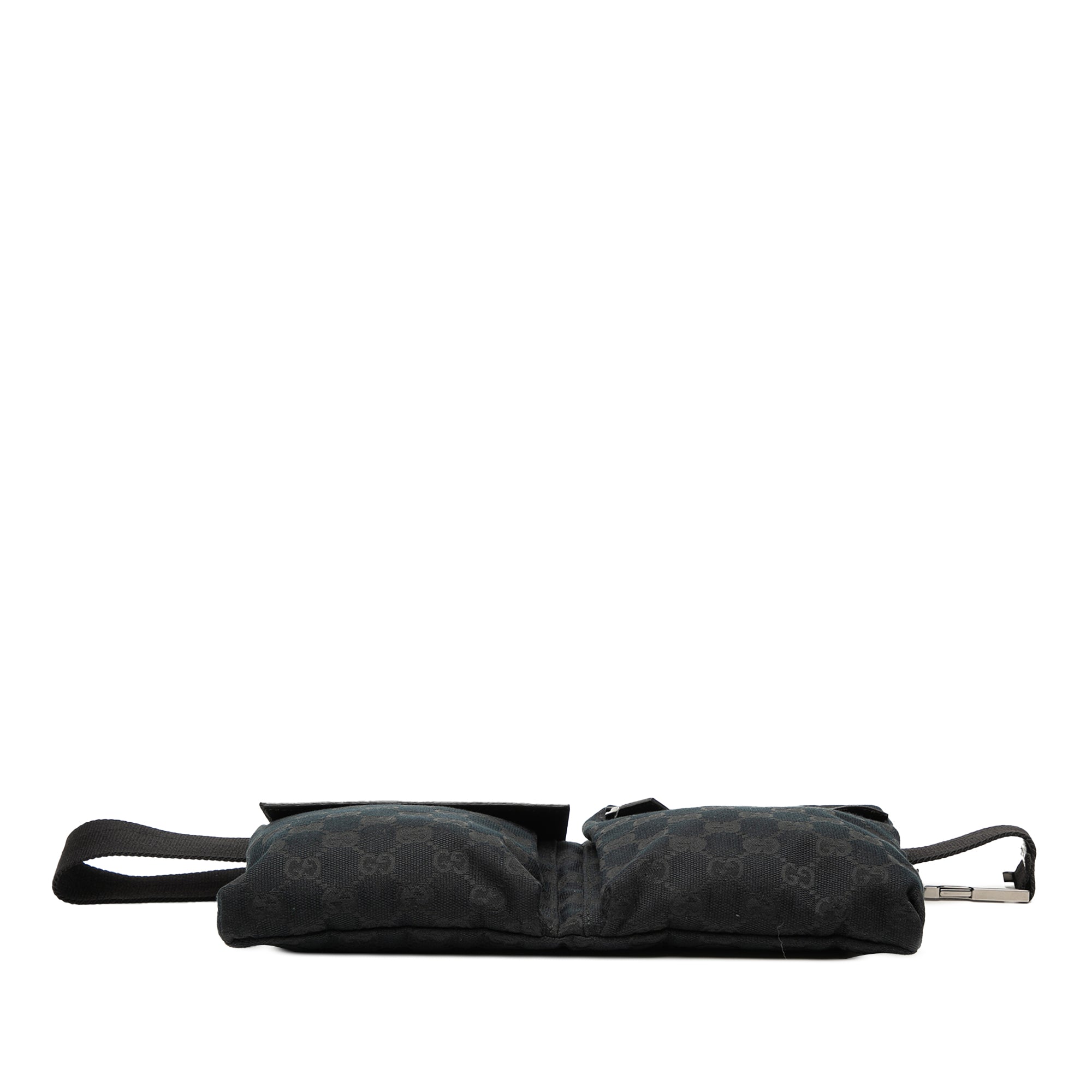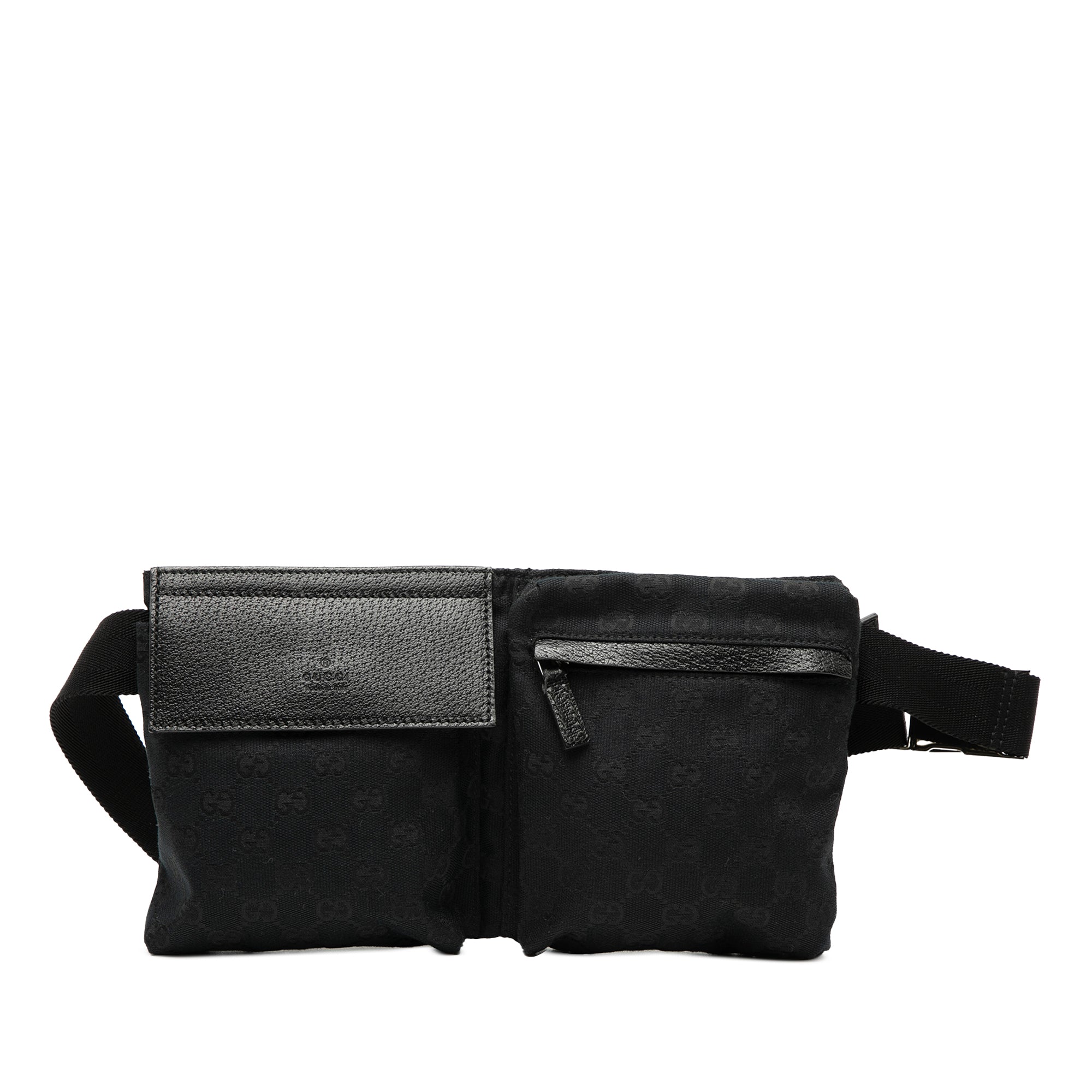 Product Details: Black Gucci GG Canvas Double Pocket Belt Bag. This belt bag features canvas body with leather trim, an adjustable waist strap, exterior front flap and zip compartments, and an exterior back zip pocket. 6.3" L x 11.4" W x 1" D, 44.9" drop. Serial number 28566 200047.