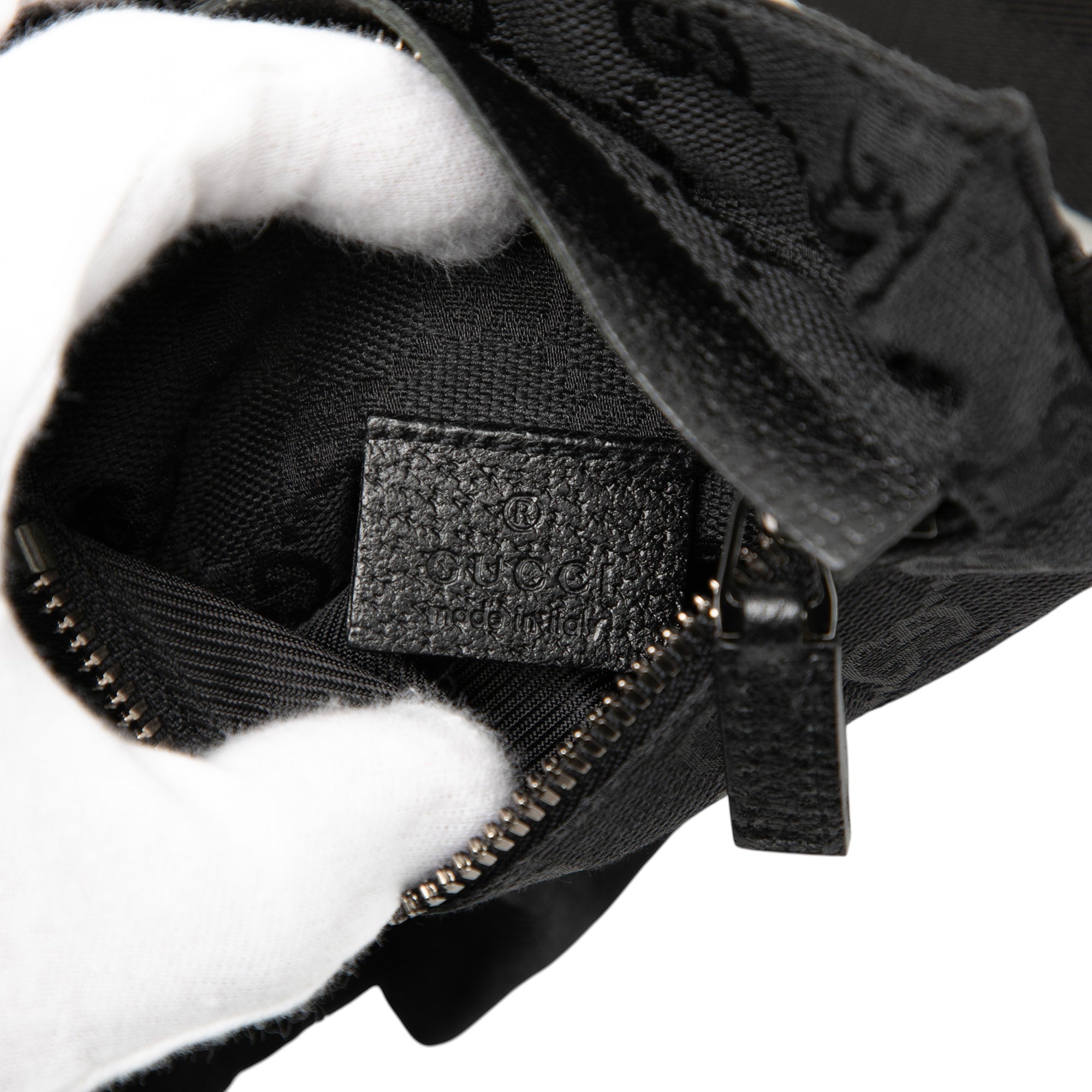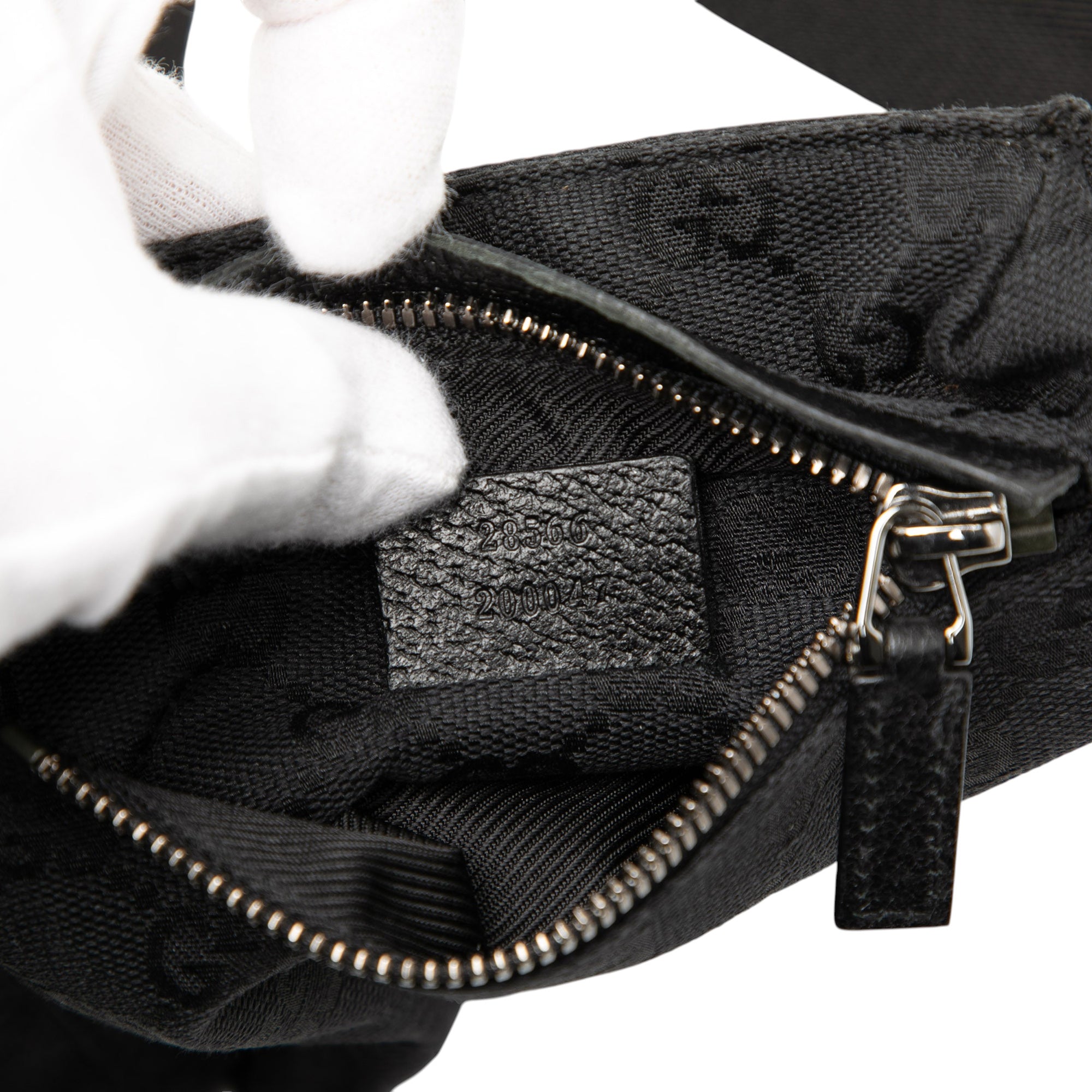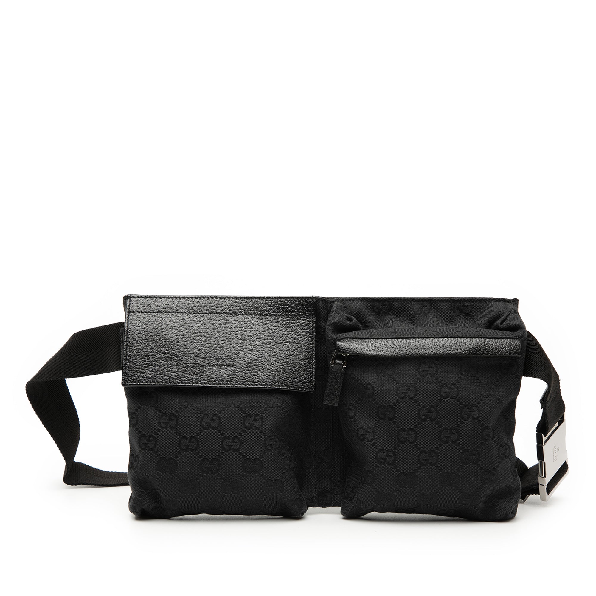 Product Details: Black Gucci GG Canvas Double Pocket Belt Bag. This belt bag features a canvas body, an adjustable waist strap, exterior front flap and zip compartments, and an exterior back zip pocket. 6.3" L x 11" W x 0.2" D. Serial number 28566 200047.