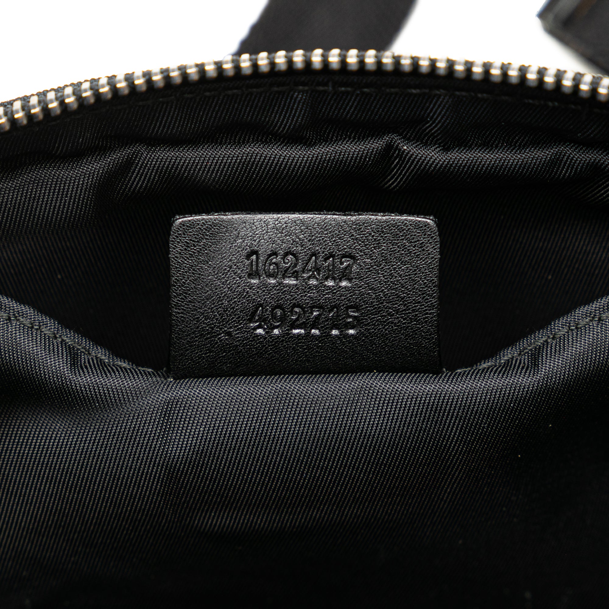 Product Details: Black Gucci Guccissima Nylon Trim Belt Bag. This belt bag features a nylon and leather body, exterior zip pocket, flat waist strap, top zip closure, and interior slip pocket. 4.7" L x 9.4" W x 1.2" D. Serial number 162417 492715.