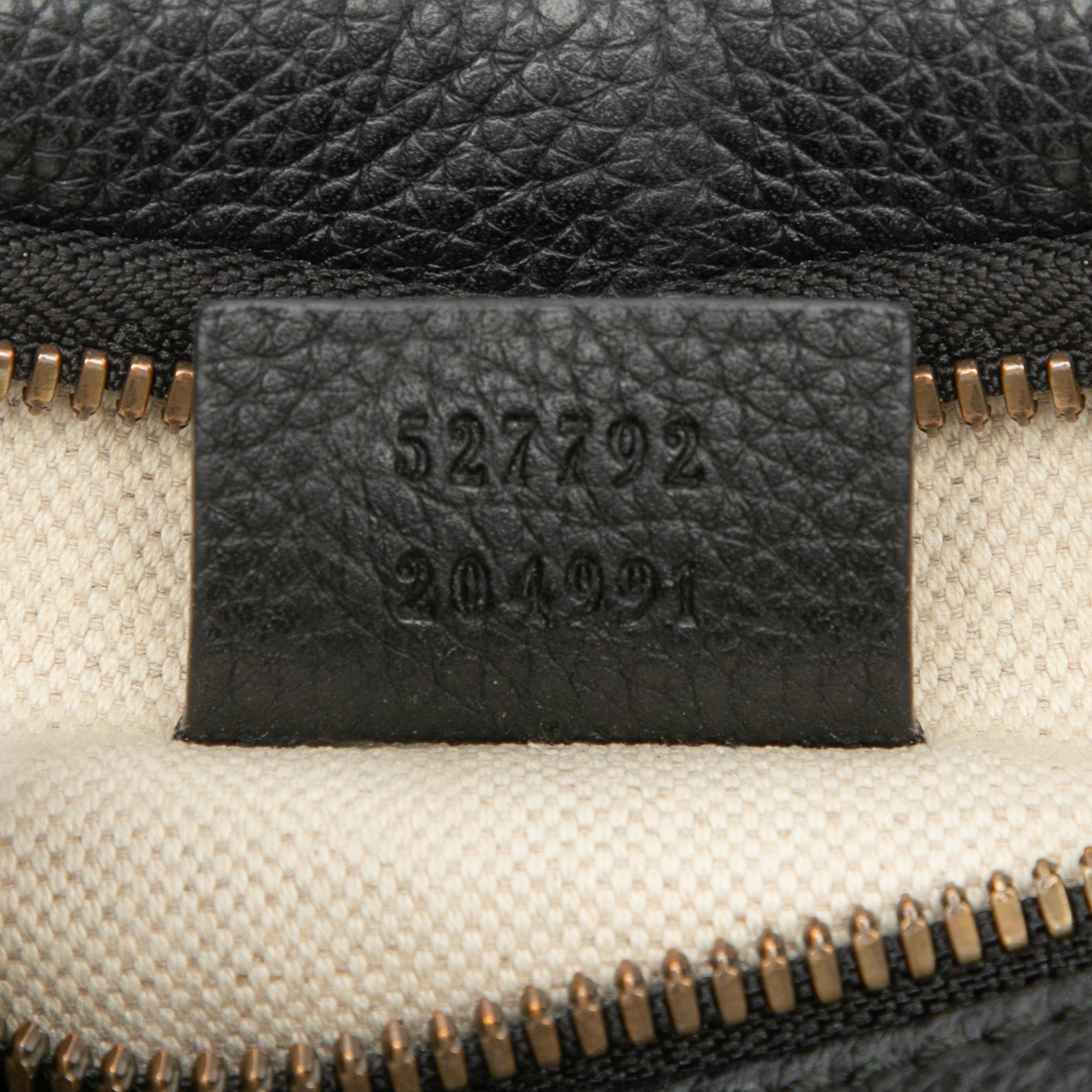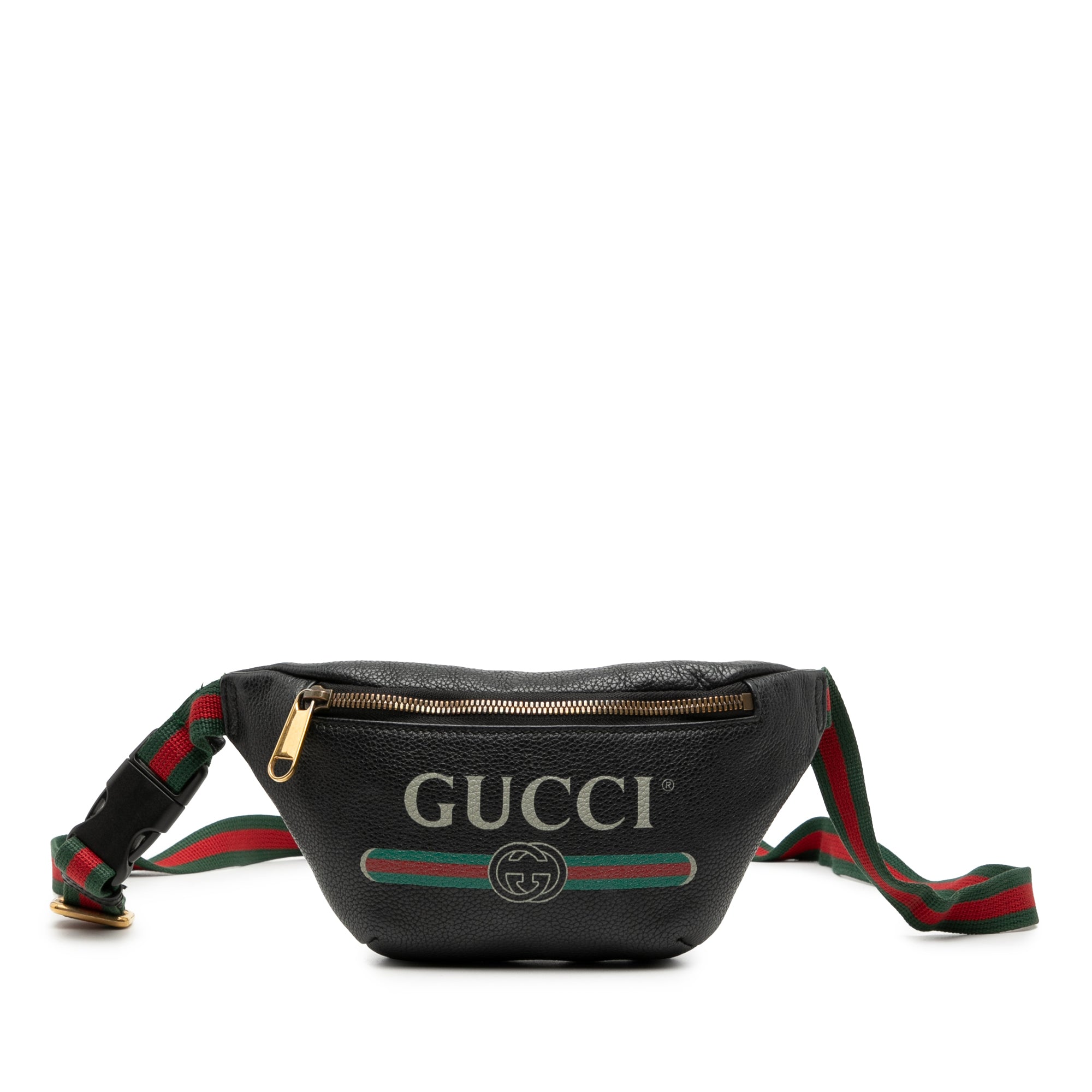 Product Details: Black Gucci Small Grained Calfskin Logo Belt Bag. The Logo Belt Bag features a printed leather body, an adjustable nylon strap with buckle closure, and top zip closure. 4.7" L x 8.7" W x 5.1" D. Serial number 527792 204991.