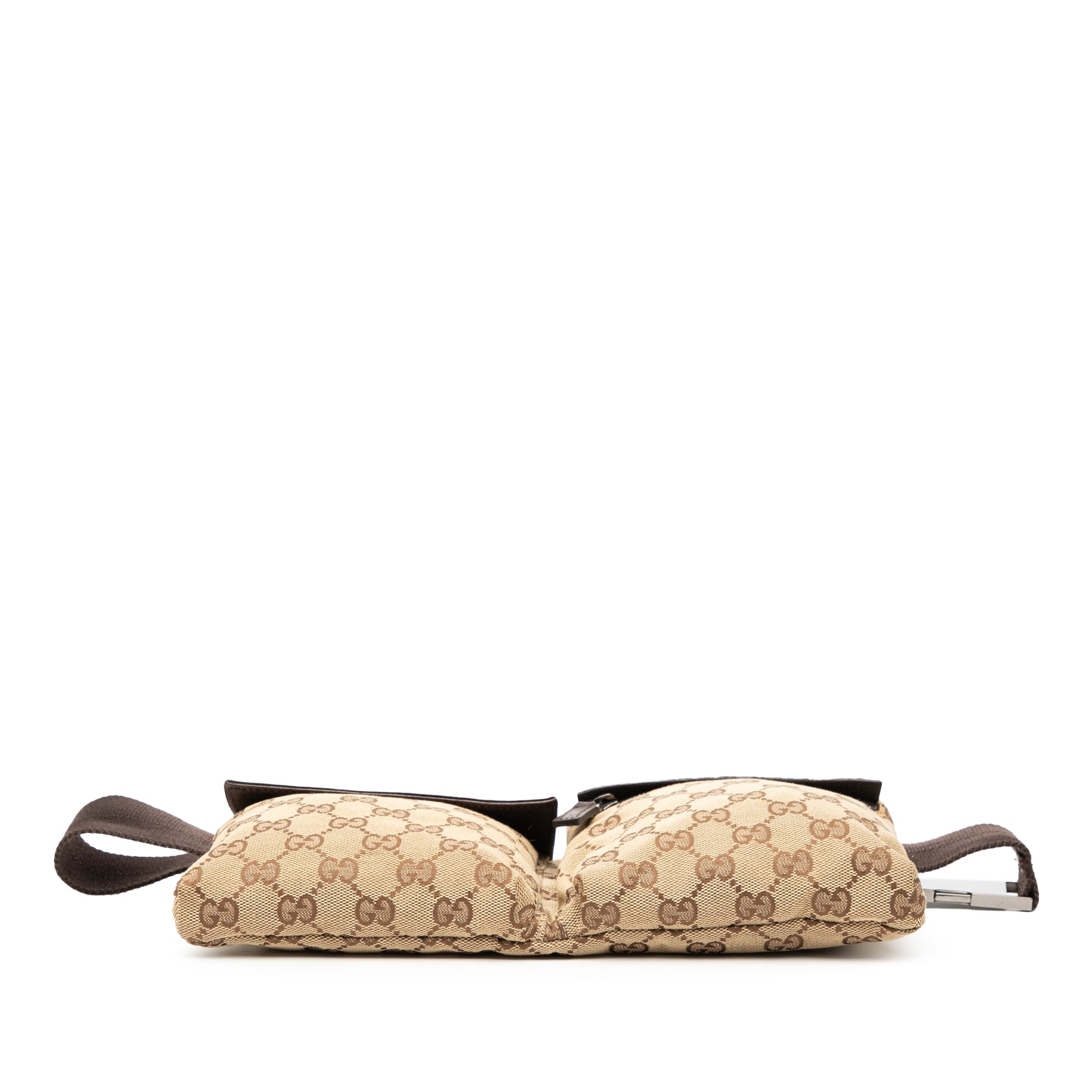 Product Details: Tan Gucci GG Canvas Double Pocket Belt Bag. This belt bag features a canvas body with leather trim, an adjustable flat waist strap, exterior front flap and zip compartments, and an exterior back zip pocket. 6.7" L x 11" W x 0.8" D. Serial number 28566 200047.