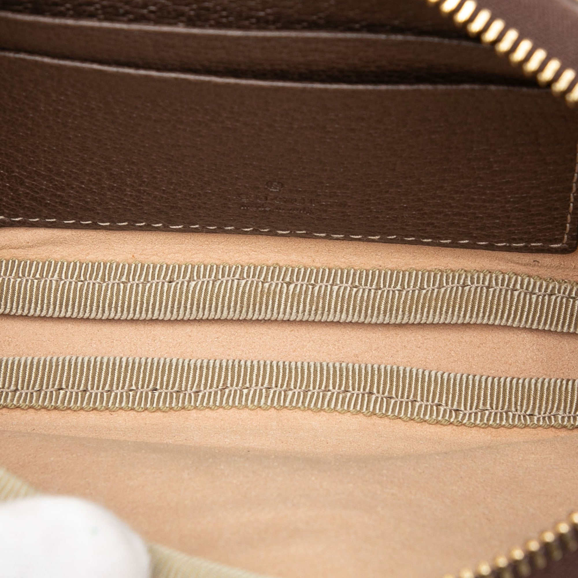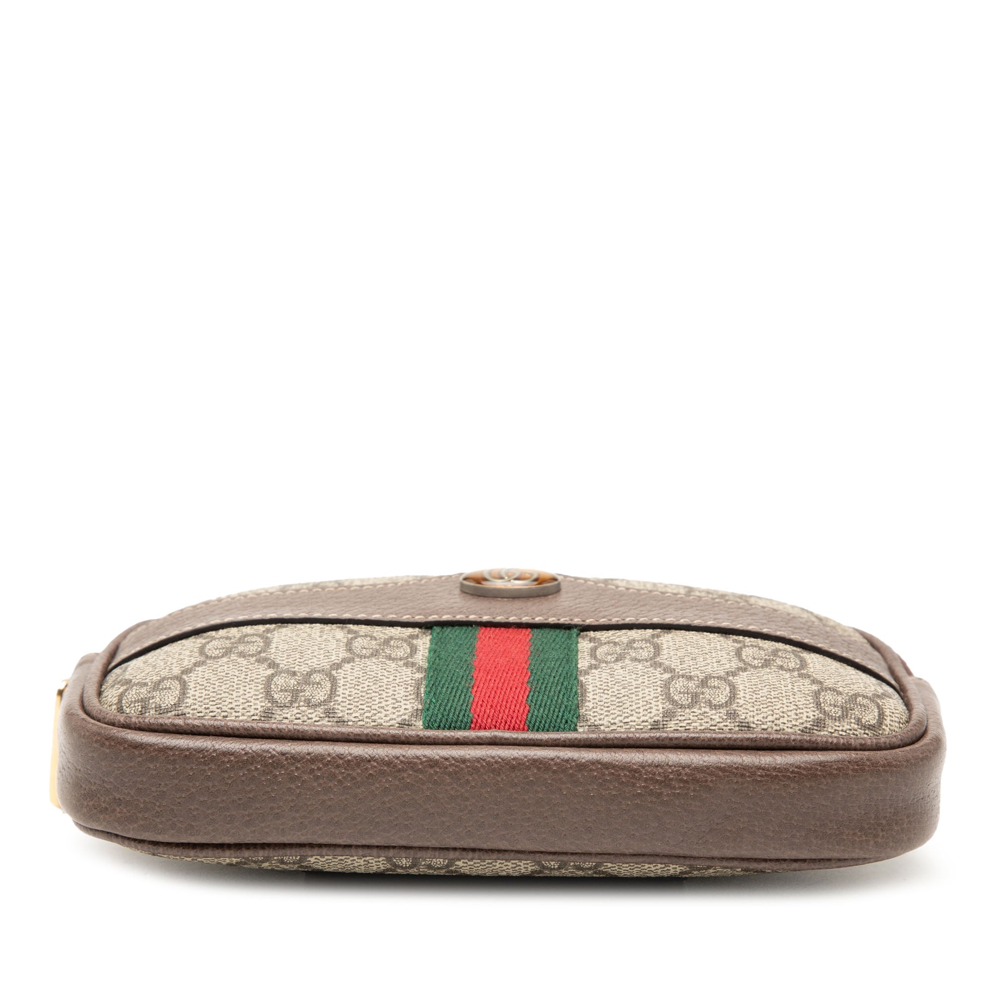 Product Details: Brown Gucci Small GG Supreme Web Ophidia Belt Bag. The Ophidia belt bag features a coated canvas body with leather trim, and web details, an adjustable flat leather waist strap, a top zip closure, and interior slip pockets. 3.9" L x 7.1" W x 1.2" D, 35.4" drop. Serial number 519308 493075.