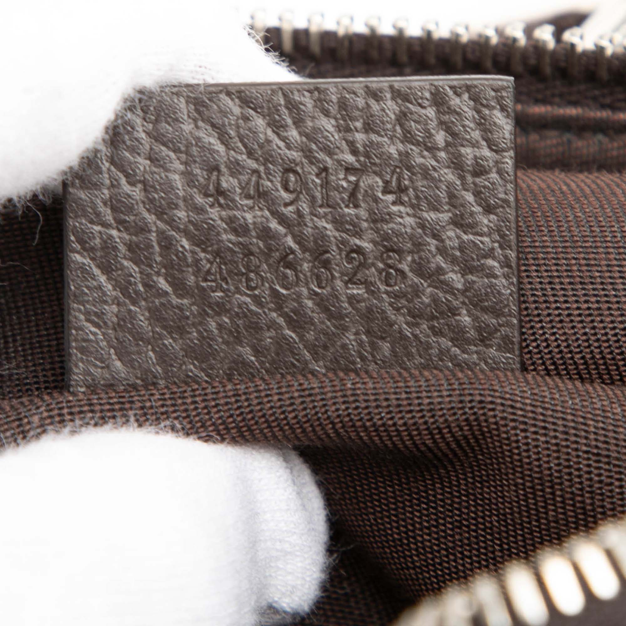 Product Details: Tan Gucci GG Canvas Belt Bag. This belt bag features a canvas body with leather trim, an adjustable waist strap with a buckle closure, a top zip closure, and an interior slip pocket. 5.5" L x 8.7" W x 1.8" D. Serial number 449174 486628.