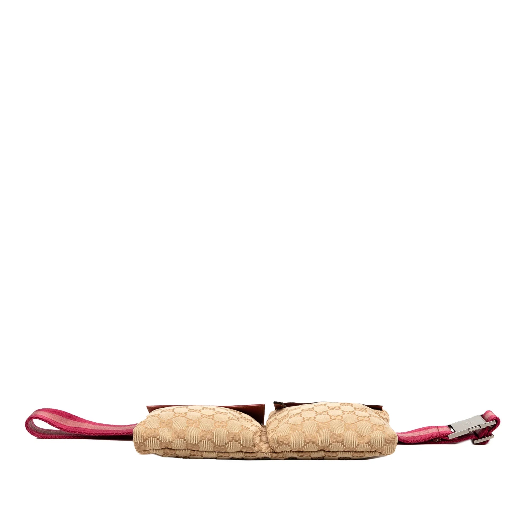 Product Details: Tan Gucci GG Canvas Web Double Pocket Belt Bag. This belt bag features a canvas body, an adjustable web canvas waist strap, a front exterior flap and zip pockets, and a back exterior zip pocket. 6.5" L x 11.2" W x 0.2" D. Serial number 28566.002122.