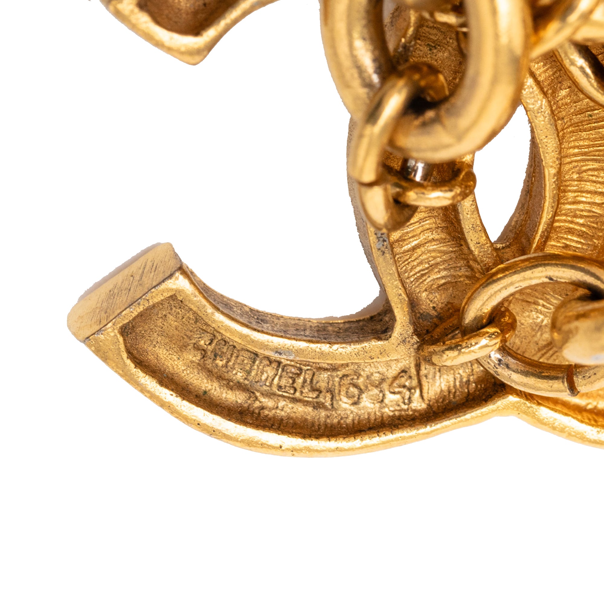 Product Details: Gold Chanel Gold Plated Triple CC Chain Belt. This belt features a gold-tone chain link body and a hook closure. 36.6" L x 1" W x 0" D.