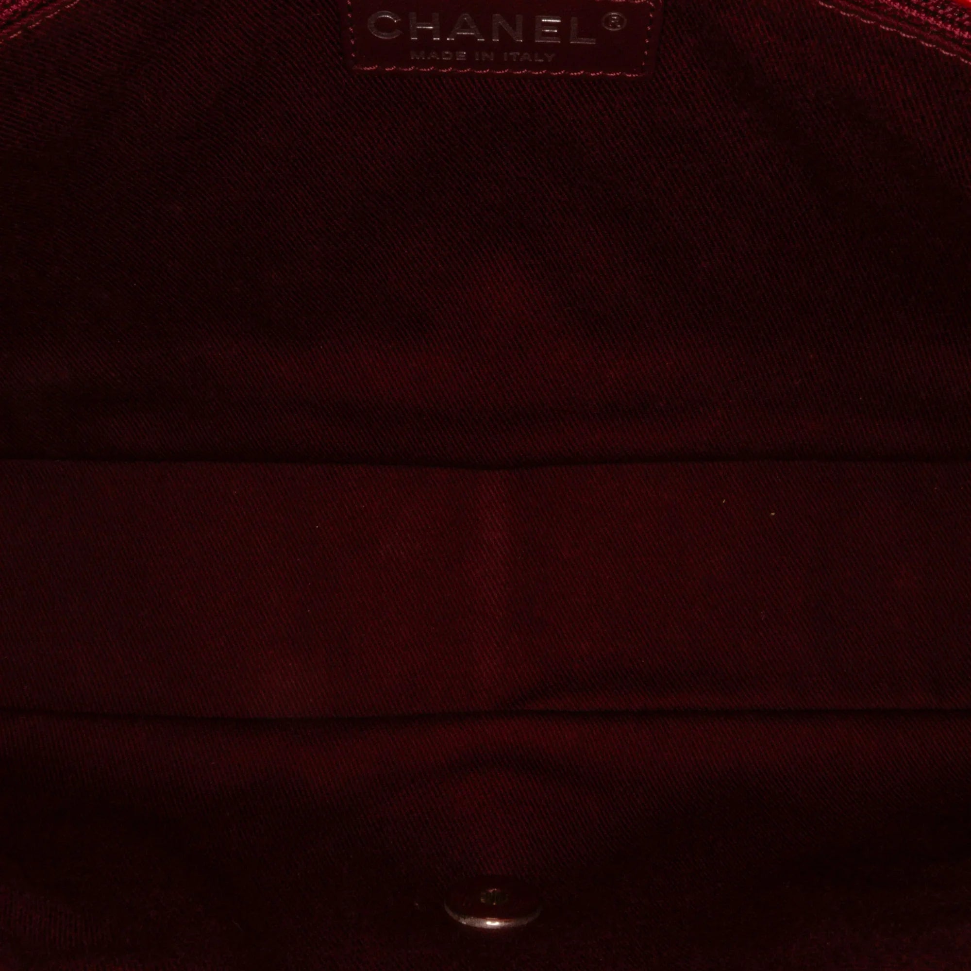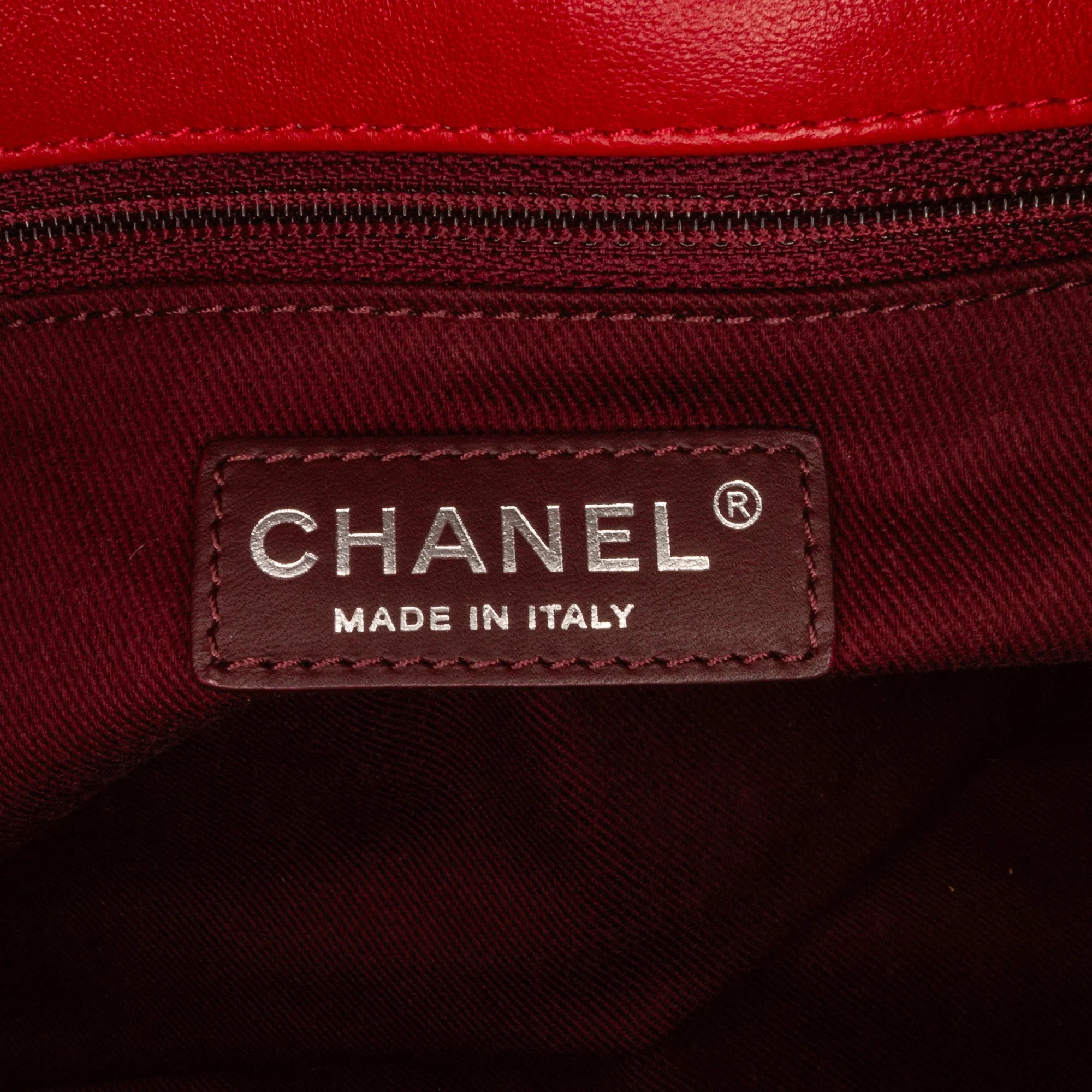 Product Details: Red Chanel Jumbo Classic Lambskin Double Flap Shoulder Bag. This shoulder bag features a quilted lambskin leather body, an exterior back slip pocket, velvet-woven chain straps, double front flaps with CC turnlock closure, and interior slip pockets. 7.7" L x 11.8" W x 3.9" D. Serial number 21467733.