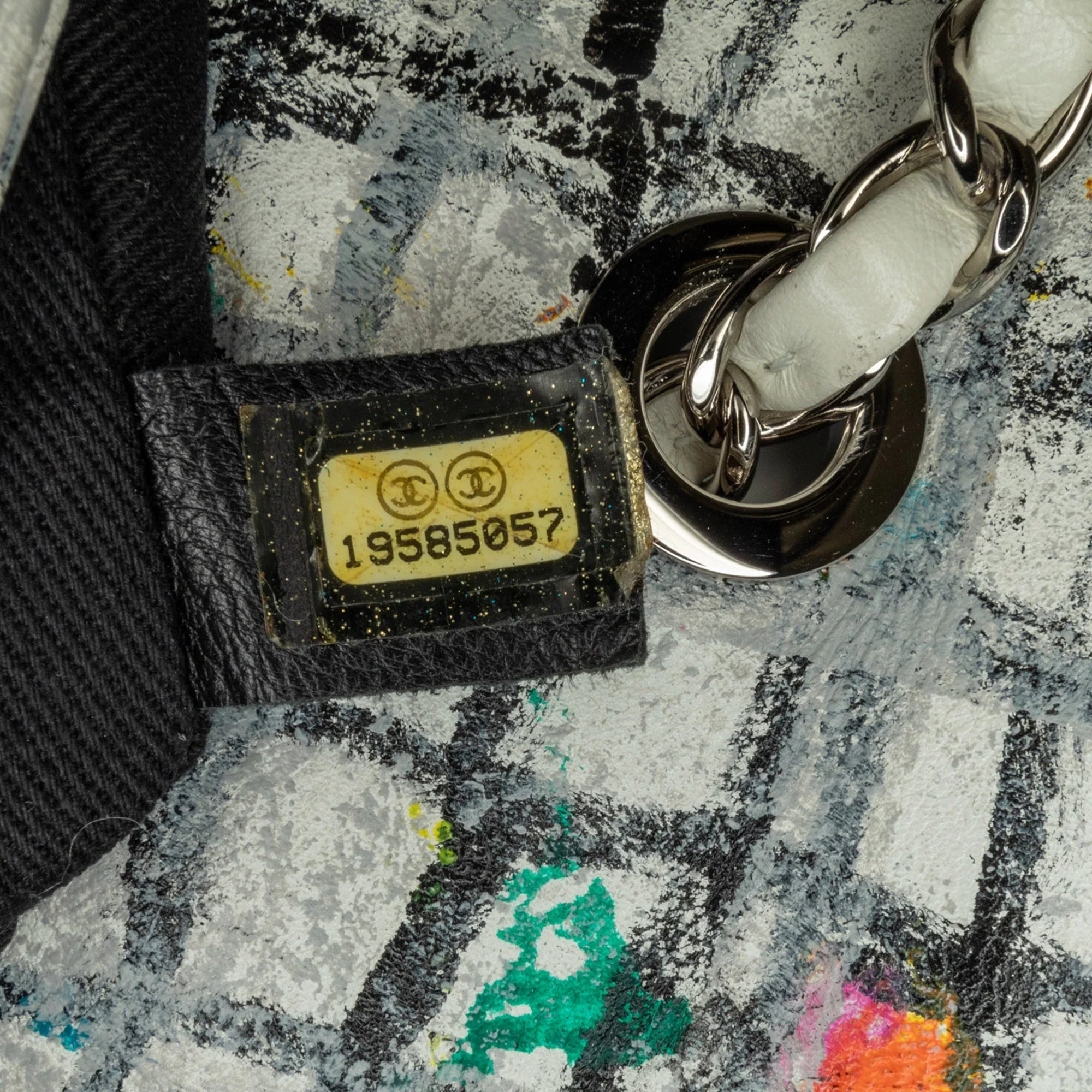 Product Details: White Chanel Medium Calfskin Hand Painted Graffiti Flap Shoulder Bag. This flap bag features a painted calfskin leather body, a leather woven shoulder strap, a front flap with push lock closure, and an interior zip pocket. 6.7" L x 13" W x 3.1" D, 10.2" drop. Serial number 19585057.