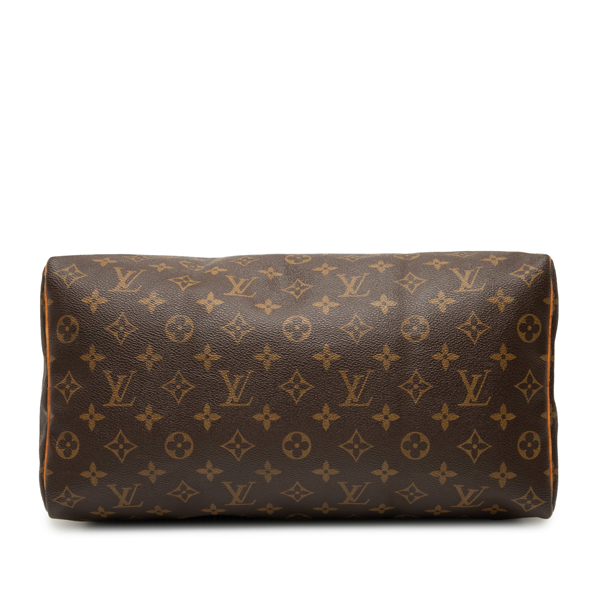 Product Details: Brown Louis Vuitton Monogram Speedy 35 Boston Bag. The Speedy 35 features a monogram canvas body with vachetta leather trim, rolled vachetta leather handles, a top zip closure, and an interior slip pocket. 9.1" L x 13.8" W x 7.1" D, 3.3" drop. Serial number SP0949.