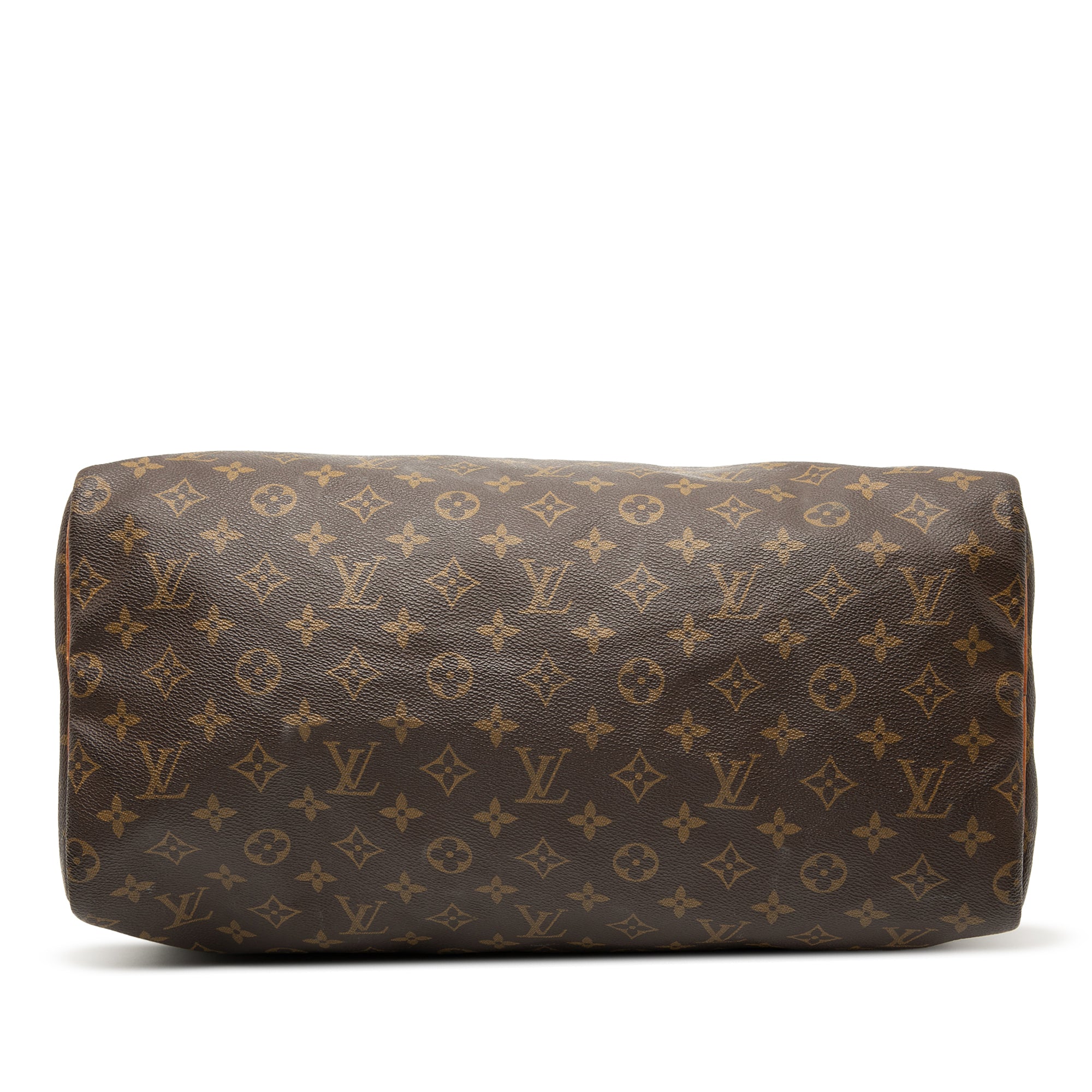 Product Details: Brown Louis Vuitton Monogram Speedy 40 Boston Bag. The Speedy 40 features a monogram canvas body, rolled vachetta leather handles, a top zip closure, and an interior slip pocket. The straps were repainted. 10" L x 16.1" W x 7.5" D, 3.5" drop. Serial number VI862.