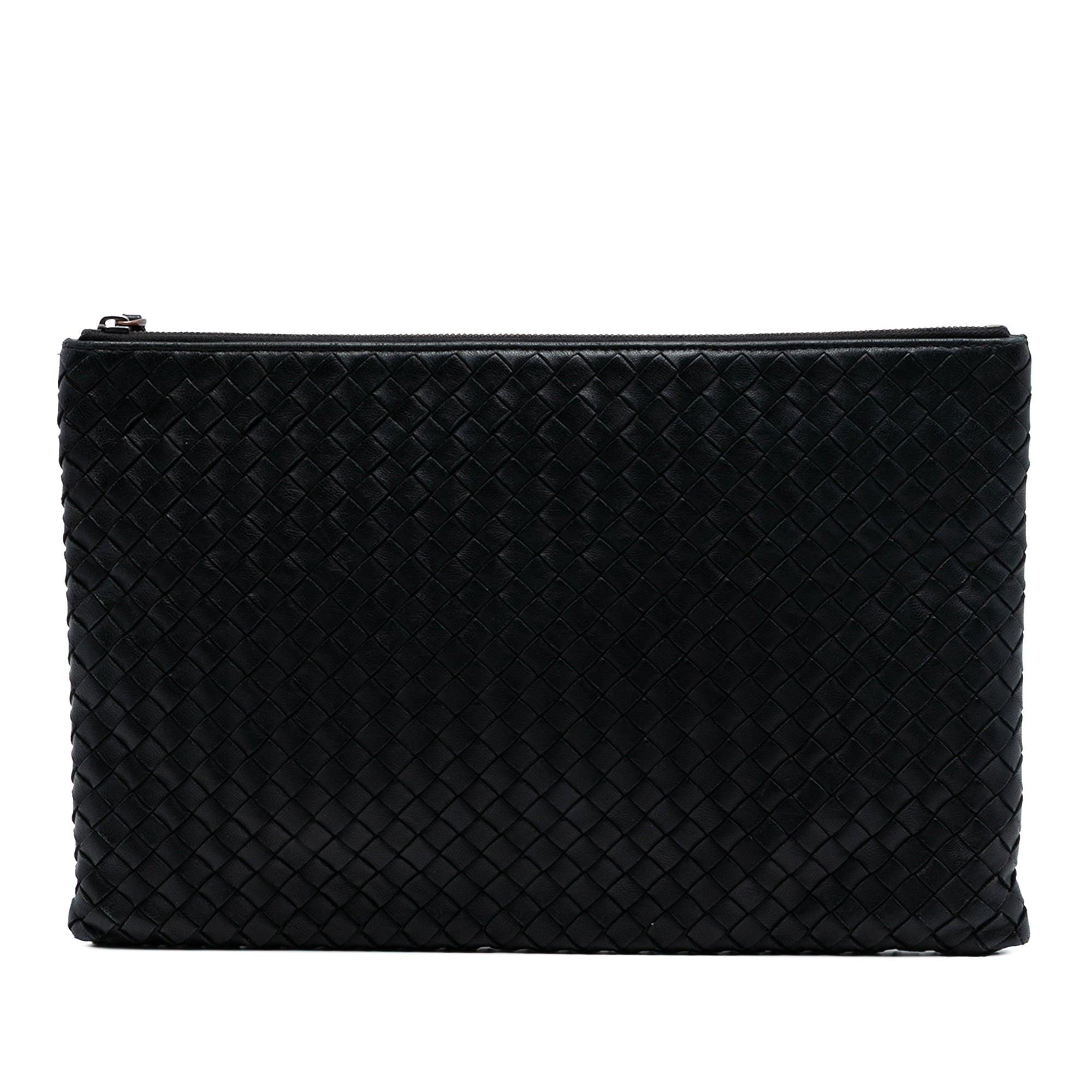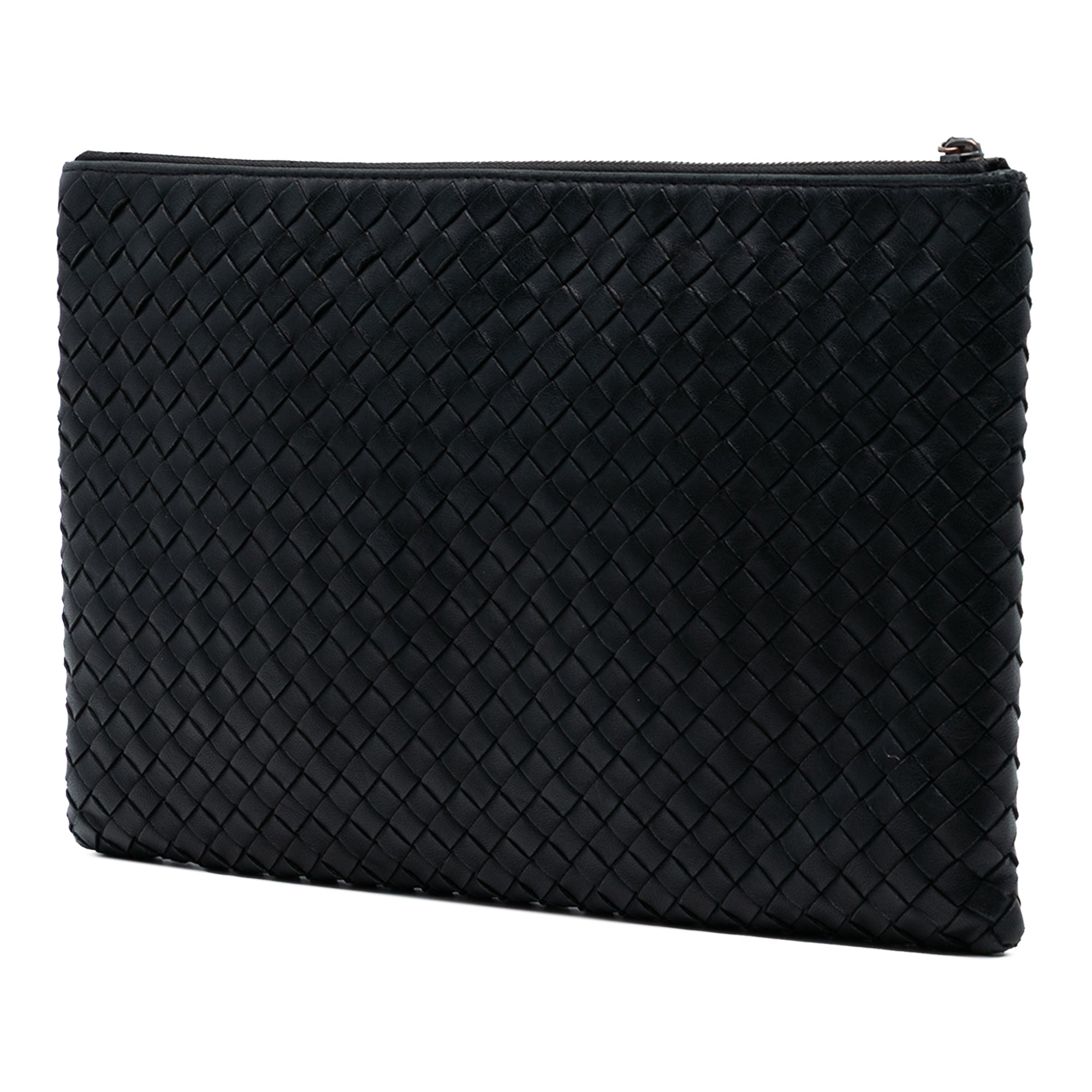 Product Details: Black Bottega Veneta Nappa Intrecciato Clutch. This clutch bag features a woven leather body and a top zip closure. 7.5" L x 11.6" W x 0.6" D. Serial number B06773260C.