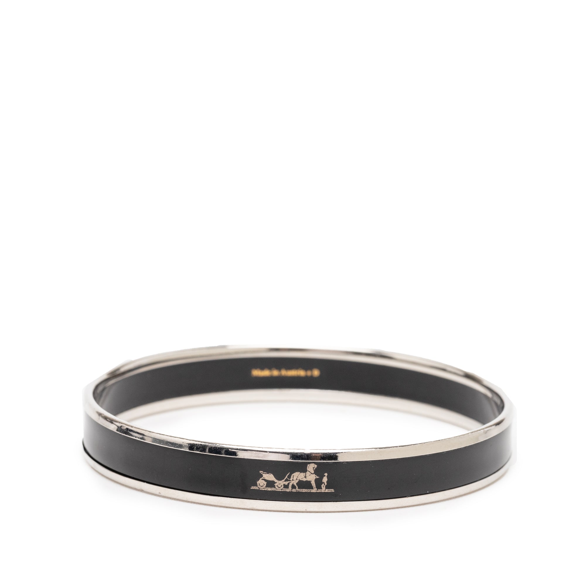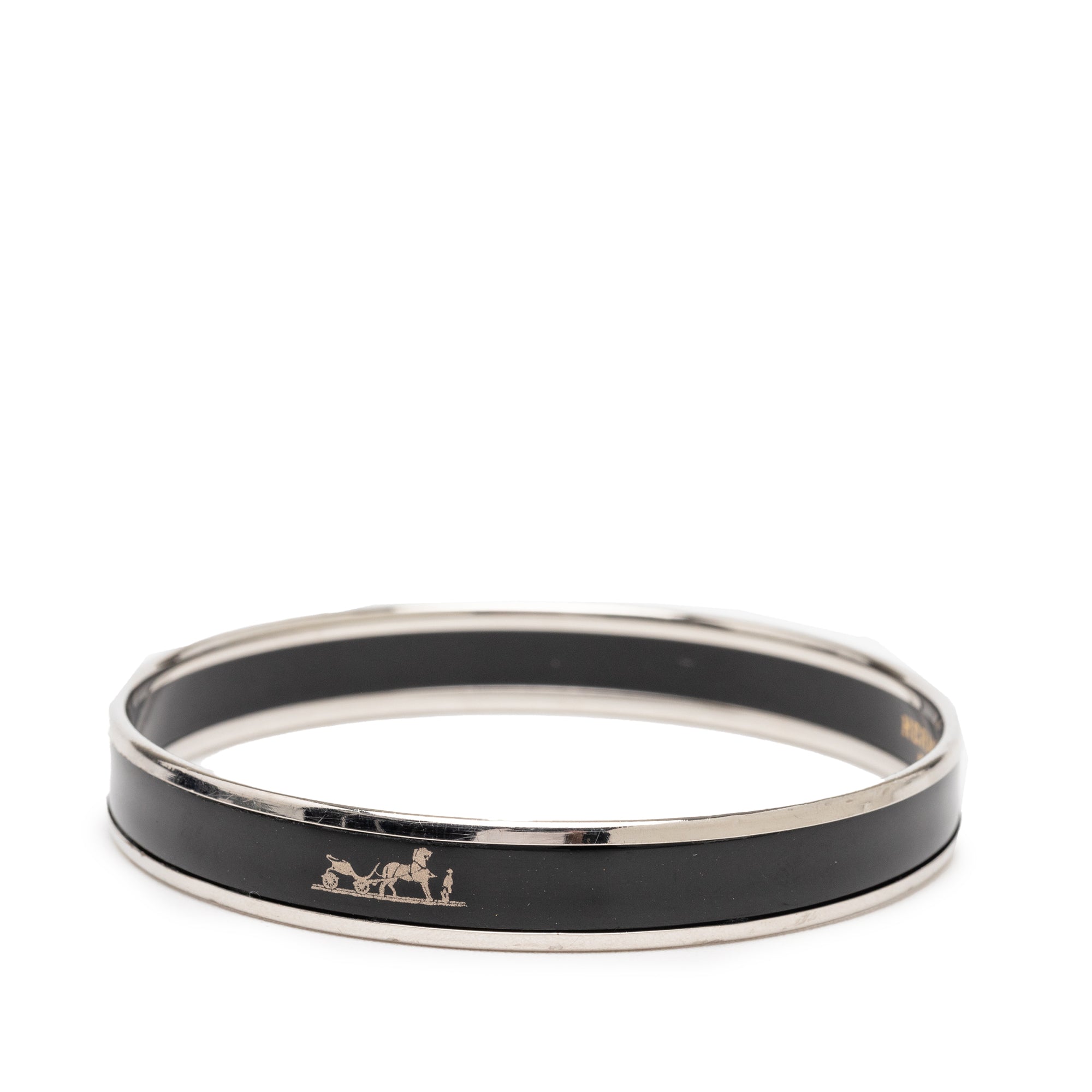 Product Details: Black Hermès Narrow Caleche Enamel Bangle 62 Costume Bracelet. This bracelet features a printed enamel and palladium plated body. 7.6" L x 2.4" W x 0" D.