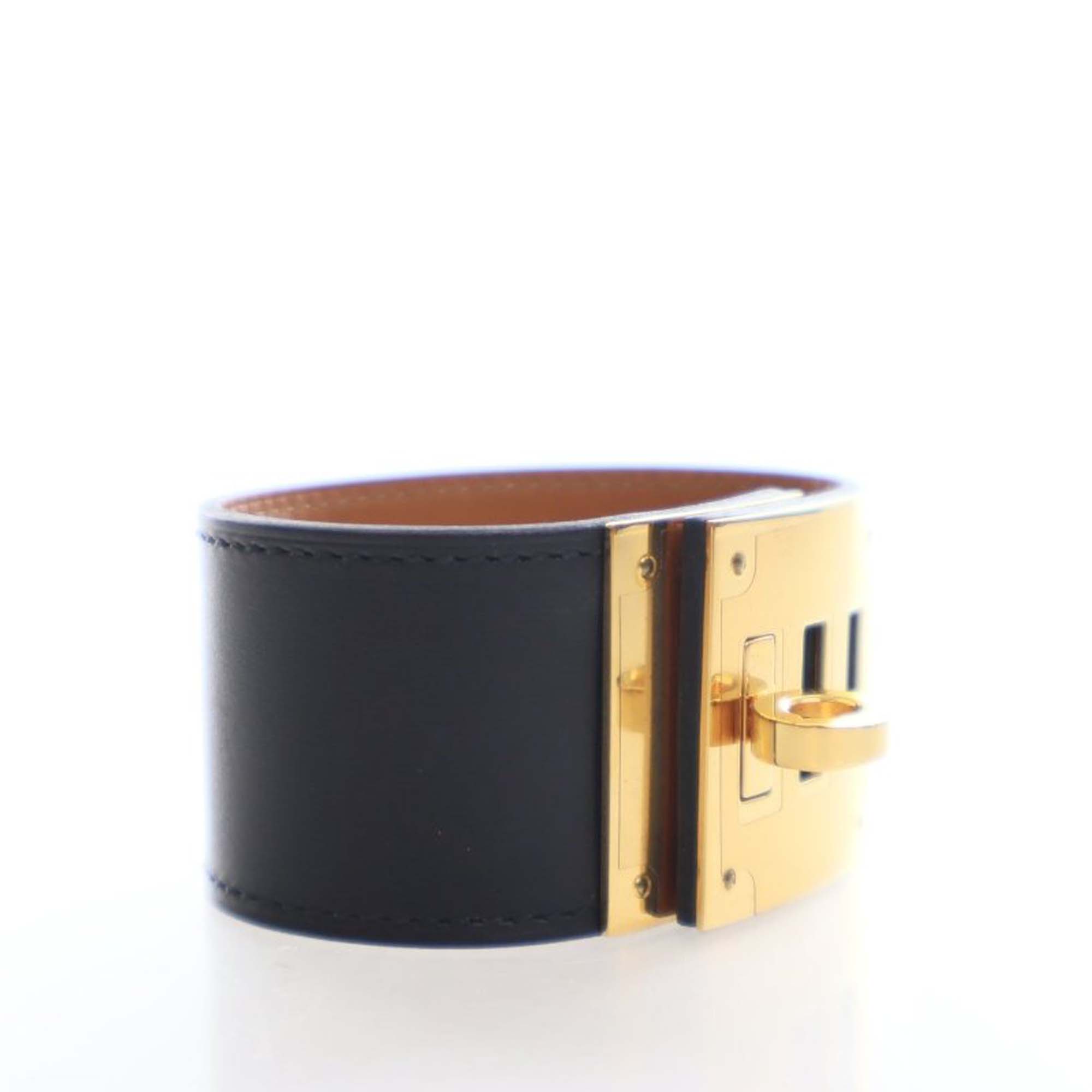 Product Details: Black Hermès Swift and Gold Plated Kelly Extreme Dog Bracelet. This bracelet features a swift leather wrist strap, gold plated hardware, and turn lock closure. 8.3" L x 2" W x 0" D. Serial number ⬜Q.