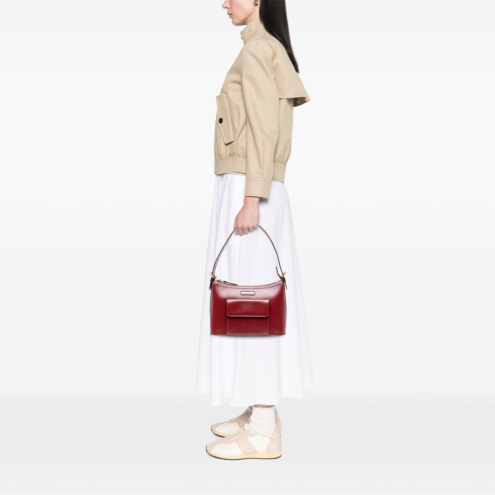 Product Details: Red Burberry Leather Shoulder Bag. This shoulder bag features a leather body, a flat leather strap, a top zip closure, an exterior front flap pocket, and interior zip and slip pockets. 7.1" L x 10.8" W x 4.9" D, 9.3" drop.
