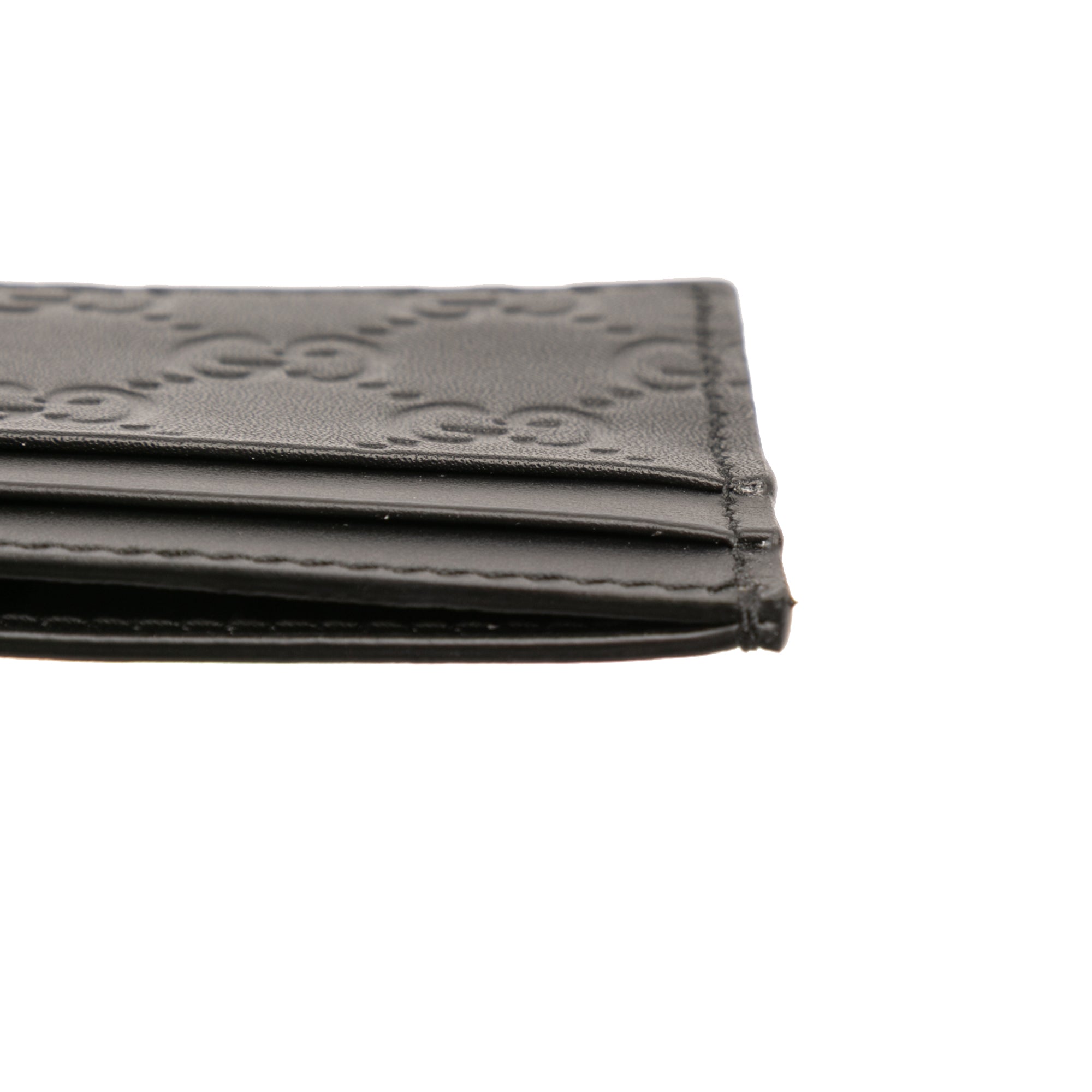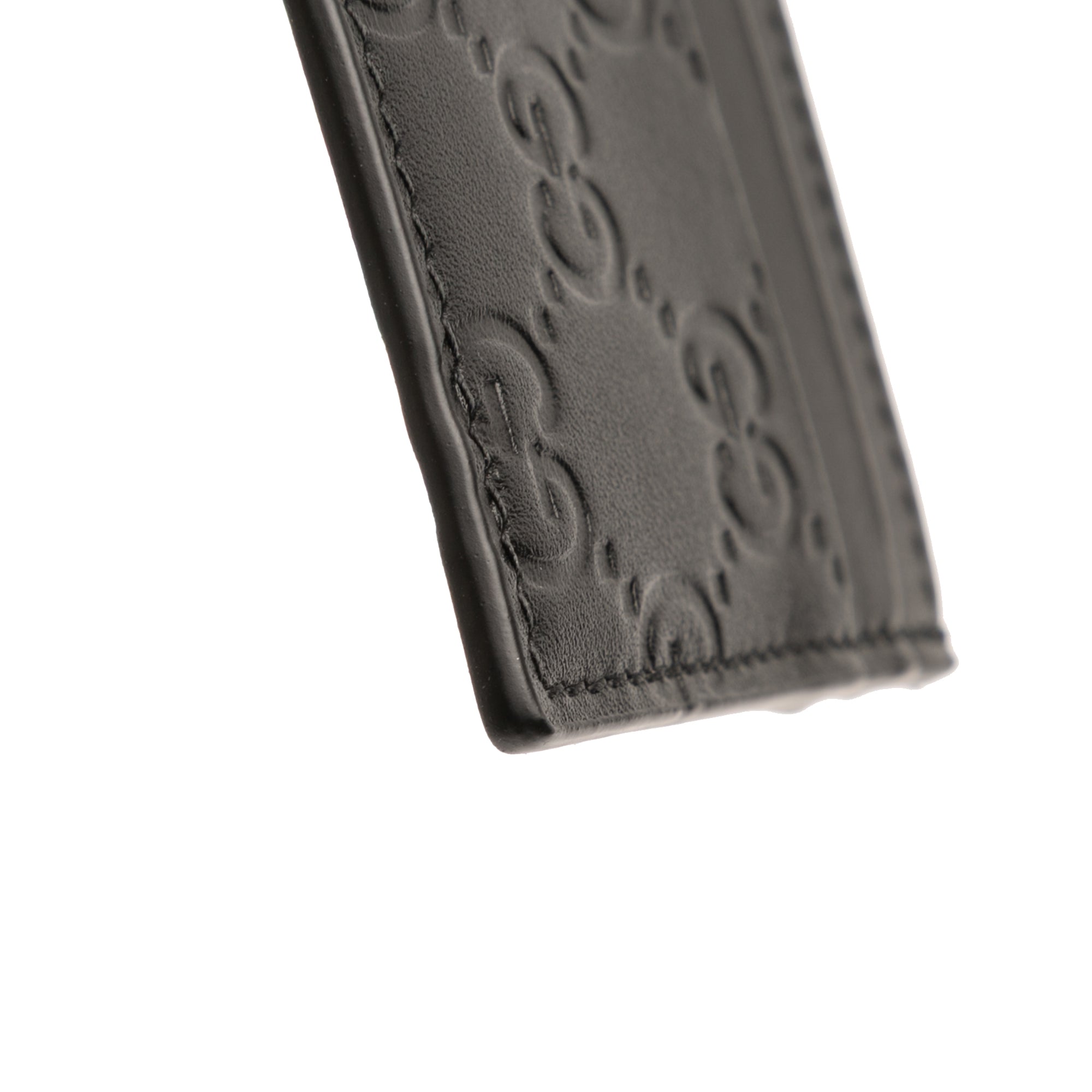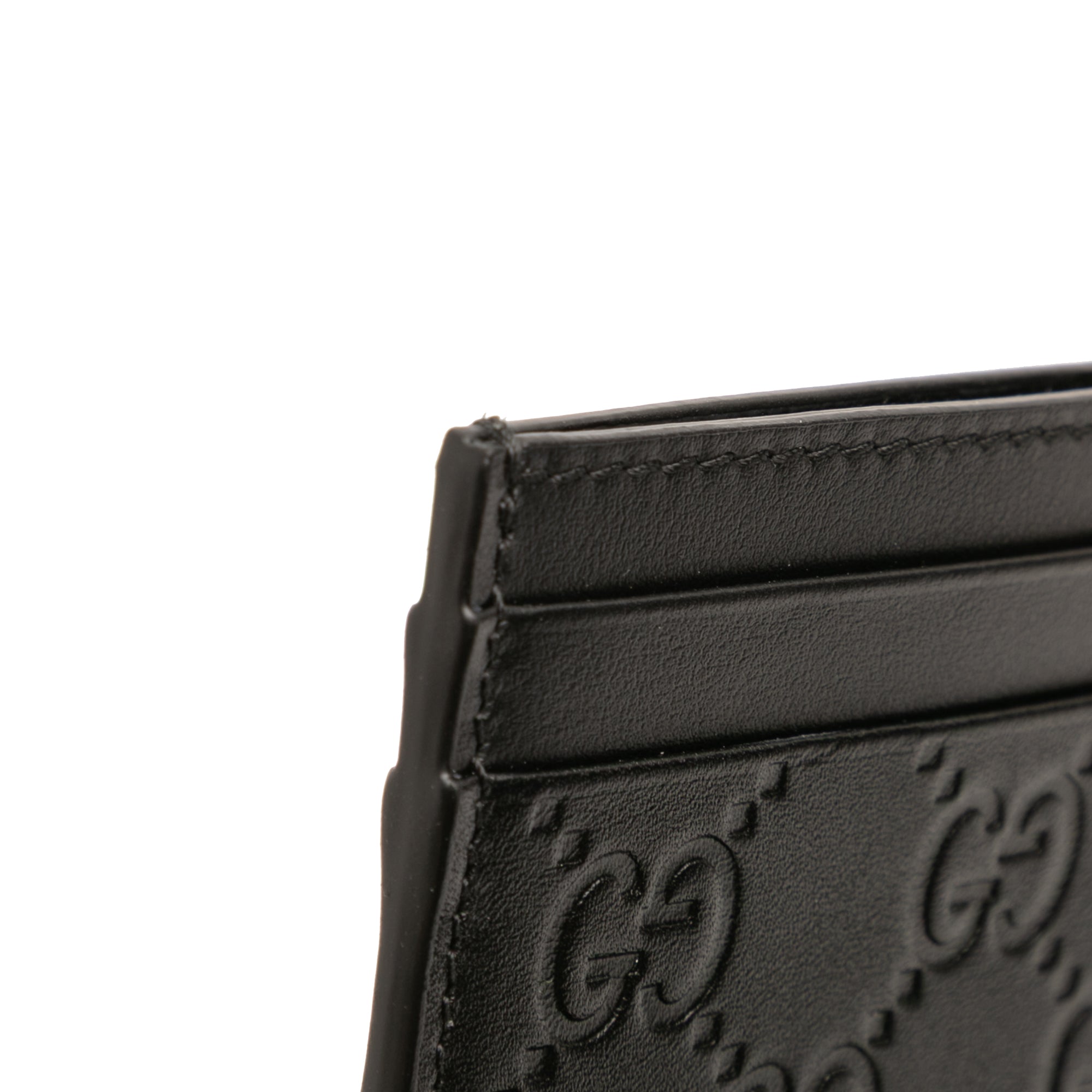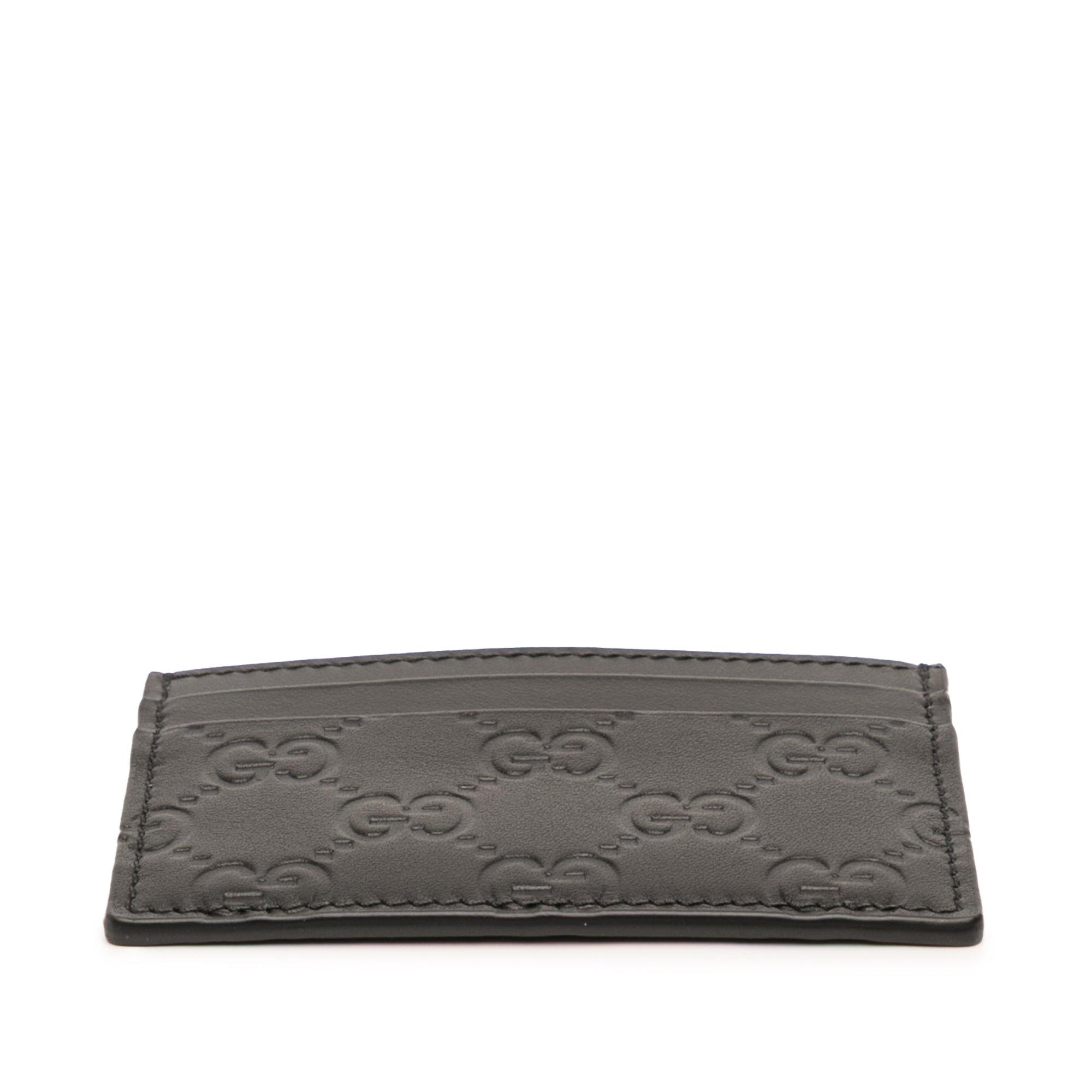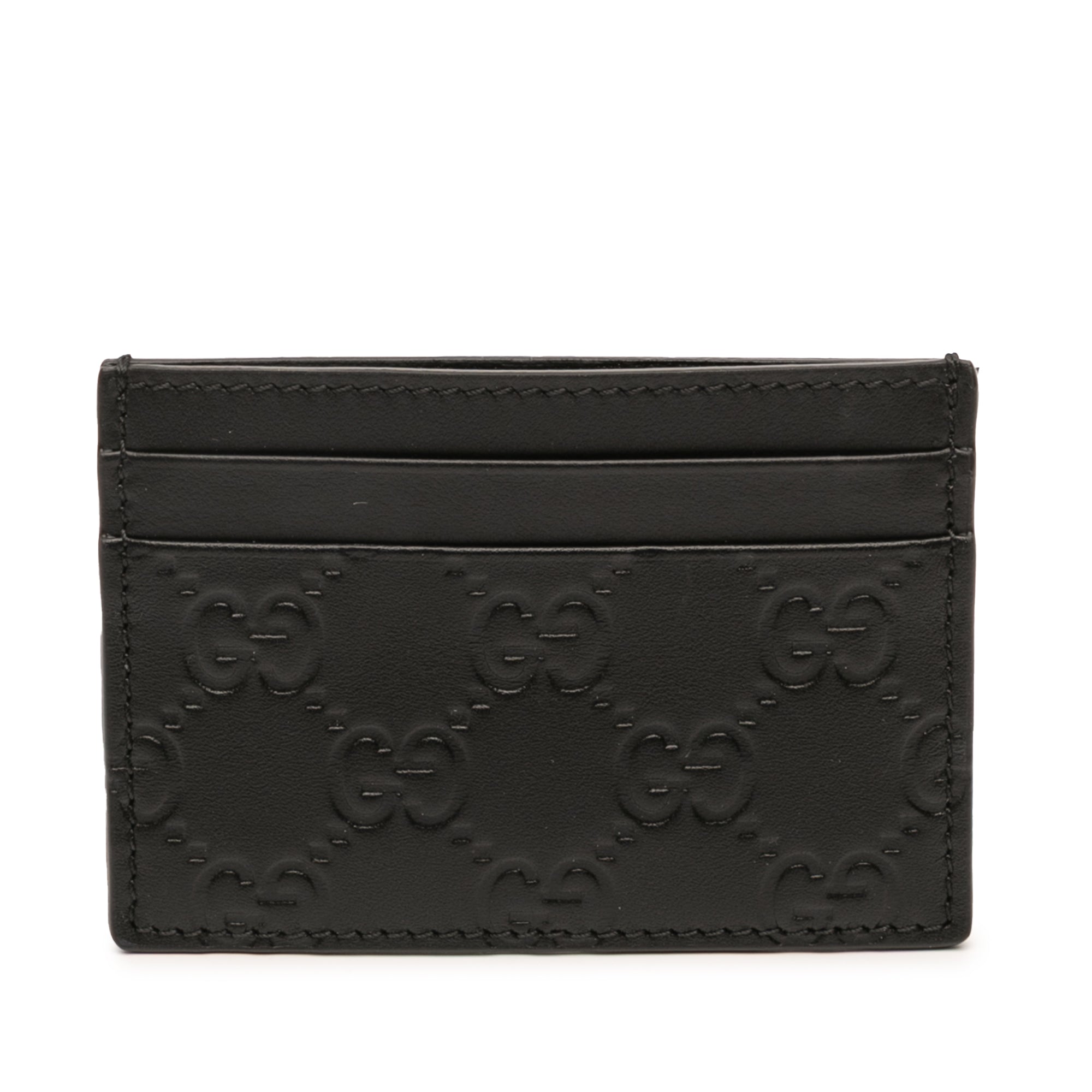 Product Details: Black Gucci Guccissima Card Holder. This card holder features an embossed leather body and slip pockets. 2.8" L x 3.9" W x 0.1" D. Serial number 233166-525040.