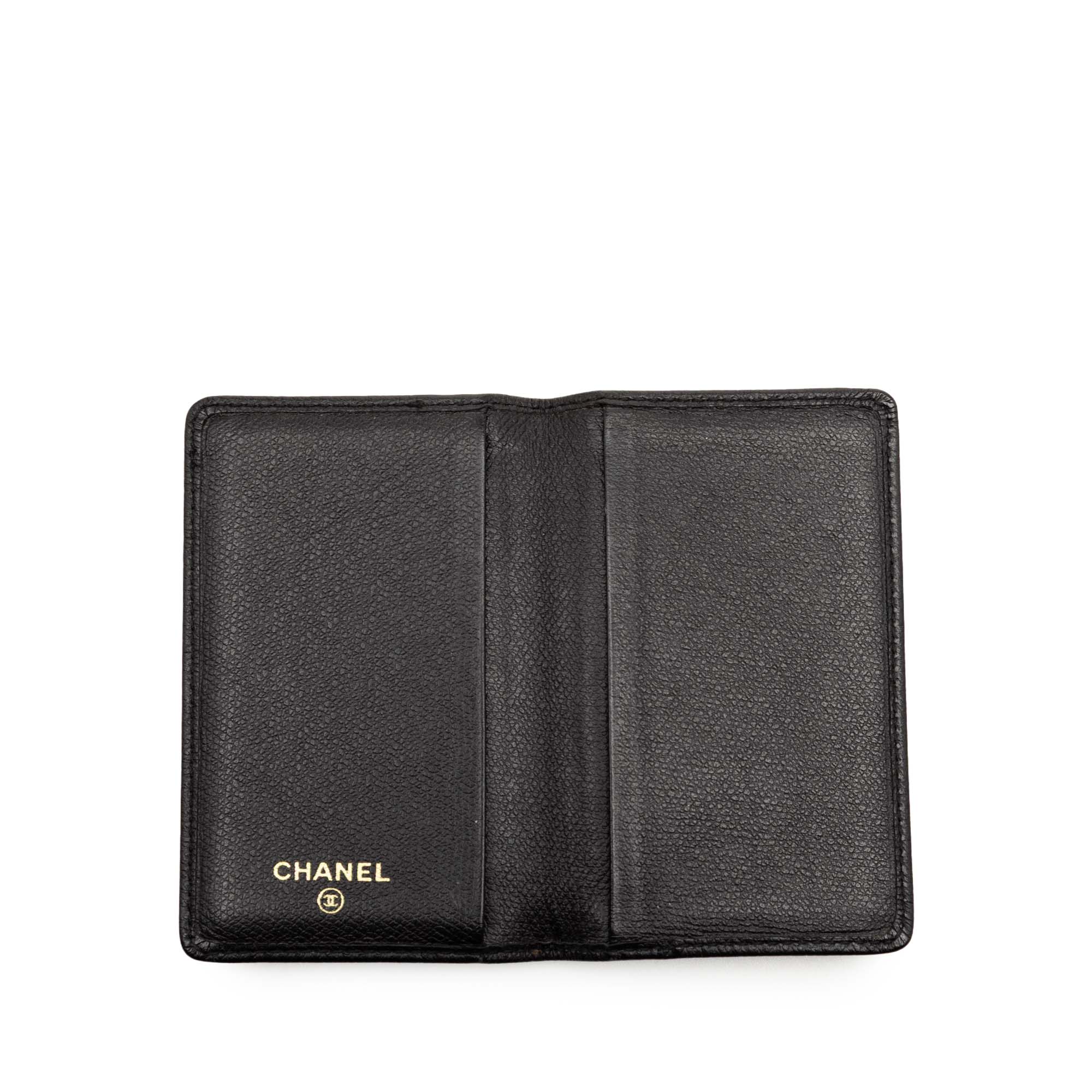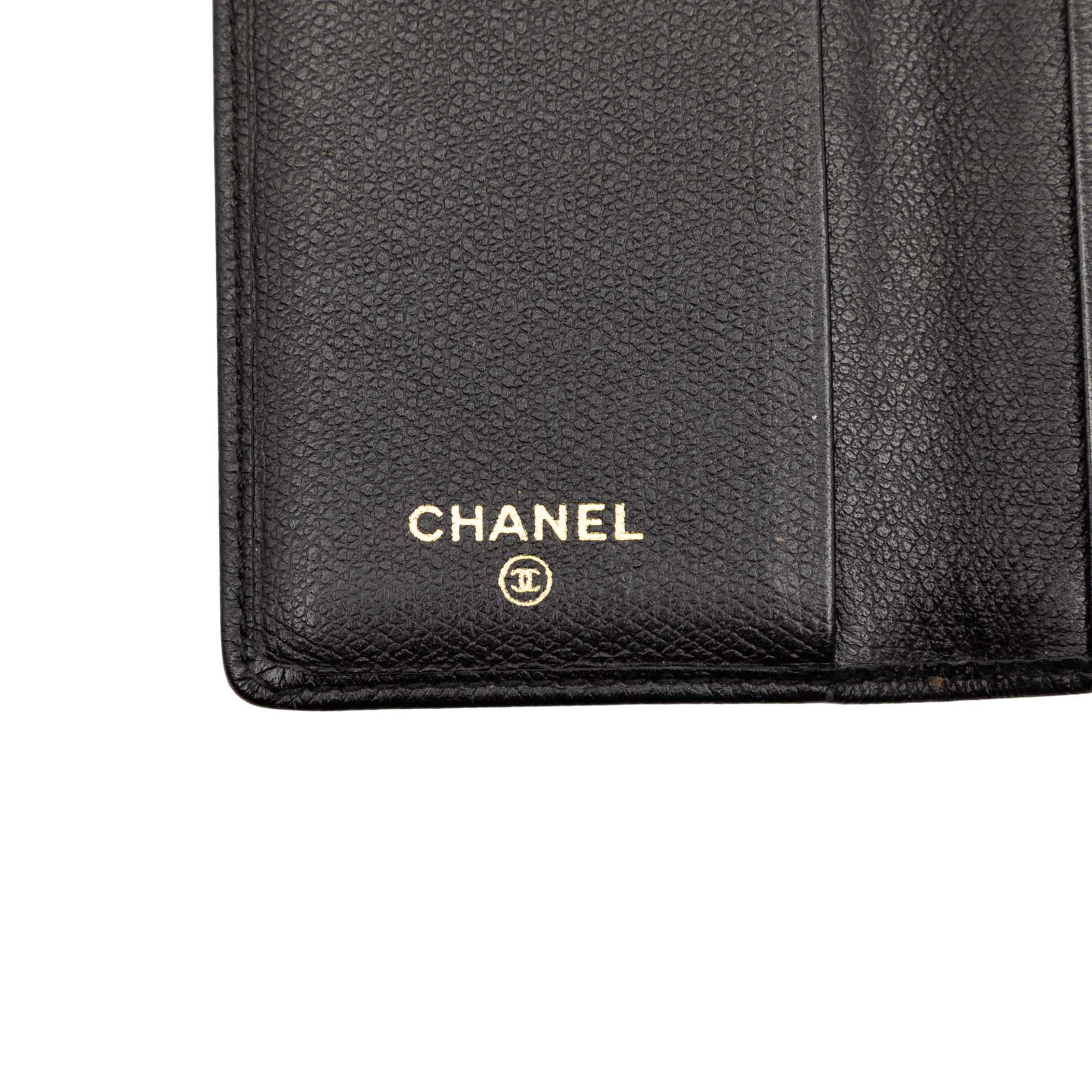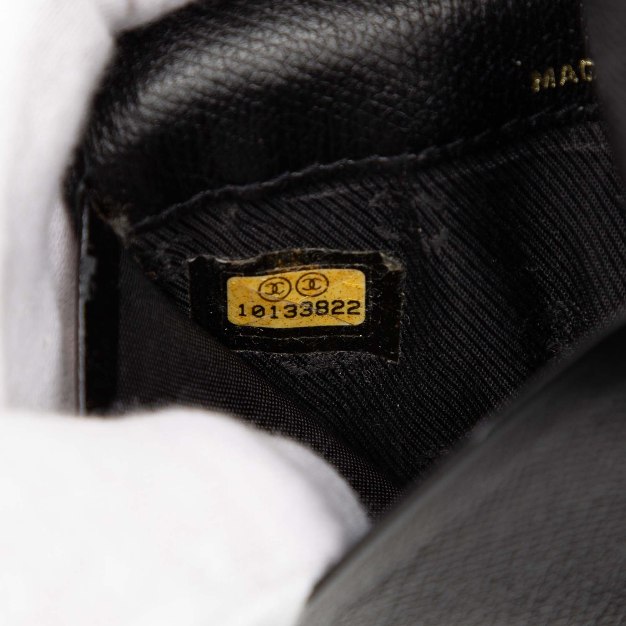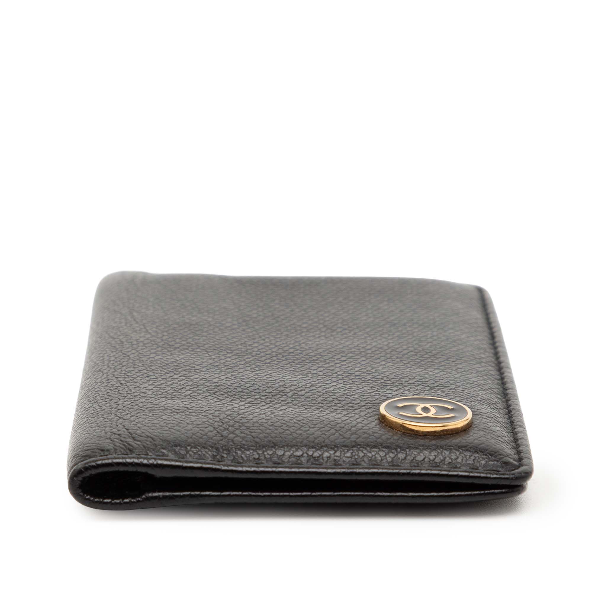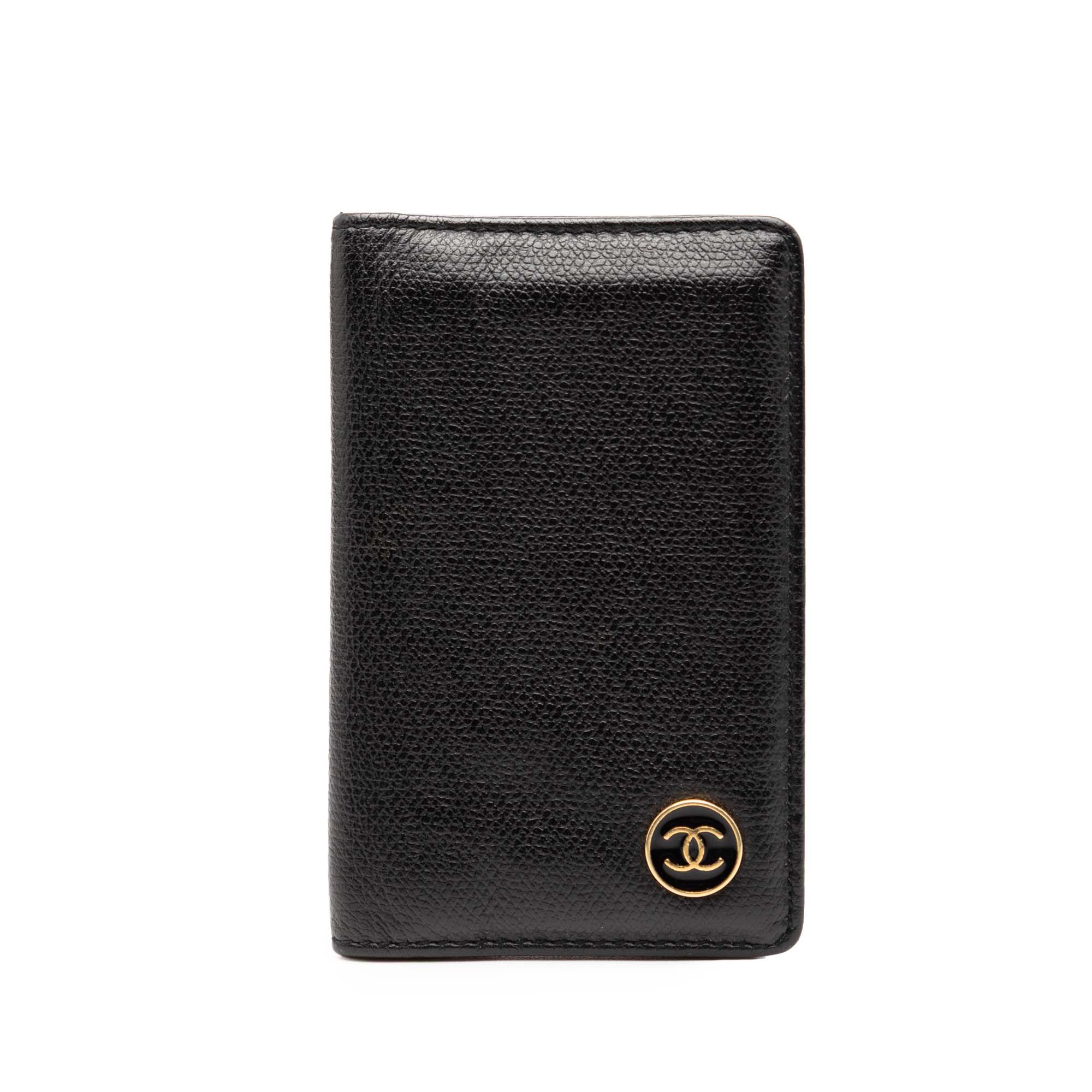 Product Details: Black Chanel Grained Calfskin CC Button Card Case. This card holder features a leather body and interior slip pockets. 4.3" L x 2.8" W x 0.3" D. Serial number 10133822.