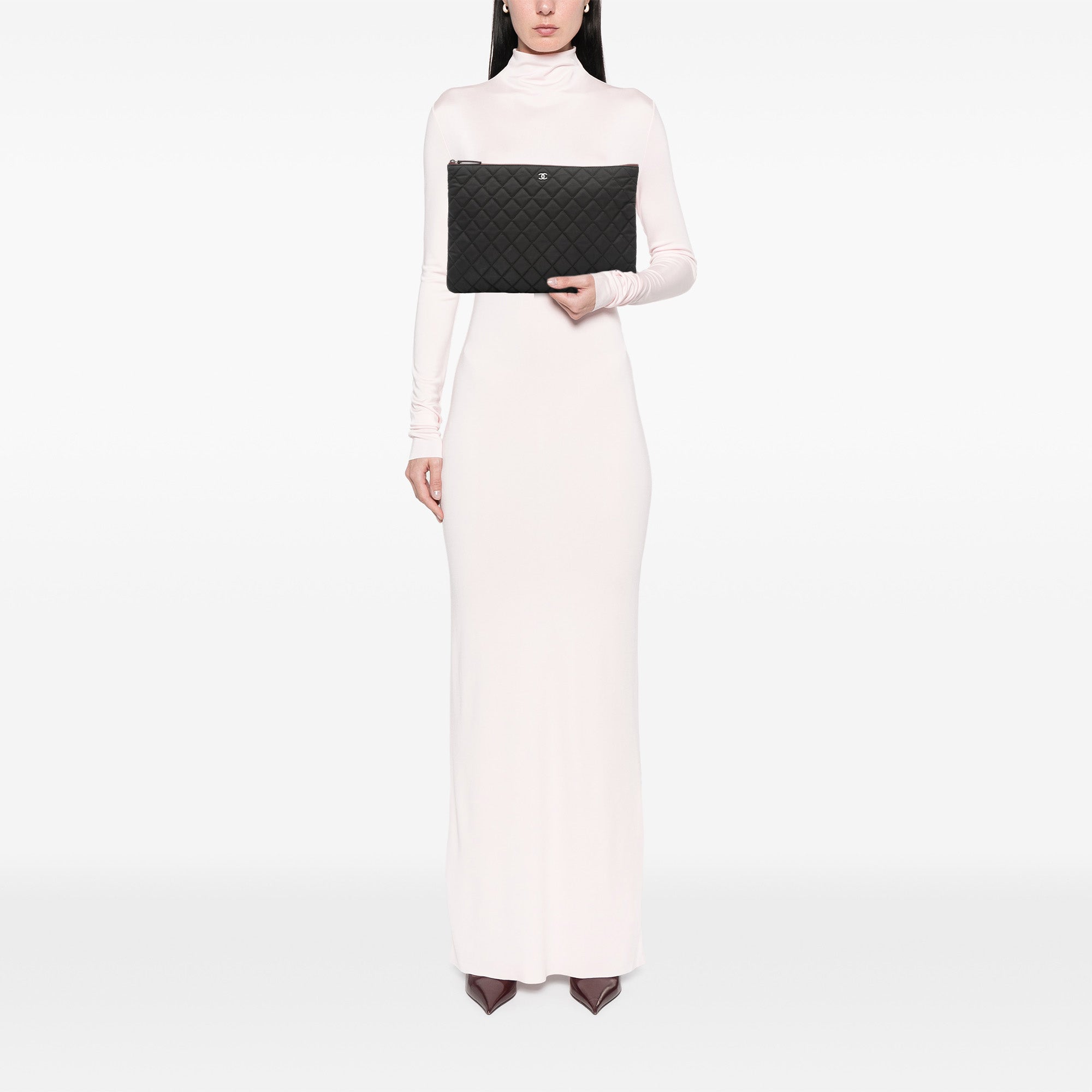 Product Details: Black Chanel Large Quilted Nylon O Case Clutch. This clutch bag features a quilted nylon body and a top zip closure. 9.6" L x 13.4" W x 0.2" D. Serial number 18518158.