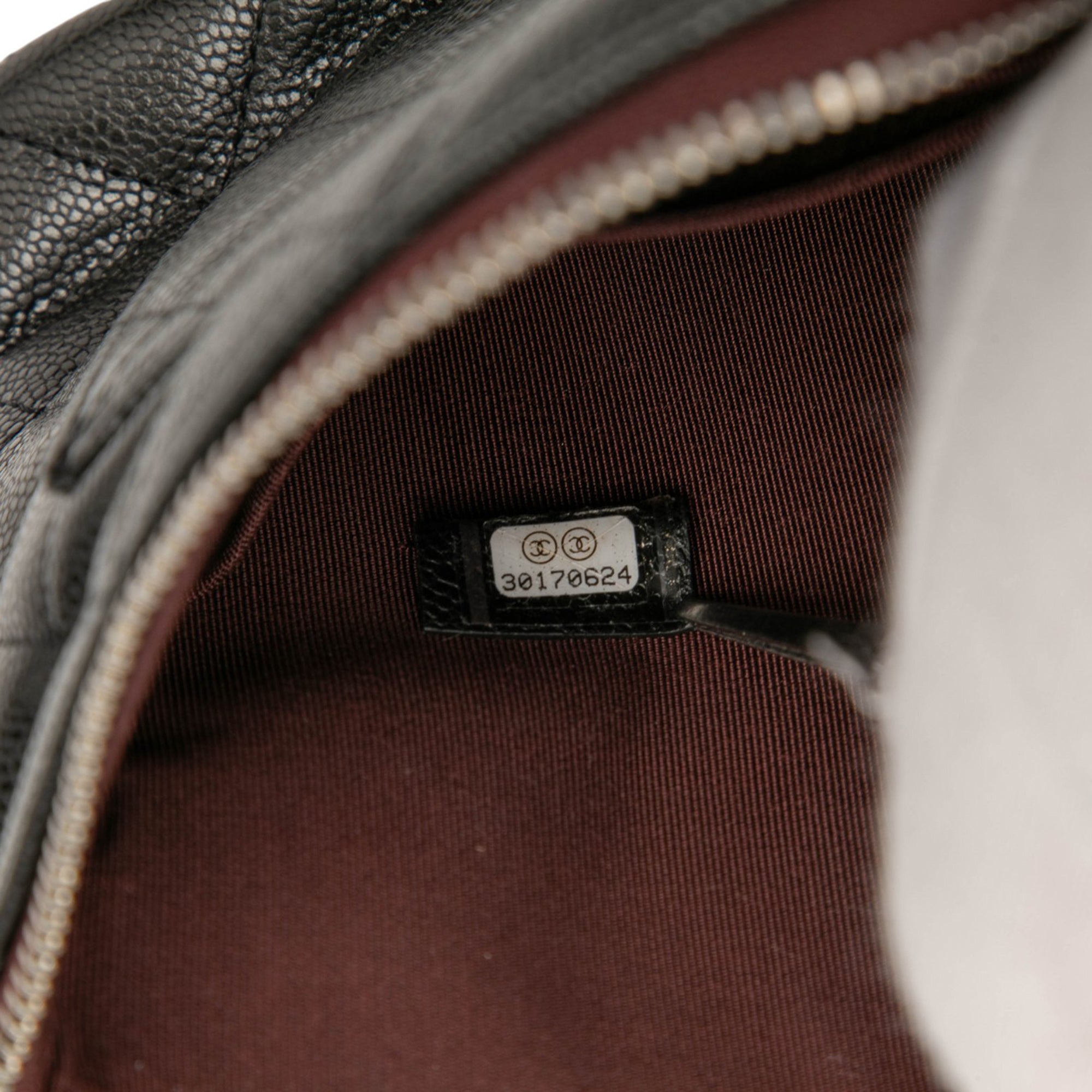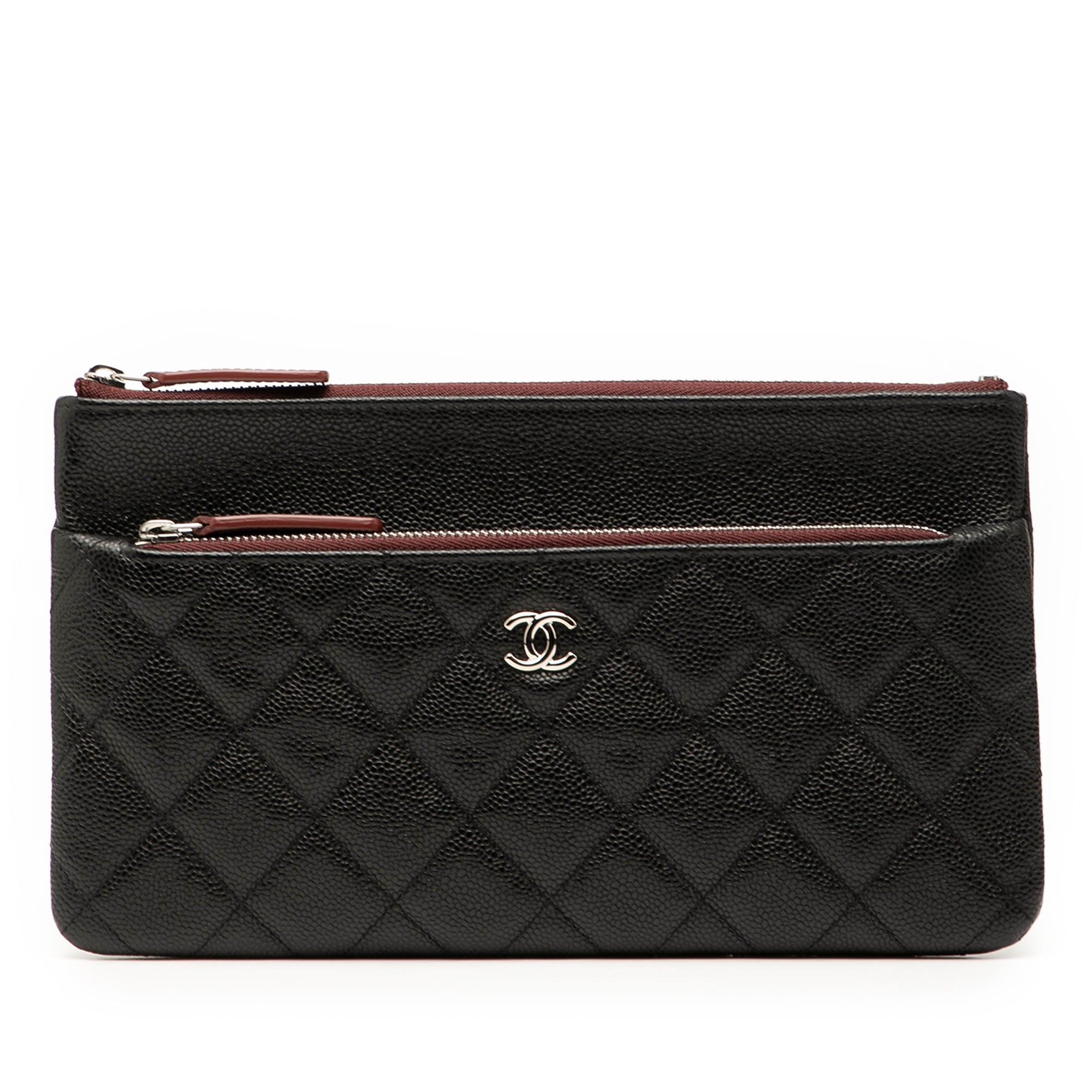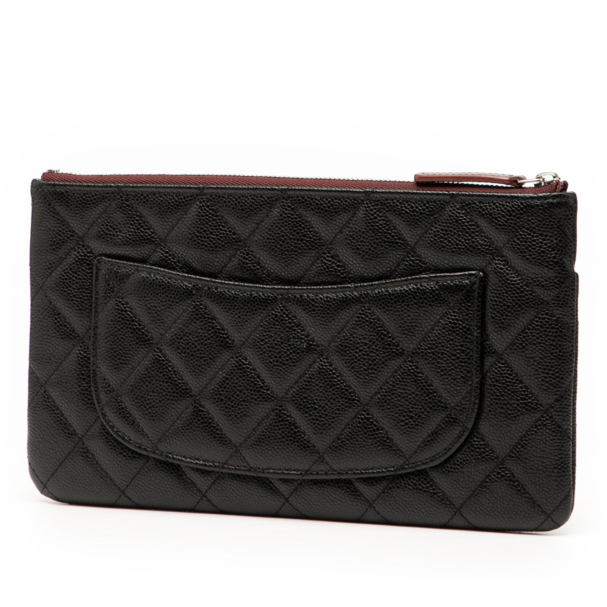 Product Details: Black Chanel Quilted Caviar Double Zip Cosmetic Case Clutch Bag. This clutch bag features a quilted caviar leather body, a top zip closure, exterior zip and slip pockets, and interior slip pockets. 5.3" L x 9.3" W x 0.6" D. Serial number 30170624.