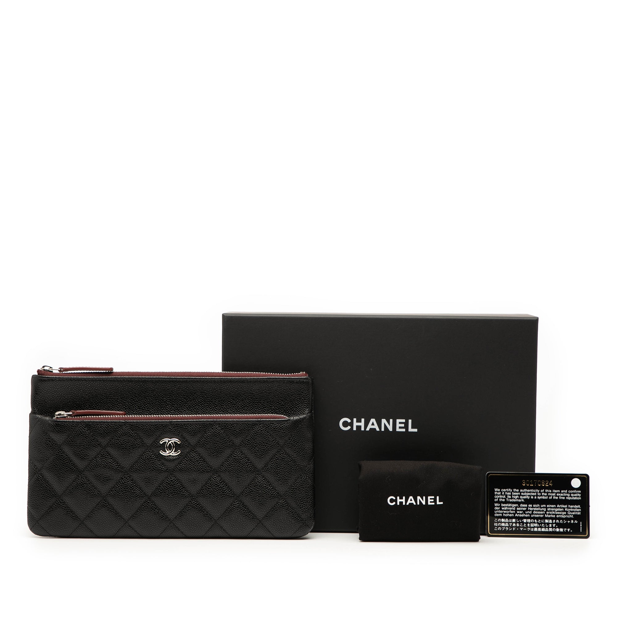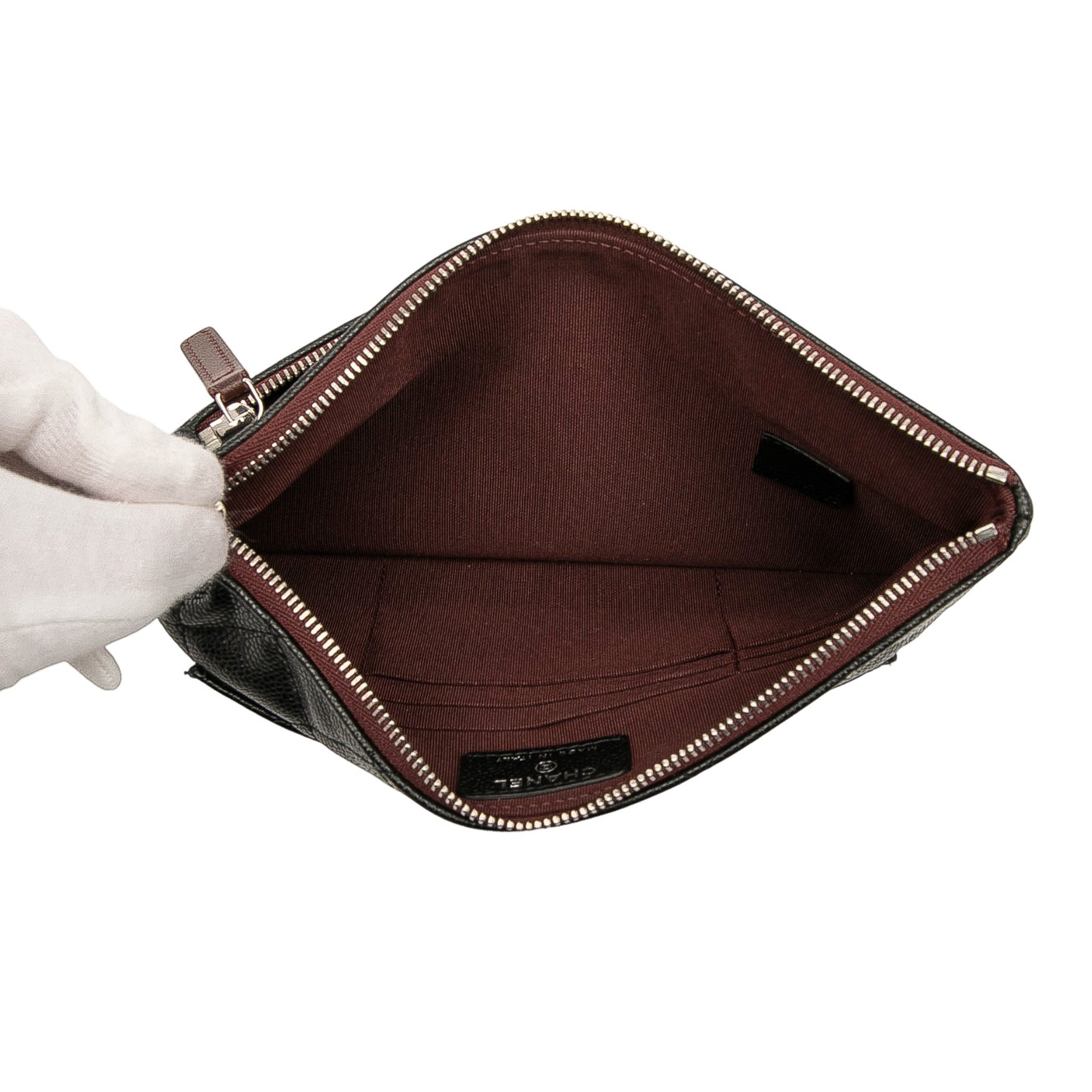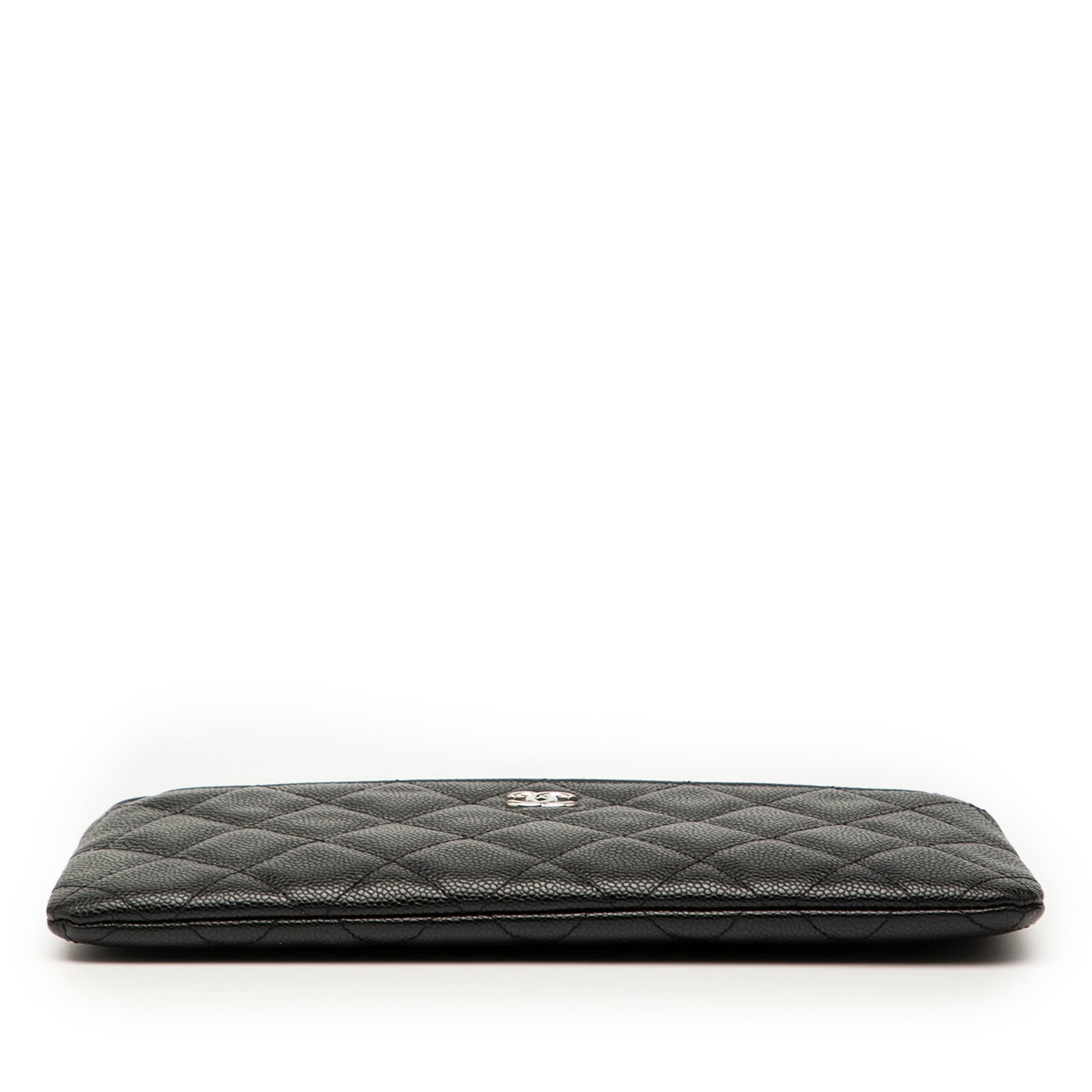 Product Details: Black Chanel Quilted Caviar Double Zip Cosmetic Case Clutch Bag. This clutch bag features a quilted caviar leather body, a top zip closure, exterior zip and slip pockets, and interior slip pockets. 5.3" L x 9.3" W x 0.6" D. Serial number 30170624.