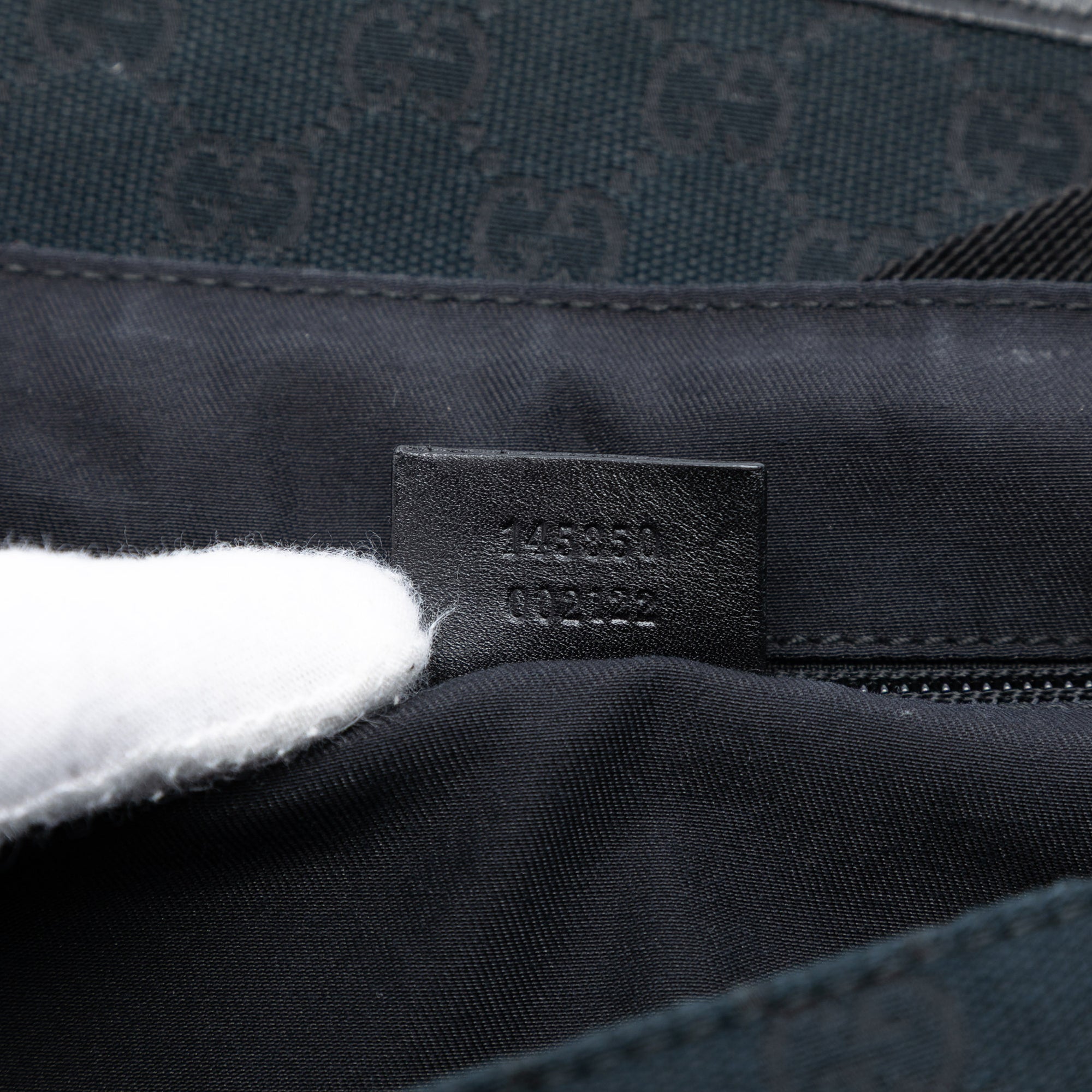 Product Details: Black Gucci GG Canvas Messenger Bag. This crossbody bag features a canvas body with leather trim, an adjustable flat strap, a top flap with touch fastener closure, and interior zip and slip pockets. 12.2" L x 15" W x 3.9" D. Serial number 145850 002122.