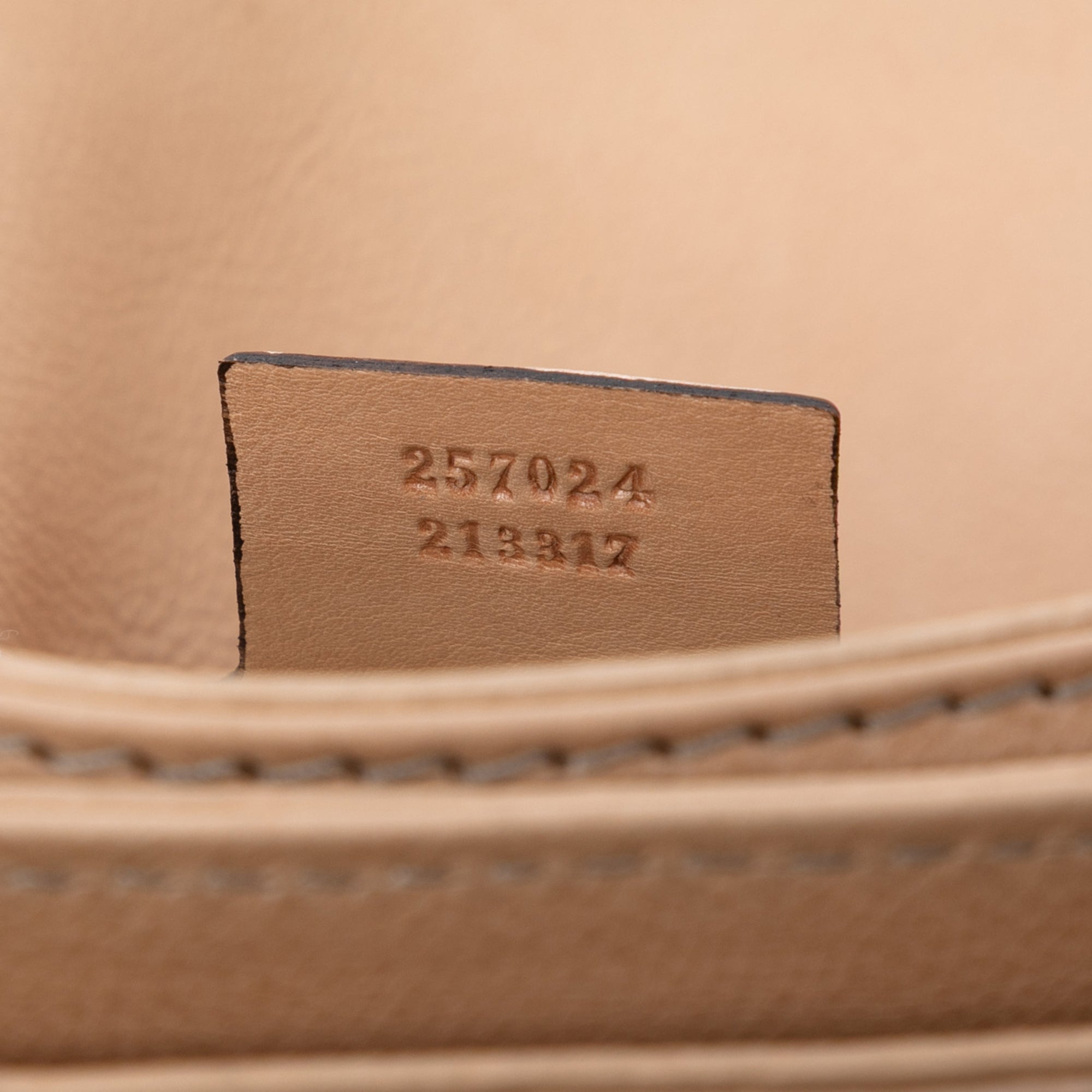 Product Details: Tan Gucci GG Canvas Marrakech Crossbody. This crossbody bag features a canvas body with leather trim, an adjustable flat leather strap, a front flap with hook closure, and interior zip and slip pockets. 7.9" L x 11" W x 5.1" D. Serial number 257024 213317.