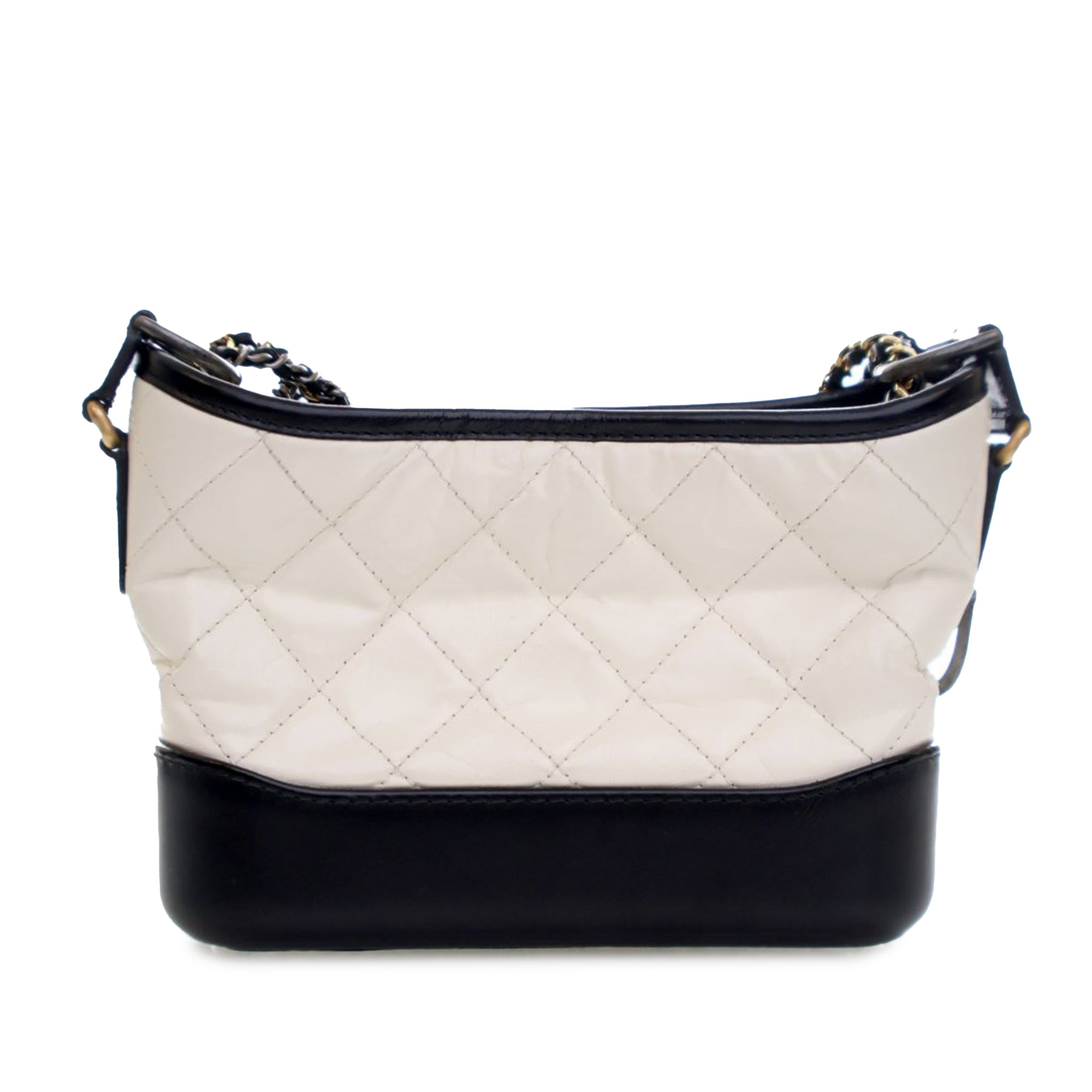 Product Details: White Chanel Small Bicolor Aged Calfskin Gabrielle Crossbody. The Gabrielle features a quilted leather body, leather woven chain link strap with adjustable leather guard, a top zip closure, and interior zip and slip pockets. 5.9" L x 7.5" W x 3" D.